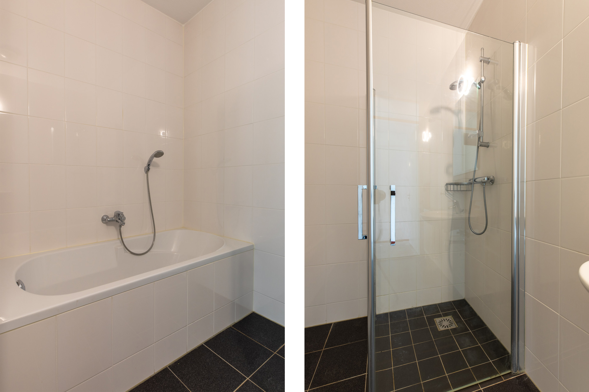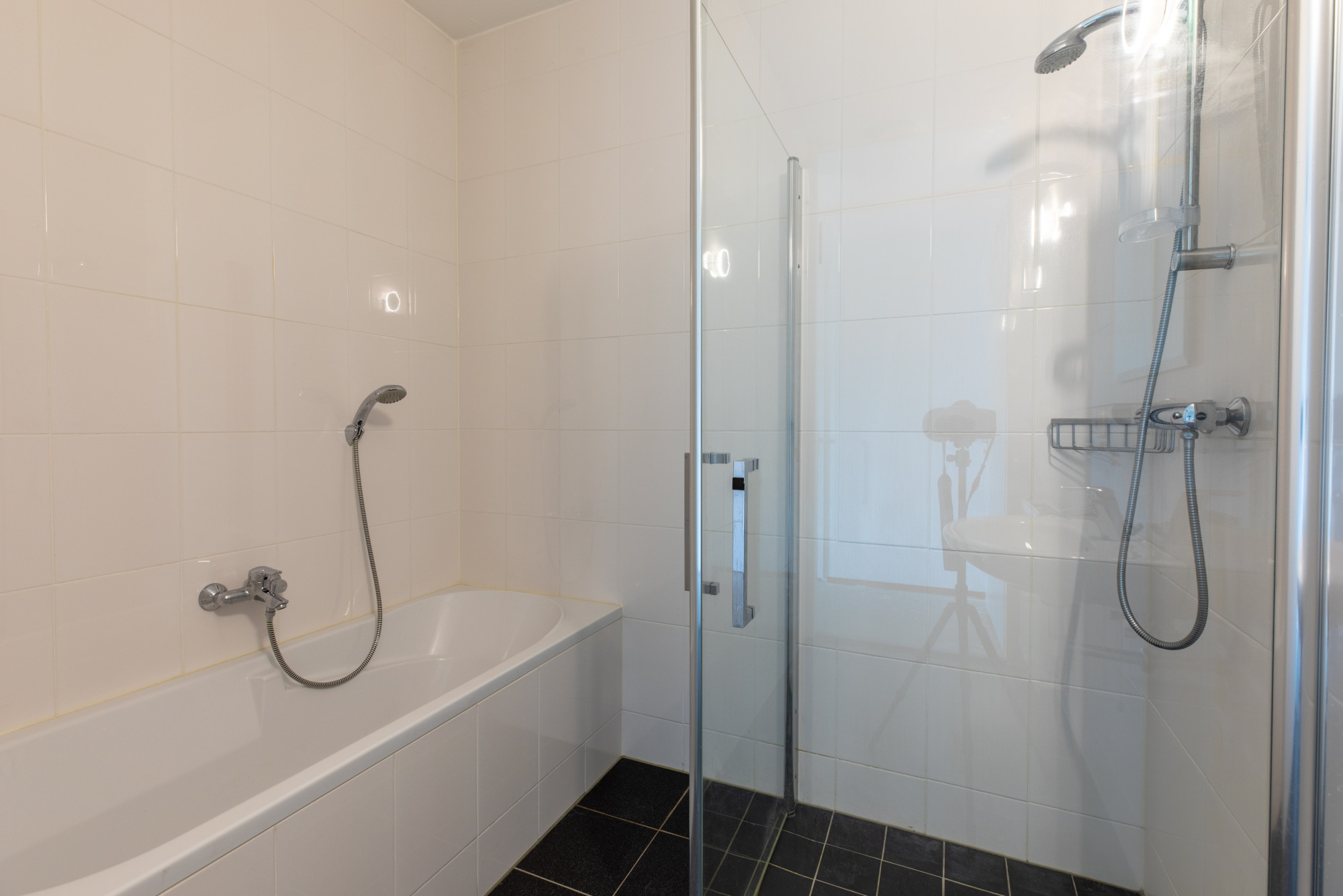 - Badkamer voorzien van ligbad, douche en wastafel, met witte wandtegels tot aan het plafond en antraciet vloertegels.