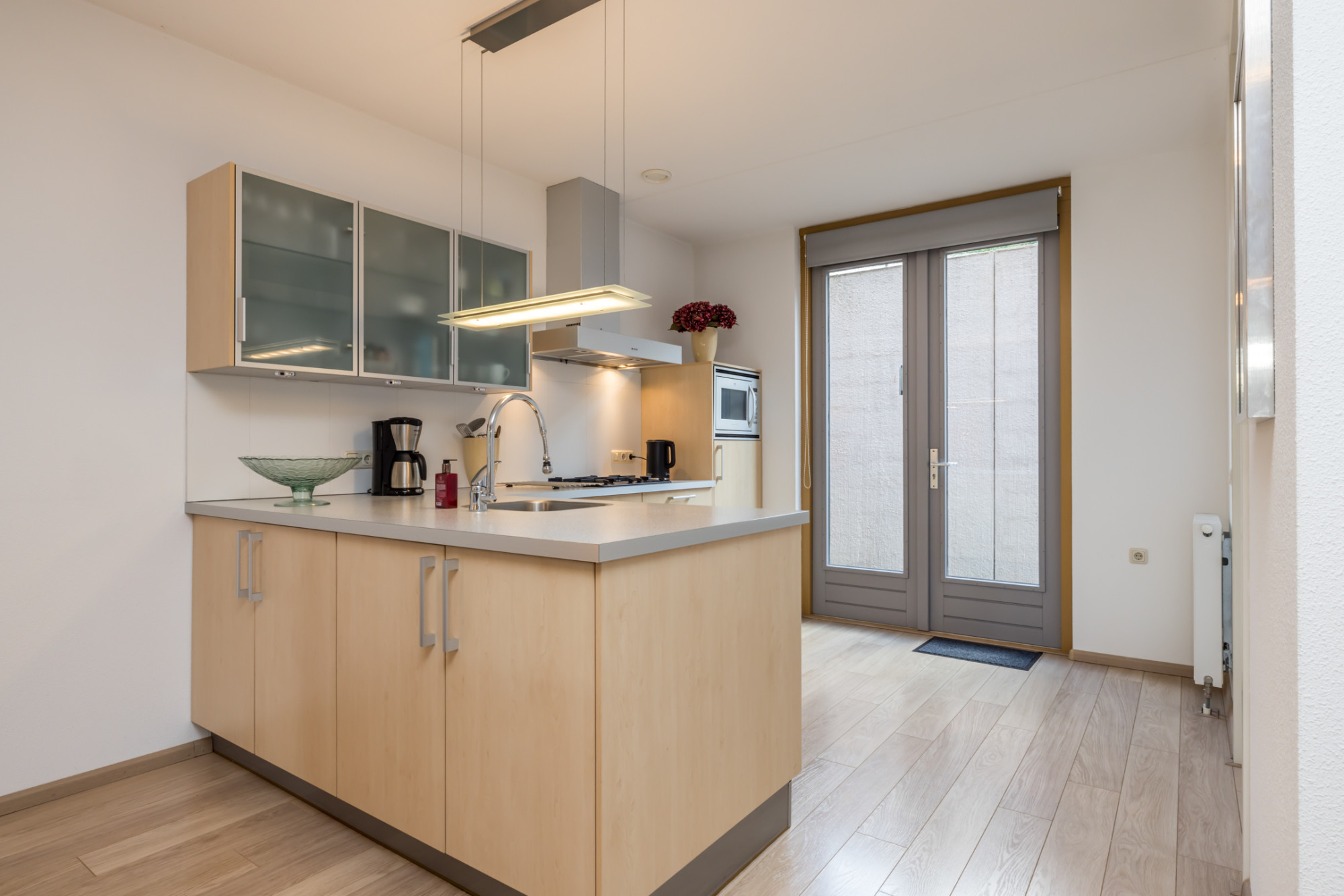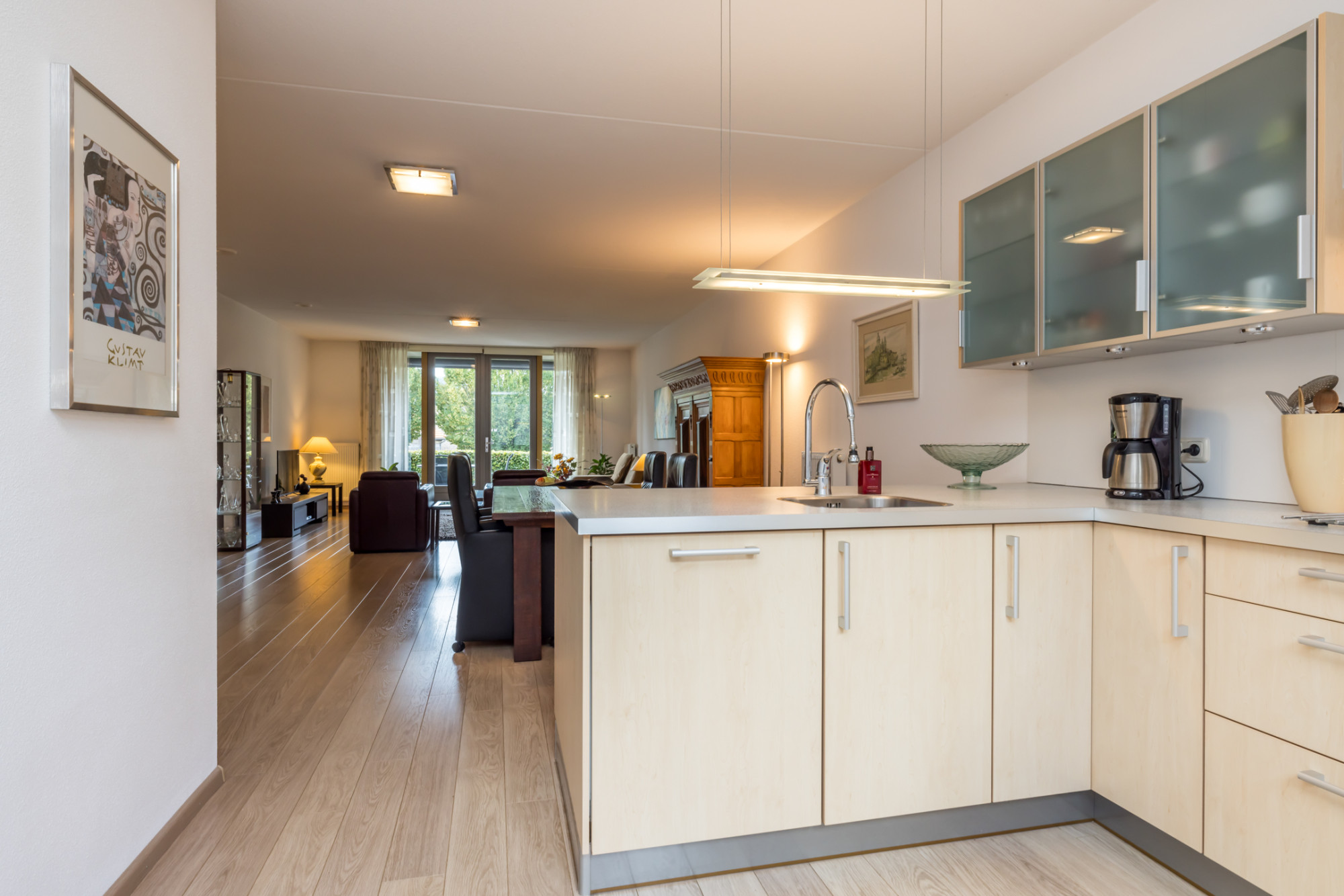 - open keuken 3.30x3.05 voorzien van keukenopstelling met gaskookplaat, recirculatie afzuigkap, combi-magnetron, koelkast en vaatwasser