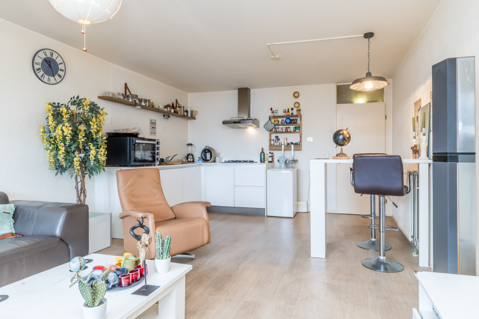 • woonkamer met keukenopstelling voorzien van gaskookplaat, koelkast en afzuigkap.