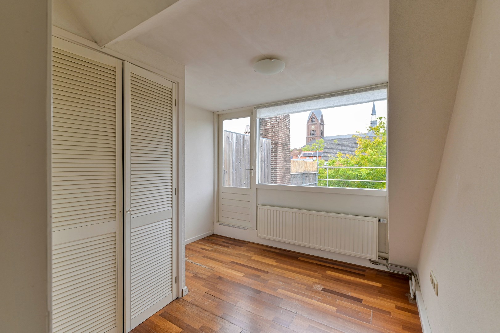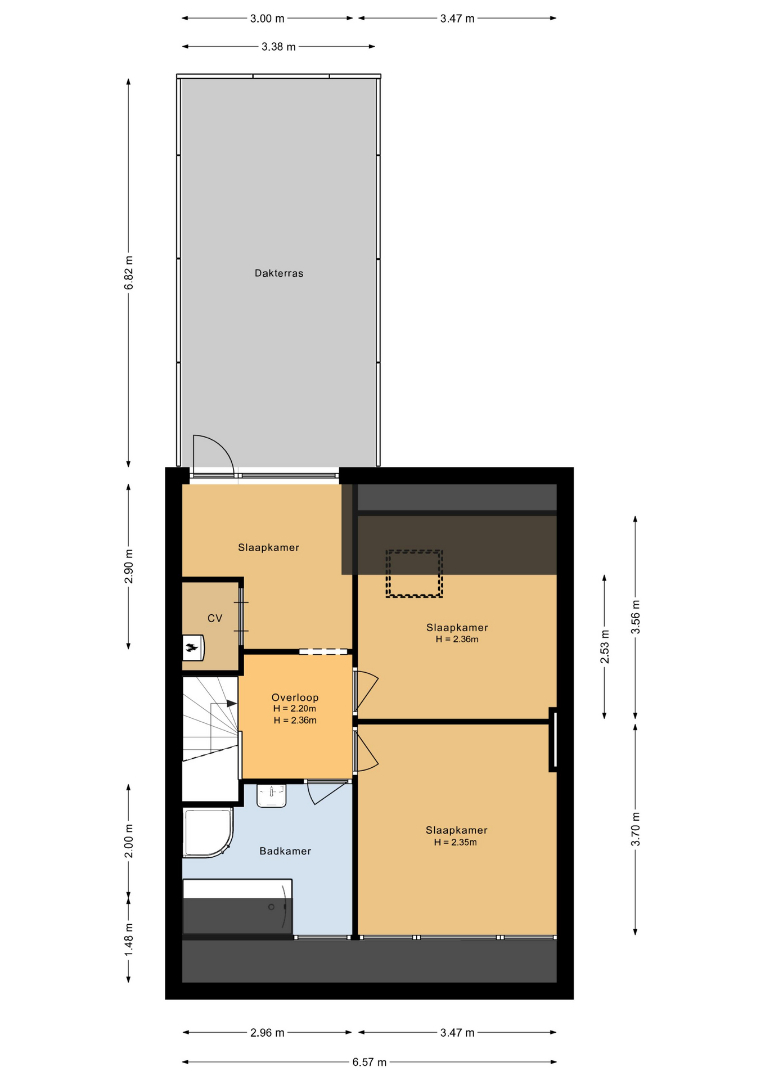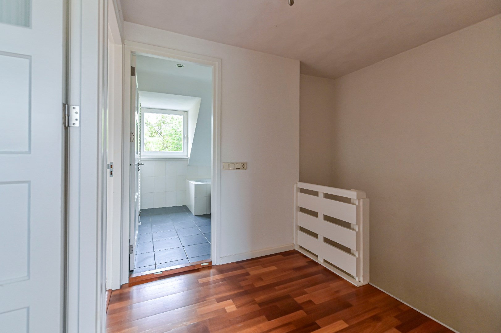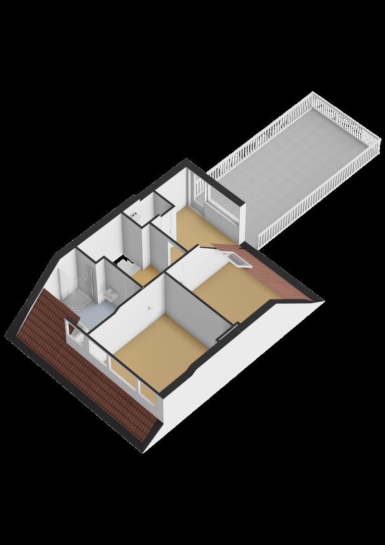 Overloop met parketvloer en aangrenzend twee slaapkamers, badkamer en de technische ruimte. Beide slaapkamers zijn voorzien van parketvloer, waarvan 1 slaapkamer beschikt over een dakkapel en de andere slaapkamer beschikt over een Velux dakraam. De nette badkamer (2004) is voorzien van: ligbad, aparte douche, wastafel en designradiator. In de technische ruimte bevindt zich de recent geplaatste C.V.-ketel (HR Intergas uit 2022) en witgoedaansluiting. Aangrenzend aan deze technische ruime bevindt zich het ruime dakterras met drainagetegels en nieuwe afrastering.