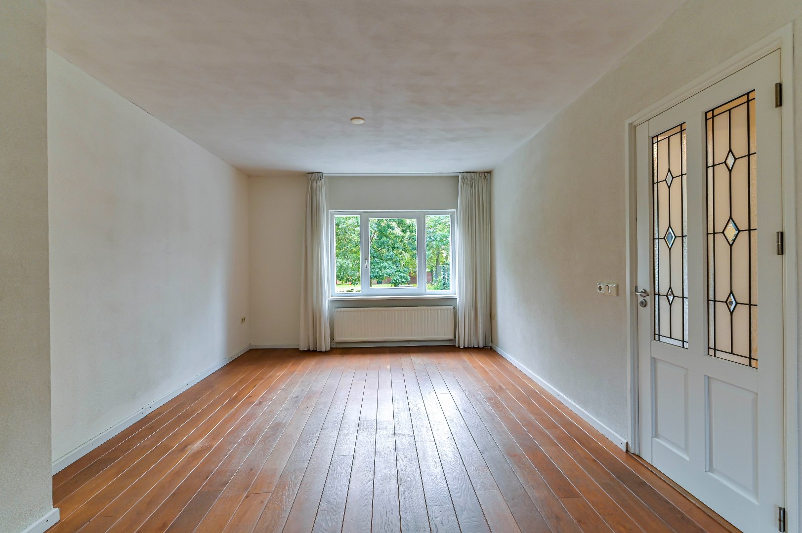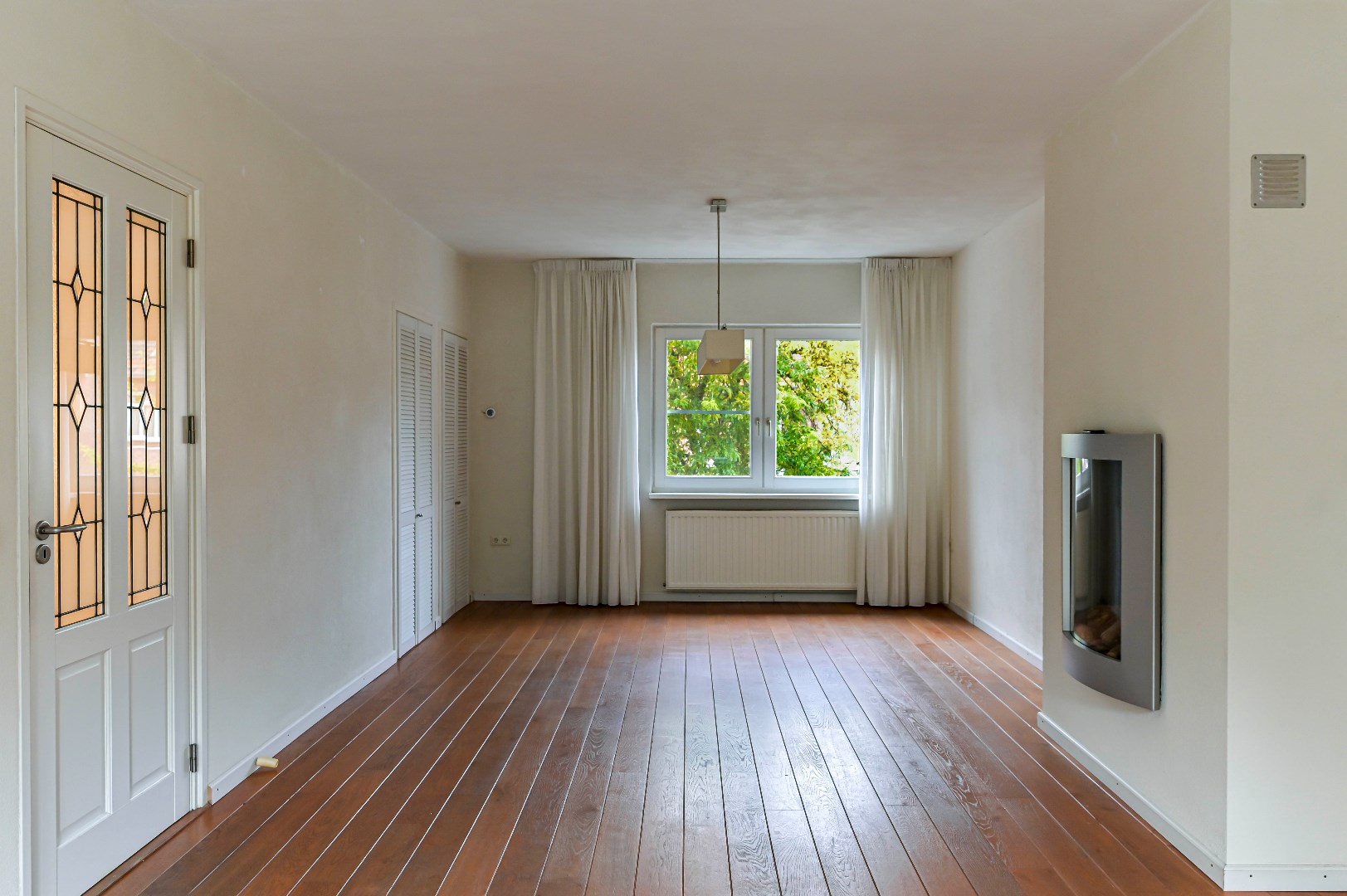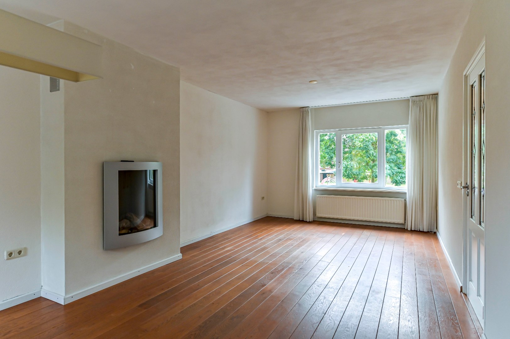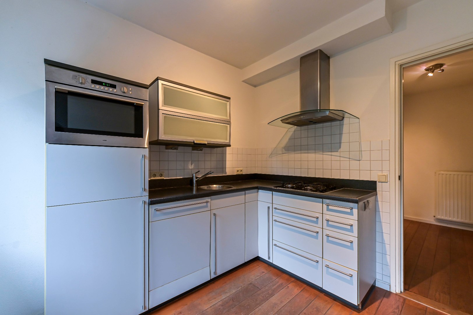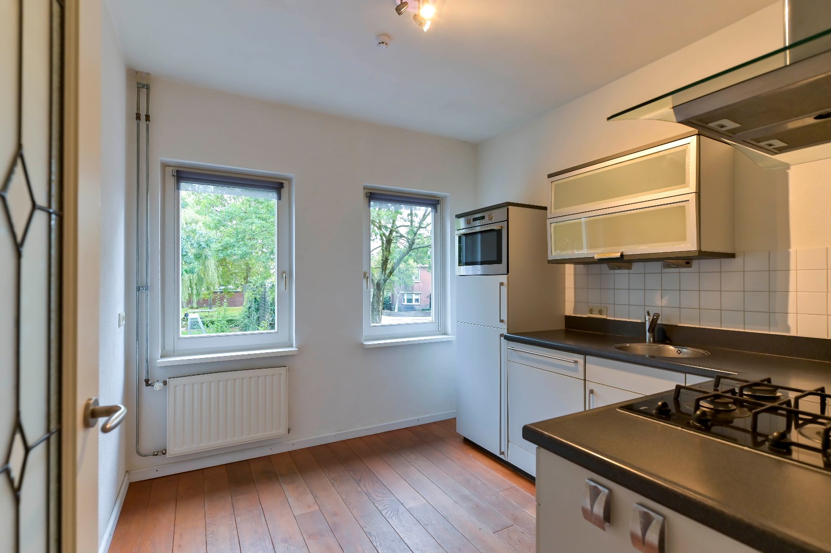 Overloop met massieve eikenhouten vloer. Zwevend toilet (2004). Woonkamer is voorzien van een massieve eikenhouten vloer, gashaard, dubbele muurkast en spachtelputz wanden. De aparte keuken (2004) beschikt over een spoelbak en inbouwapparatuur zoals: nieuwe koelkast met diepvriesvak (2024), 4-pits gaskookplaat, afzuigkap, combimagnetron (2017) en vaatwasser (2023).