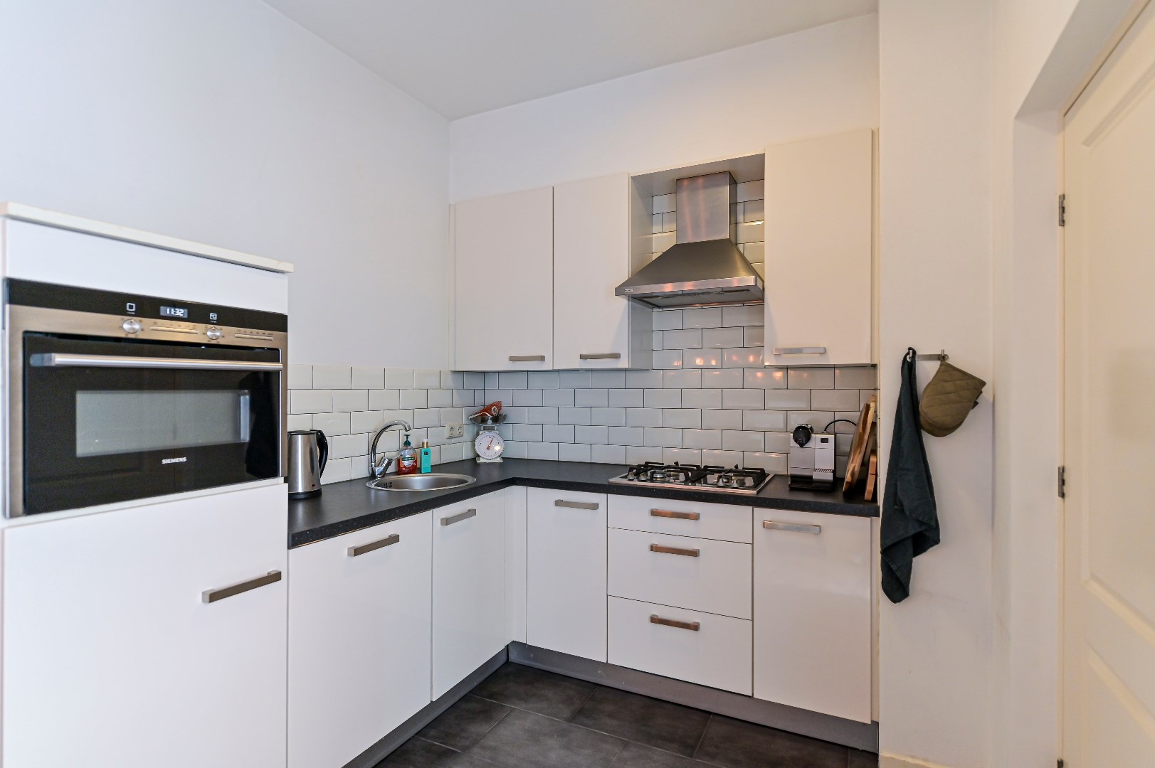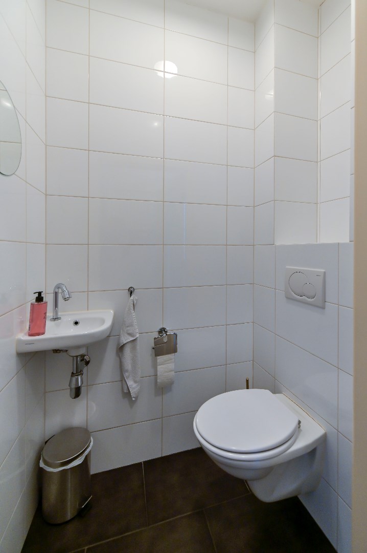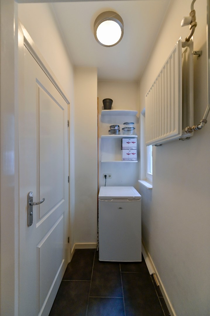 Zwevend toilet met fonteintje (2010). De woonkamer is voorzien van stukwerk wanden, laminaatvloer en aangrenzend terras. De open keuken (2010) met spoelbak en inbouwapparatuur zoals: koelkast, 4-pits gas-kookplaat, afzuigkap, combimagnetron en vaatwasser. In de bijkeuken is een aansluiting voor een vriezer aanwezig.