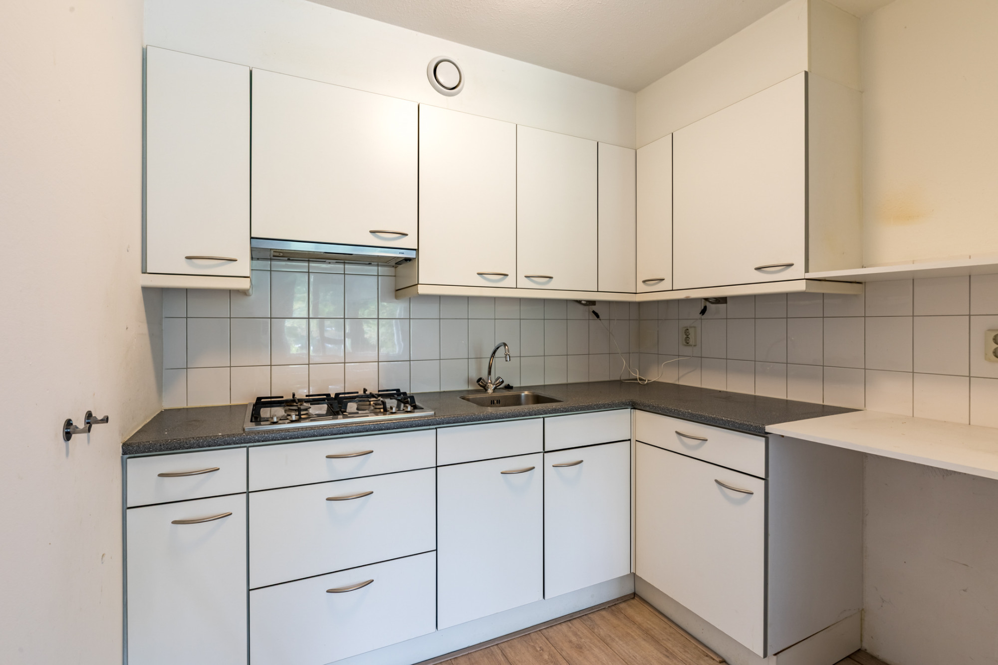 De halfopen keuken is gesitueerd aan de voorzijde van de woning en is voorzien van een functionele opstelling met voldoende kastruimte en aansluitingen voor diverse inbouwapparatuur. De woning beschikt over een nette laminaatvloer en is goed onderhouden, waardoor deze zonder veel aanpassingen direct te betrekken is. Daarnaast is het appartement volledig voorzien van dubbele beglazing.