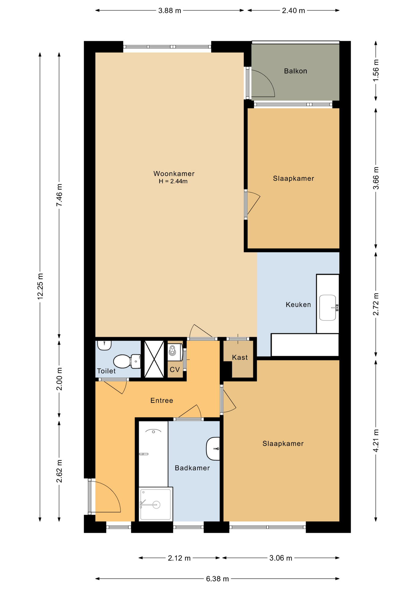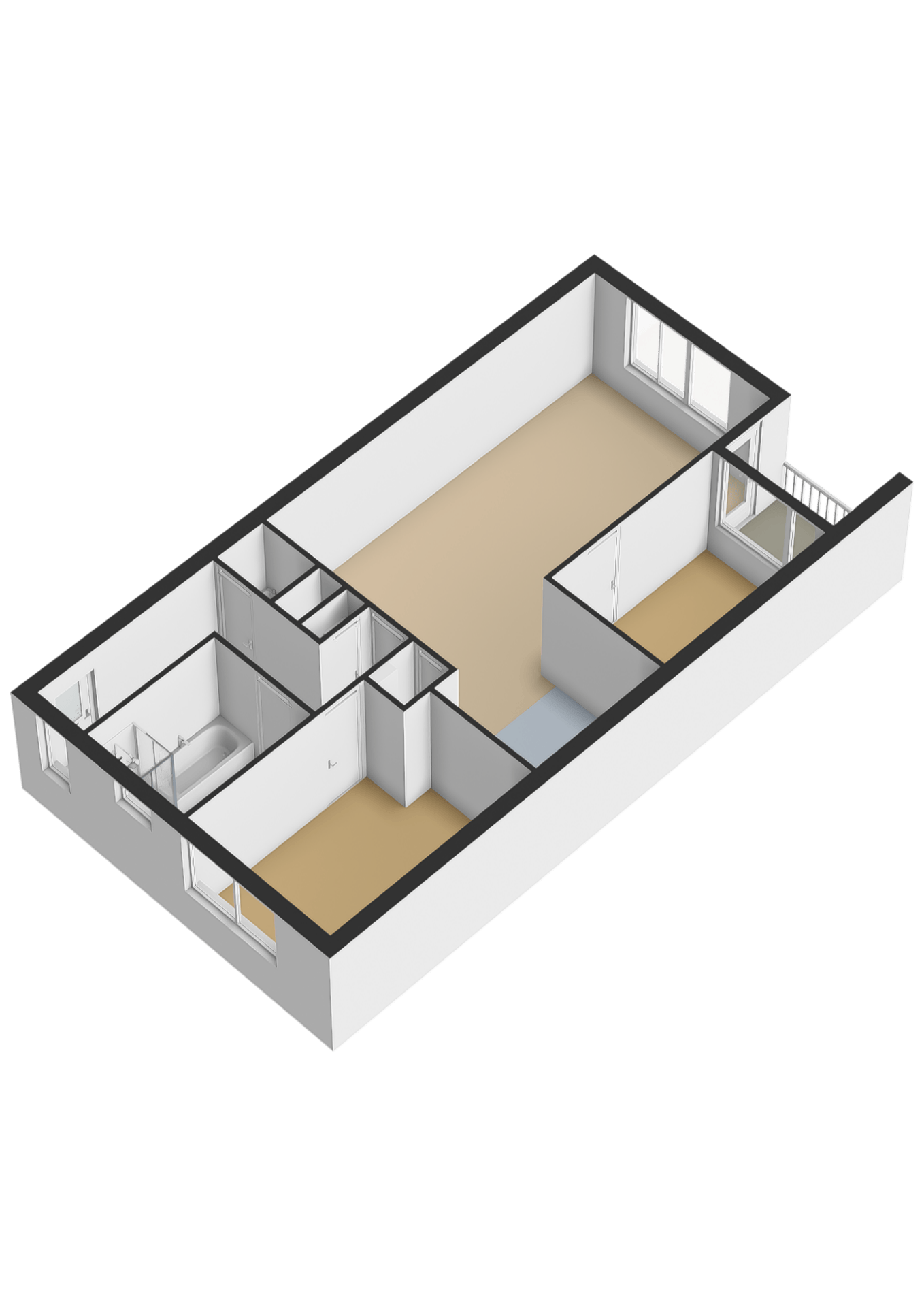 Entree met hal, garderoberuimte en separaat toilet met fonteintje. De badkamer is voorzien van ligbad, douche, wastafel en witgoedaansluiting. Lichte woonkamer met open keuken (samen ca. 29 m²) aan de straatzijde, met ruimte voor een zit- en eethoek. Vanuit de woonkamer is er toegang tot het balkon (ca. 4 m²) op het oosten. Twee slaapkamers, waarvan de hoofdslaapkamer aan de rustige achterzijde ligt.