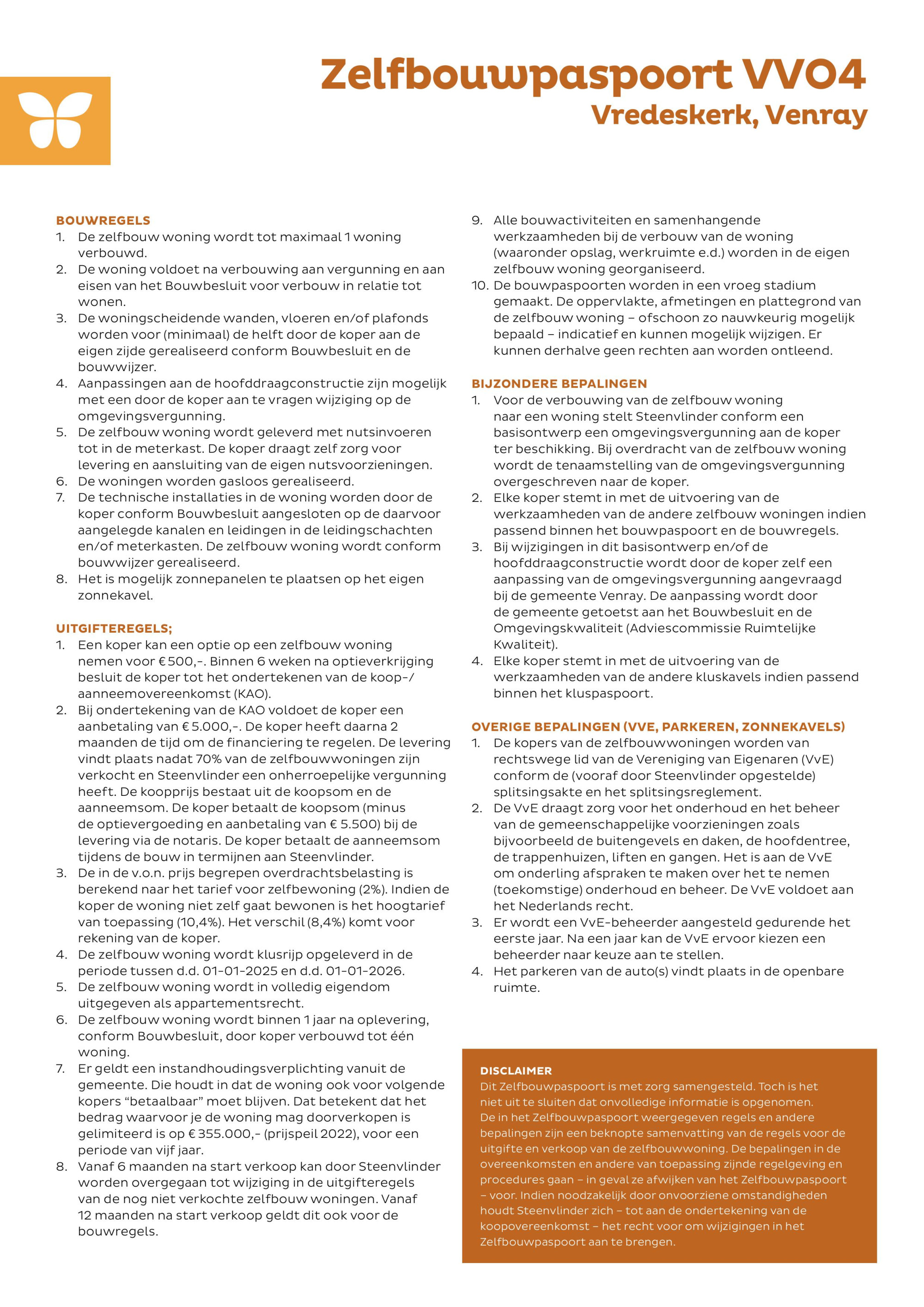 8. Vanaf 6 maanden na start verkoop kan door Steenvlinder worden overgegaan tot wijziging in de uitgifteregels van de nog niet verkochte zelfbouw woningen. Vanaf 12 maanden na start verkoop geldt dit ook voor de bouwregels.