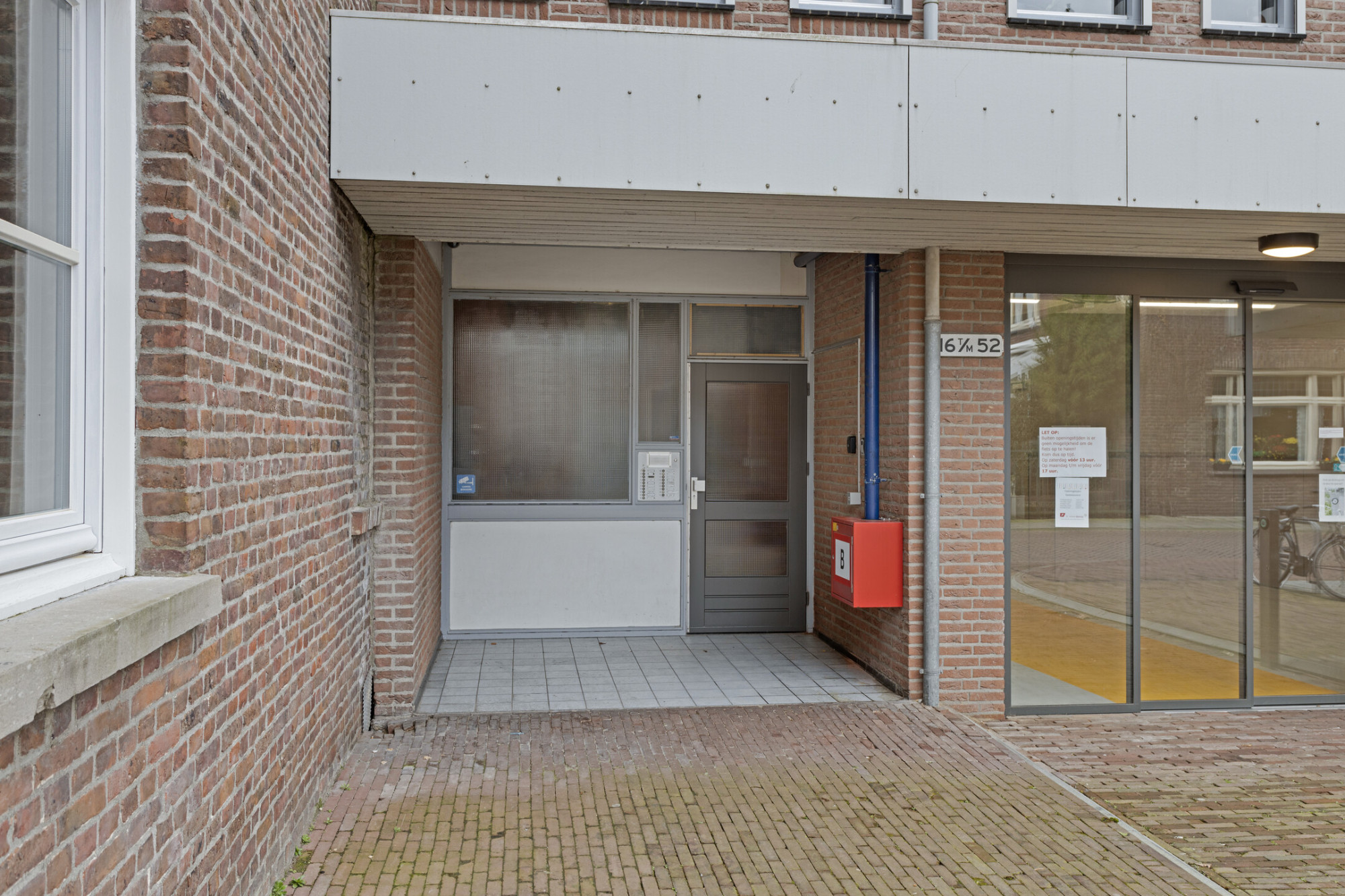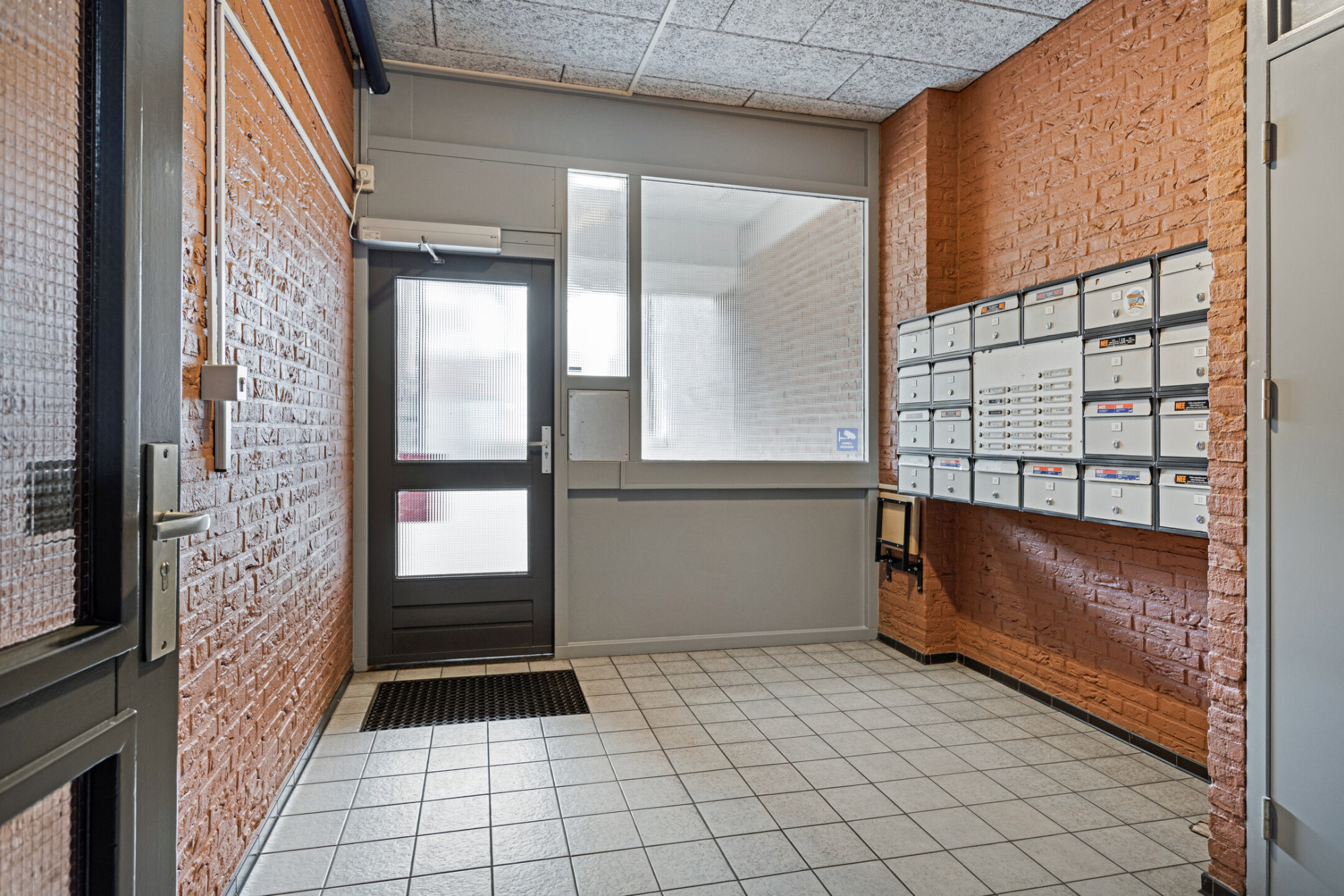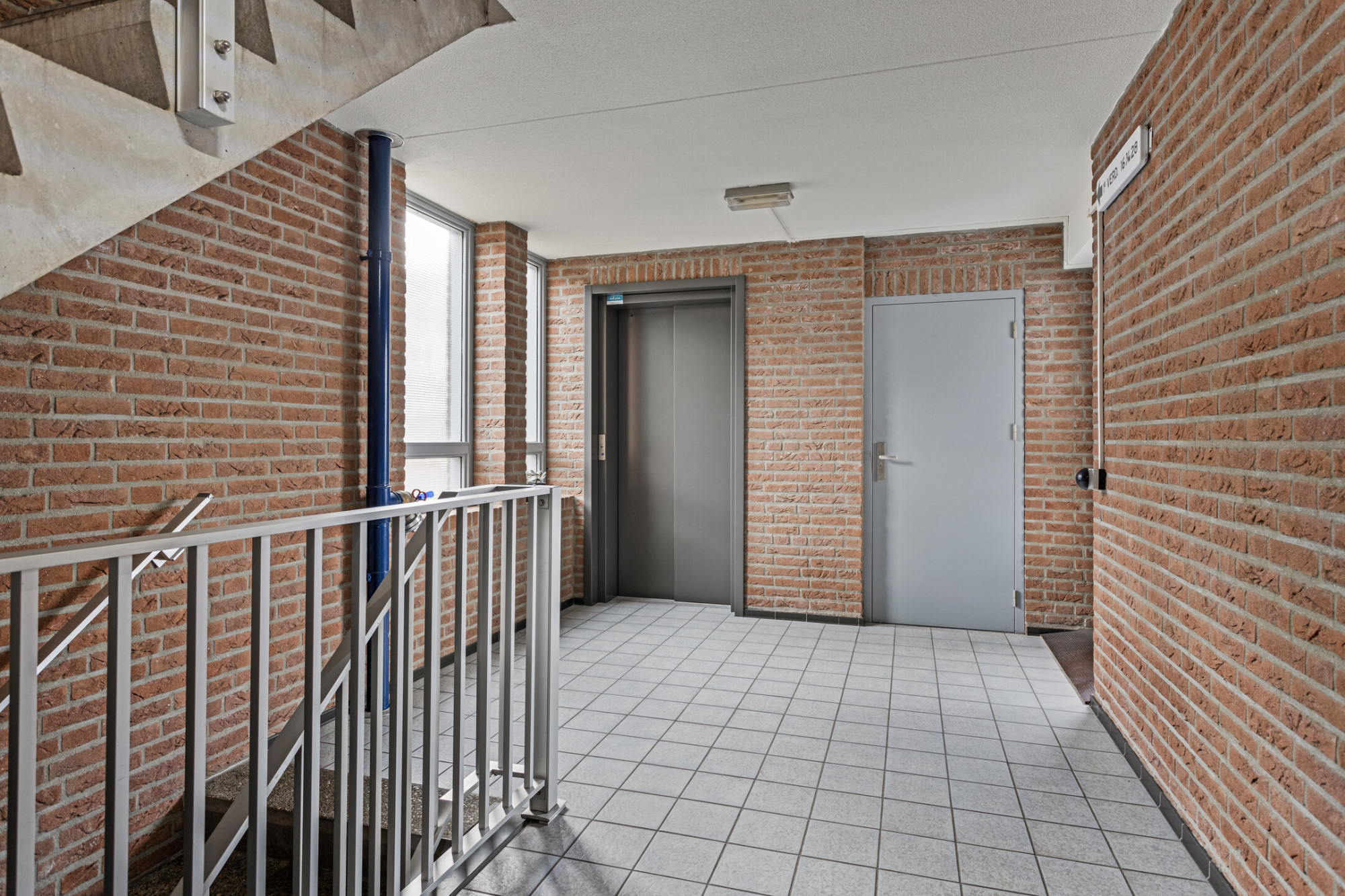 Centrale ingang met bellentableau, brievenbussen, liftinstallatie en trappenhal.