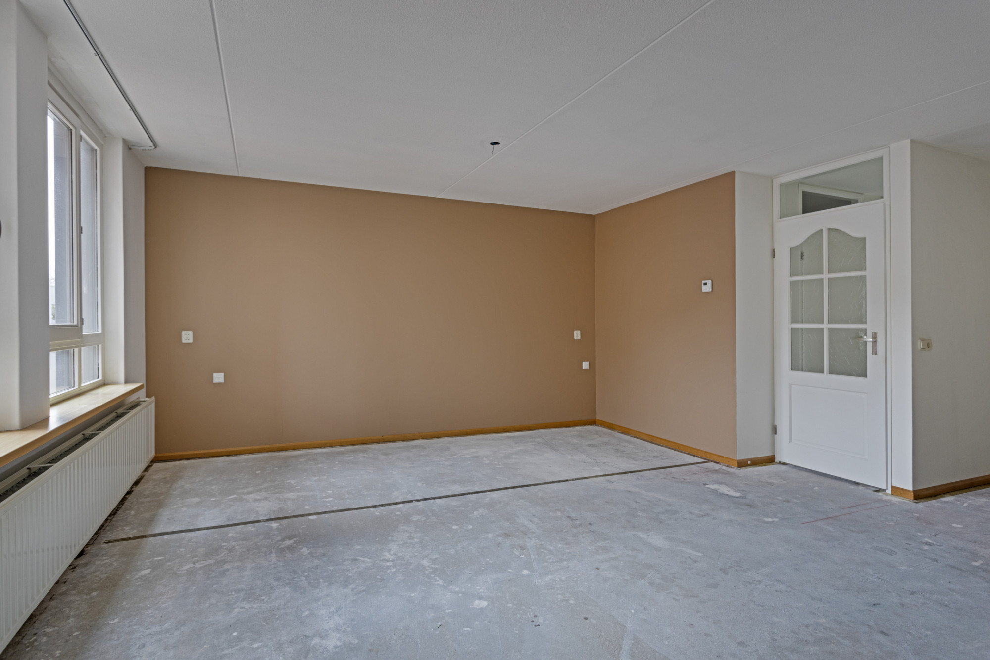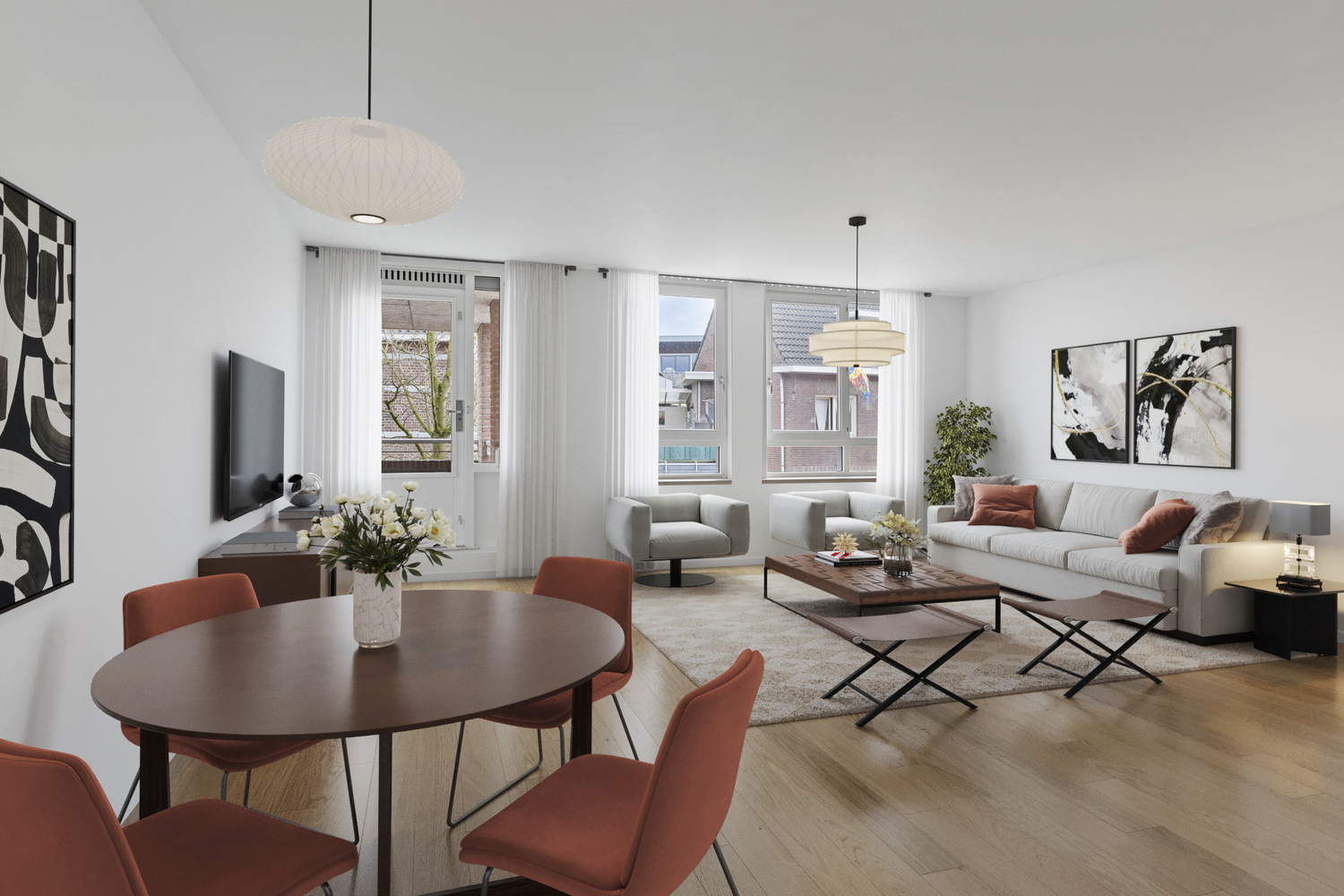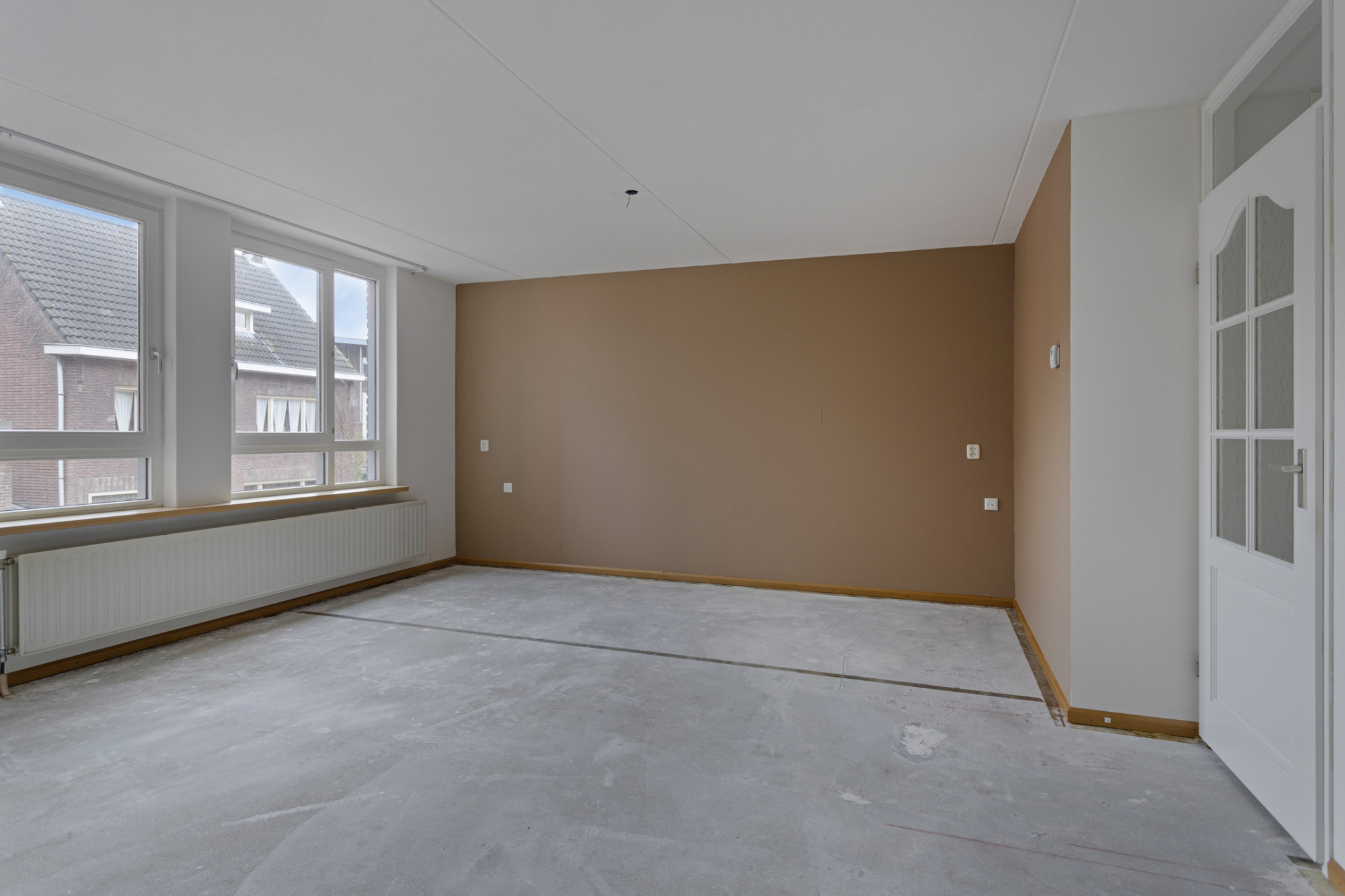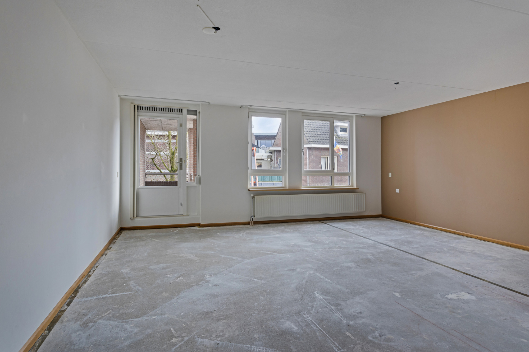 De woonkamer biedt volop ruimte voor zowel een gezellige zithoek als een sfeervolle eetruimte. Van hieruit is het balkon te bereiken.