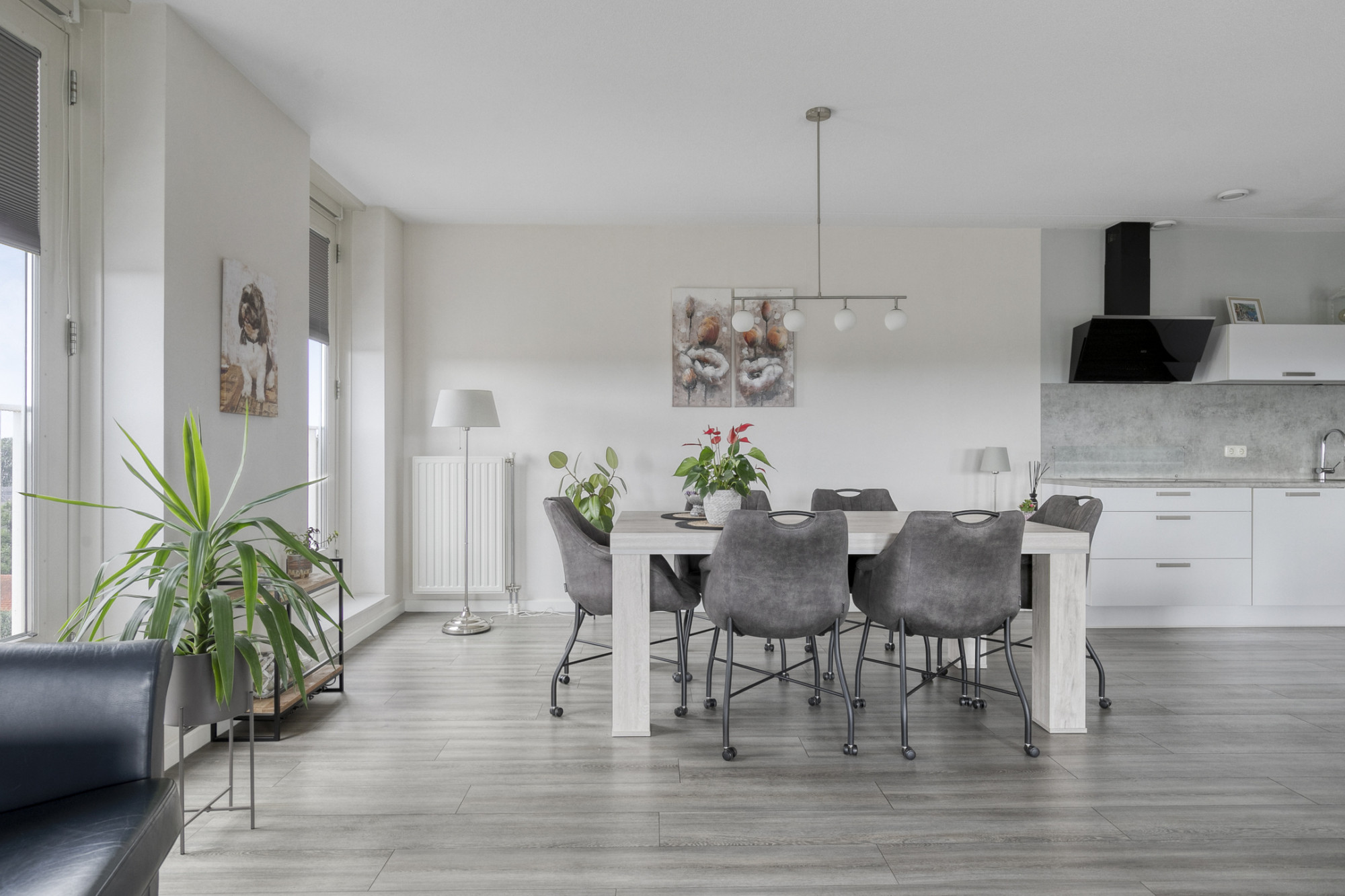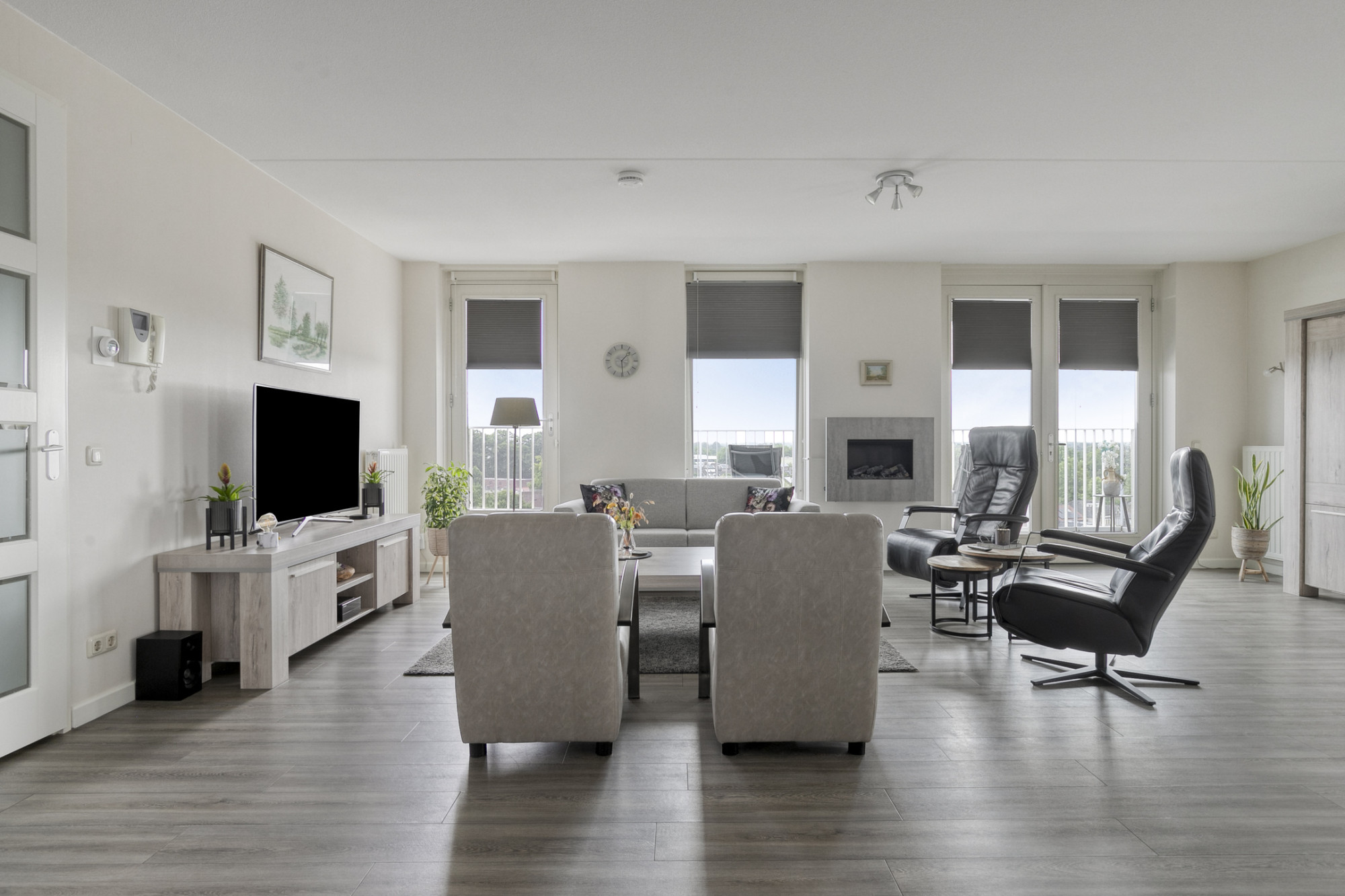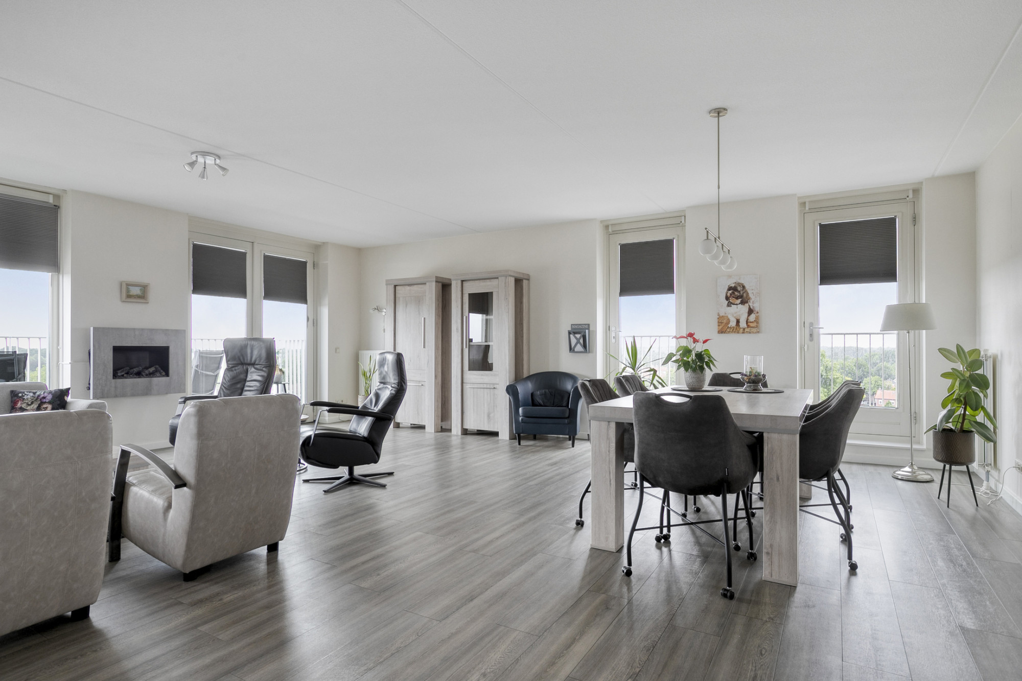 De ruime woonkamer van ca. 53 m² biedt volop lichtinval dankzij de grote raampartijen en meerdere Franse balkons. Vanuit de woonkamer is er toegang tot het balkon, met fraai uitzicht over de omgeving. Aansluitend bevindt zich de open keuken in een lichte kleurstelling. Deze is uitgerust met een inductiekookplaat, vaatwasser, inbouwkoelkast en combi-oven.