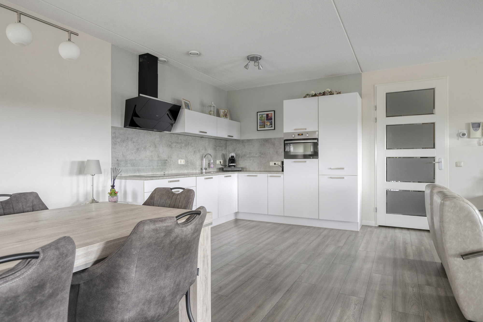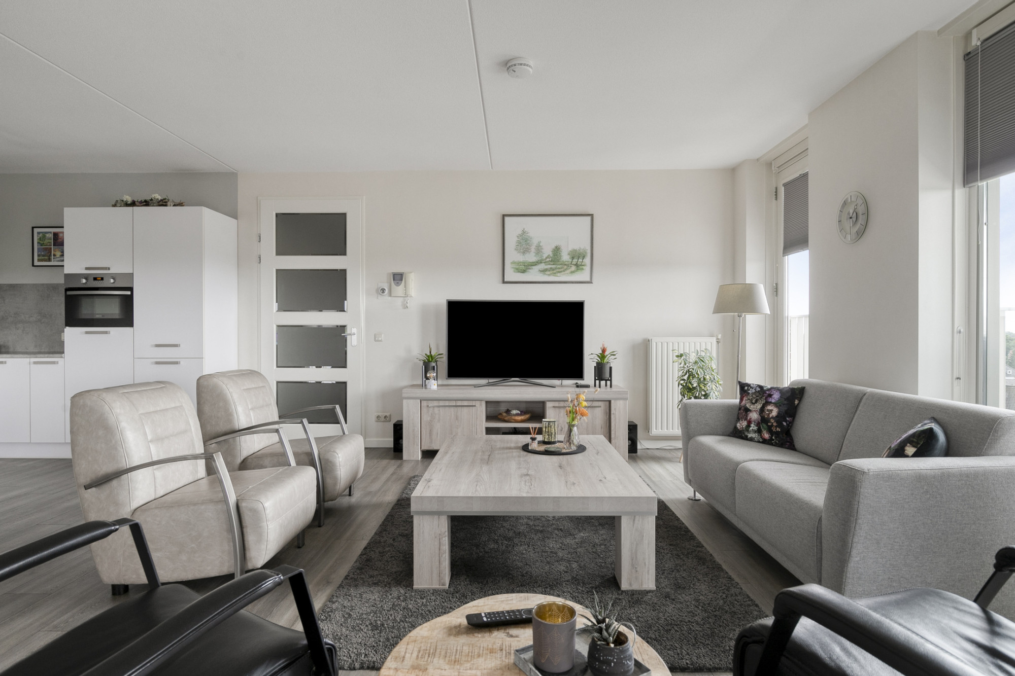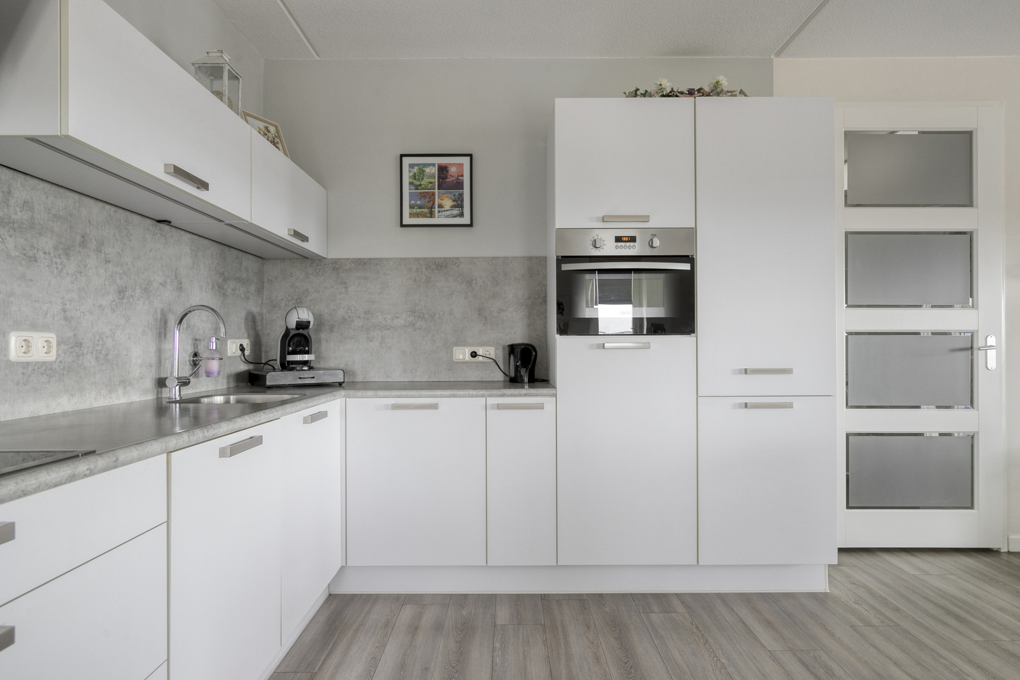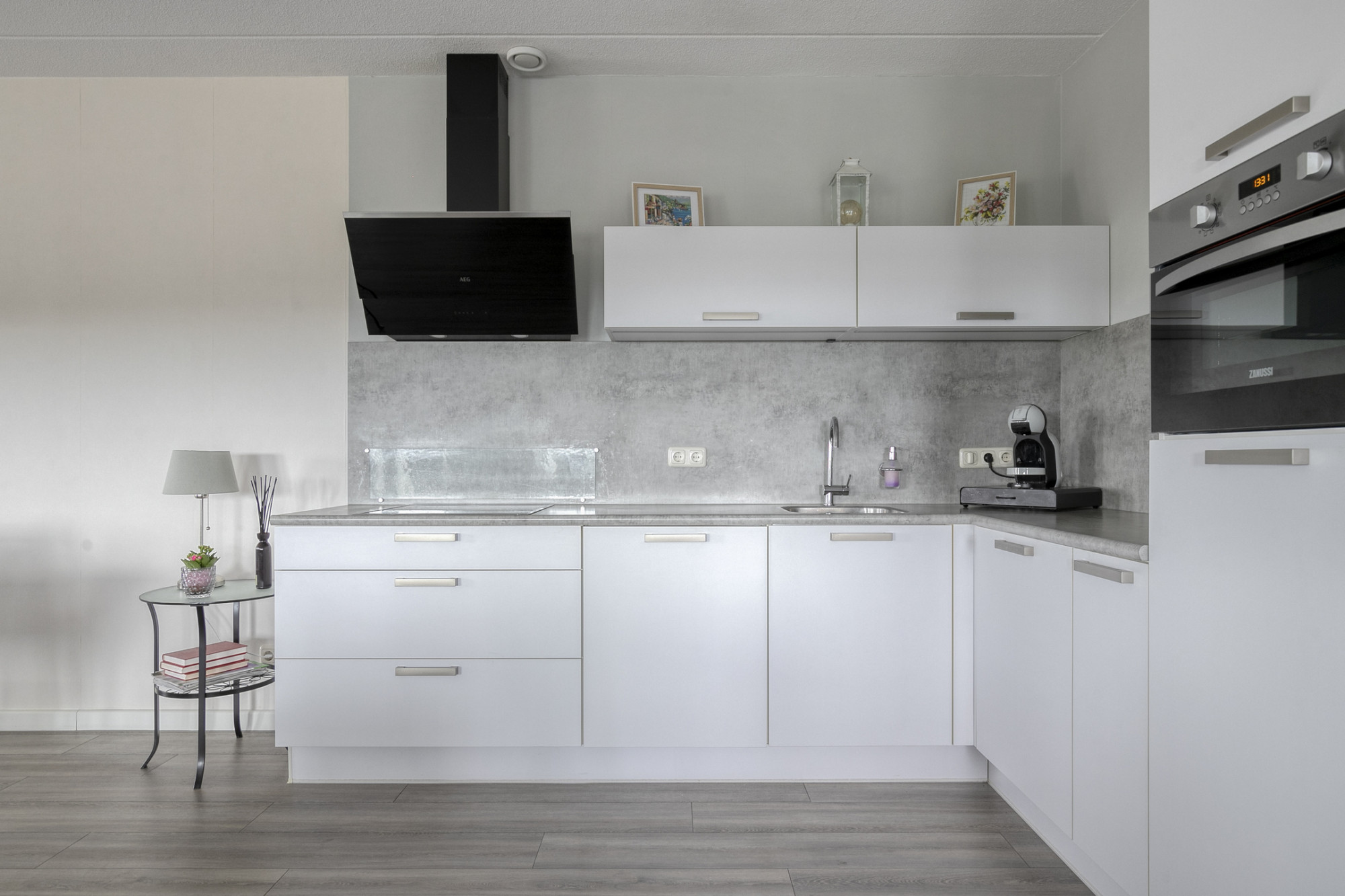 De ruime woonkamer van ca. 53 m² biedt volop lichtinval dankzij de grote raampartijen en meerdere Franse balkons. Vanuit de woonkamer is er toegang tot het balkon, met fraai uitzicht over de omgeving. Aansluitend bevindt zich de open keuken in een lichte kleurstelling. Deze is uitgerust met een inductiekookplaat, vaatwasser, inbouwkoelkast en combi-oven.