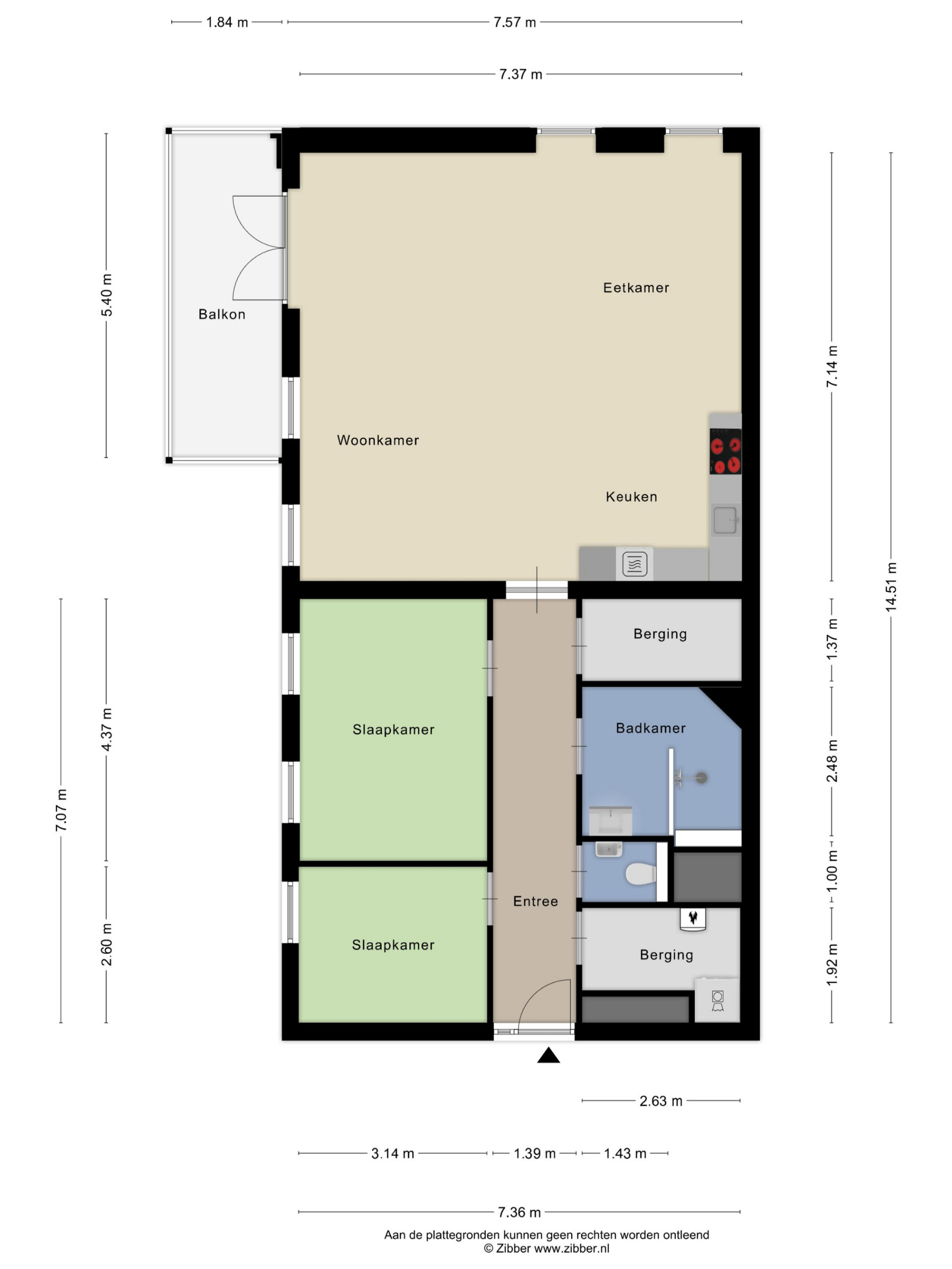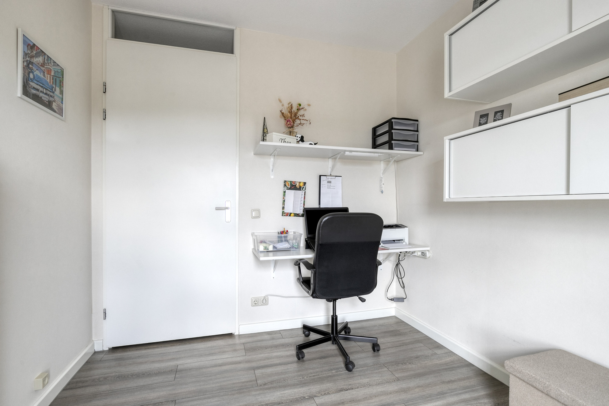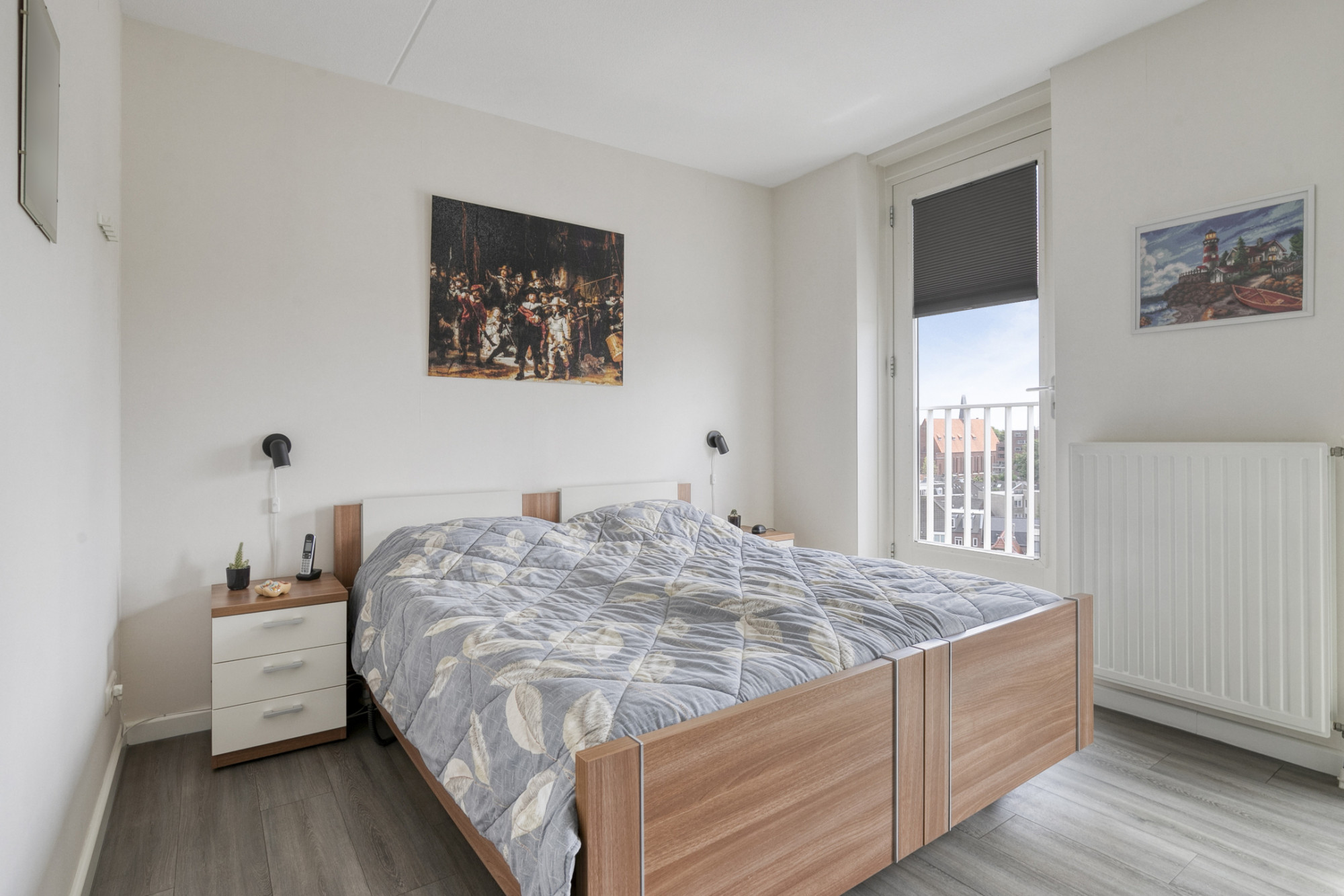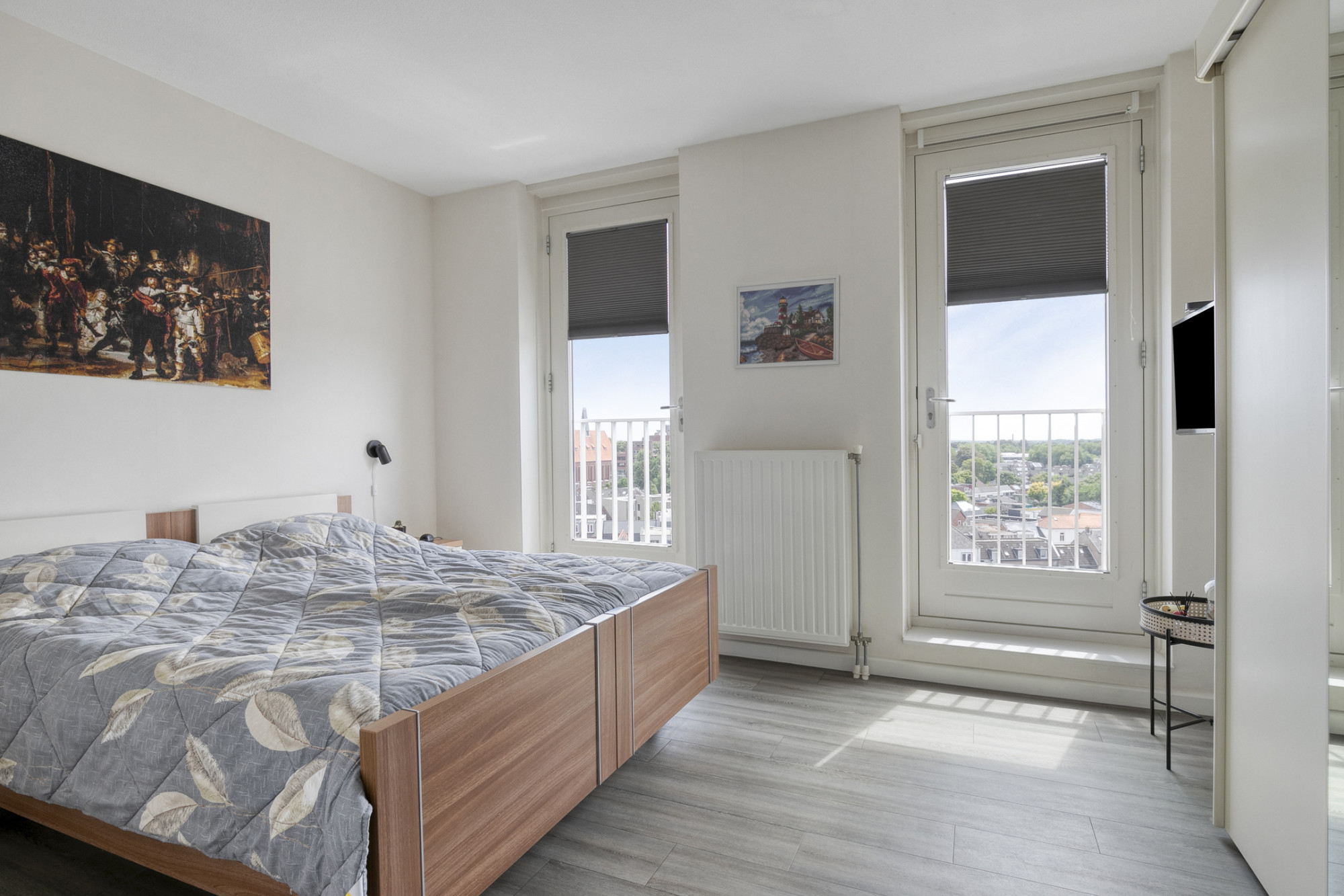 Verder biedt de hal toegang tot twee slaapkamers. De grootste slaapkamer is circa 14 m² en heeft twee Franse balkons. De tweede slaapkamer is circa 8 m² en eveneens voorzien van een Frans balkon.