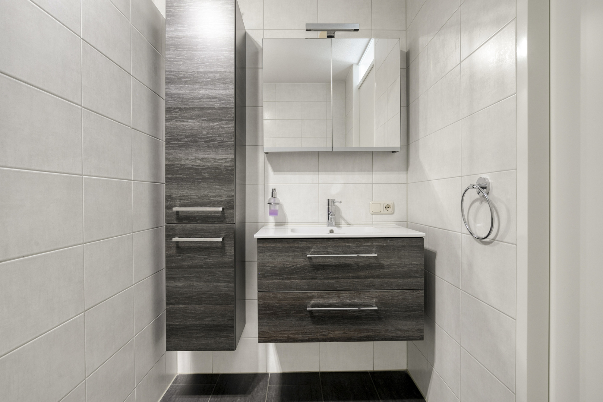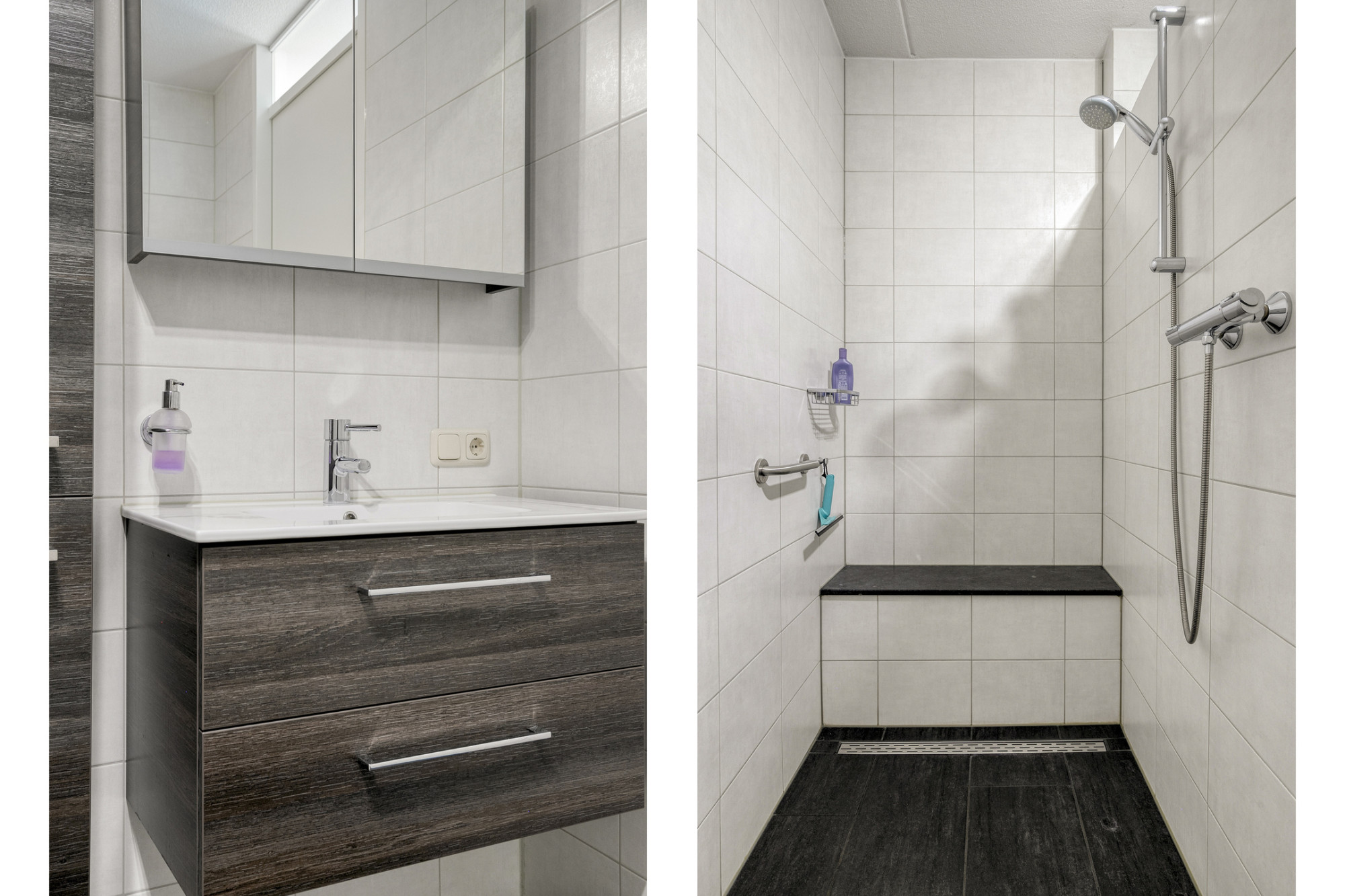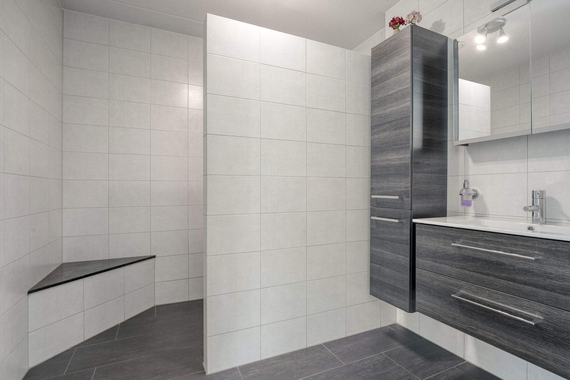 De volledig betegelde badkamer is praktisch ingedeeld en uitgerust met een inloopdouche, een vaste douchewand, een comfortabel zitplateau, een wastafelmeubel met spiegelkast en een hoge kolomkast voor extra bergruimte.