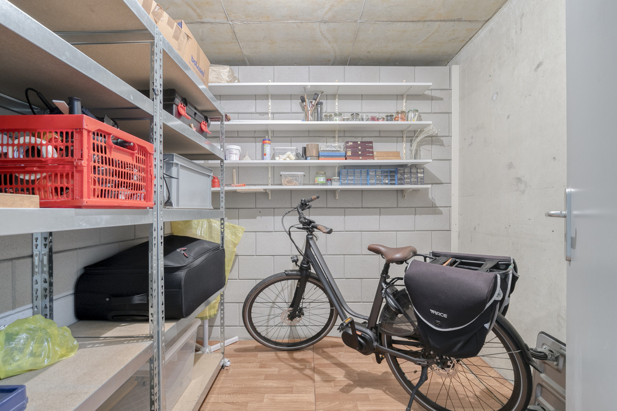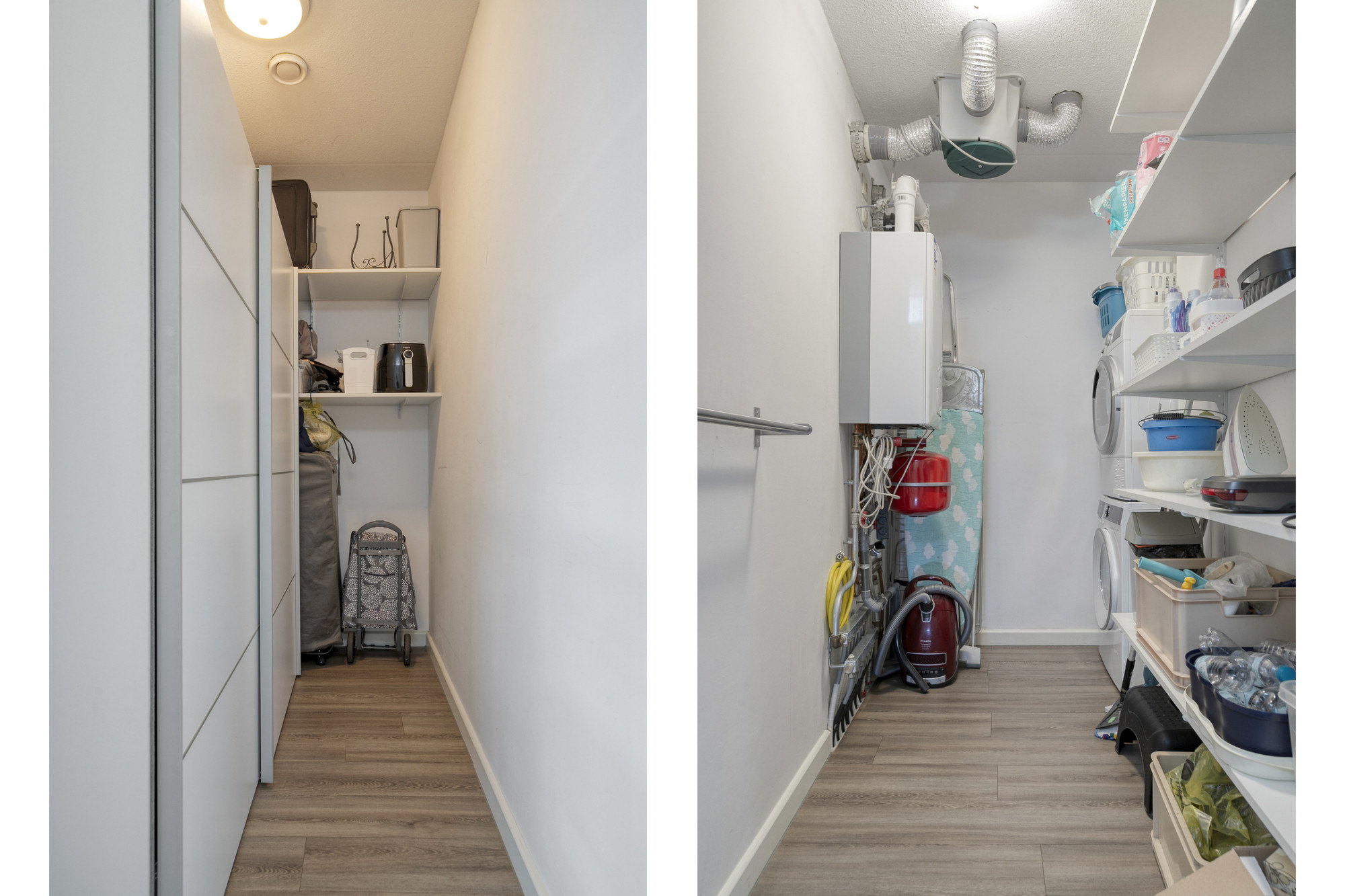 Aan de rechterzijde bevindt zich de eerste berging, uitgerust met witgoedaansluitingen en de cv-ketel (AWB, 2009). Iets verderop is een tweede, ruime berging gelegen, ideaal voor extra opslag.