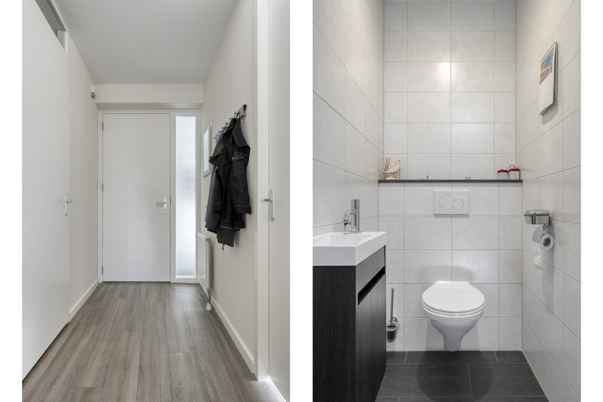 Rechts van de hal ligt het volledig betegelde toilet, voorzien van een wandcloset en fonteintje.