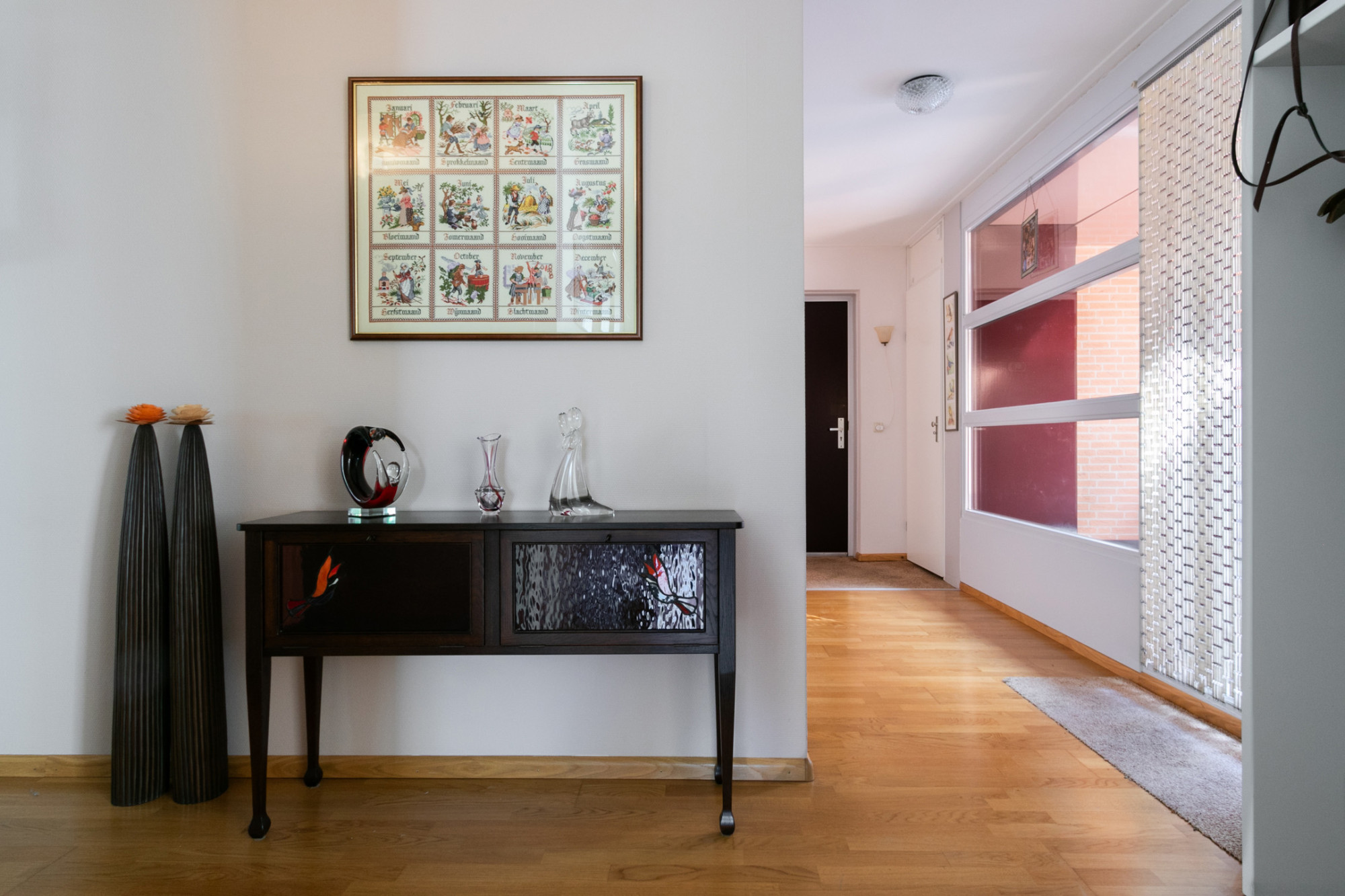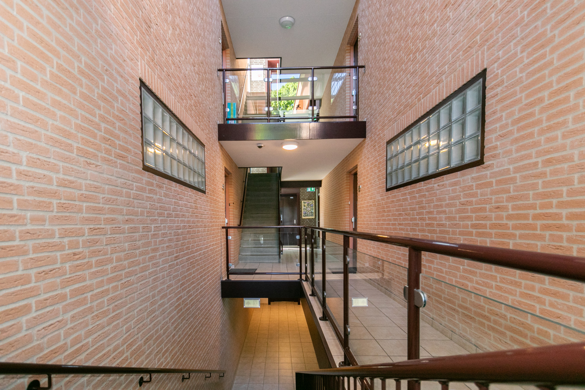 Entree via de gezamenlijke hal waar je de trap kunt nemen of de lift kunt kiezen naar de bovenste verdieping, waar het appartement zich bevindt. De lange hal is de centrale spil van het appartement. Het terras, de woonkamer, slaapkamers, badkamer, toilet, meterkast en grote bergruimte zijn vanuit de gang bereikbaar.