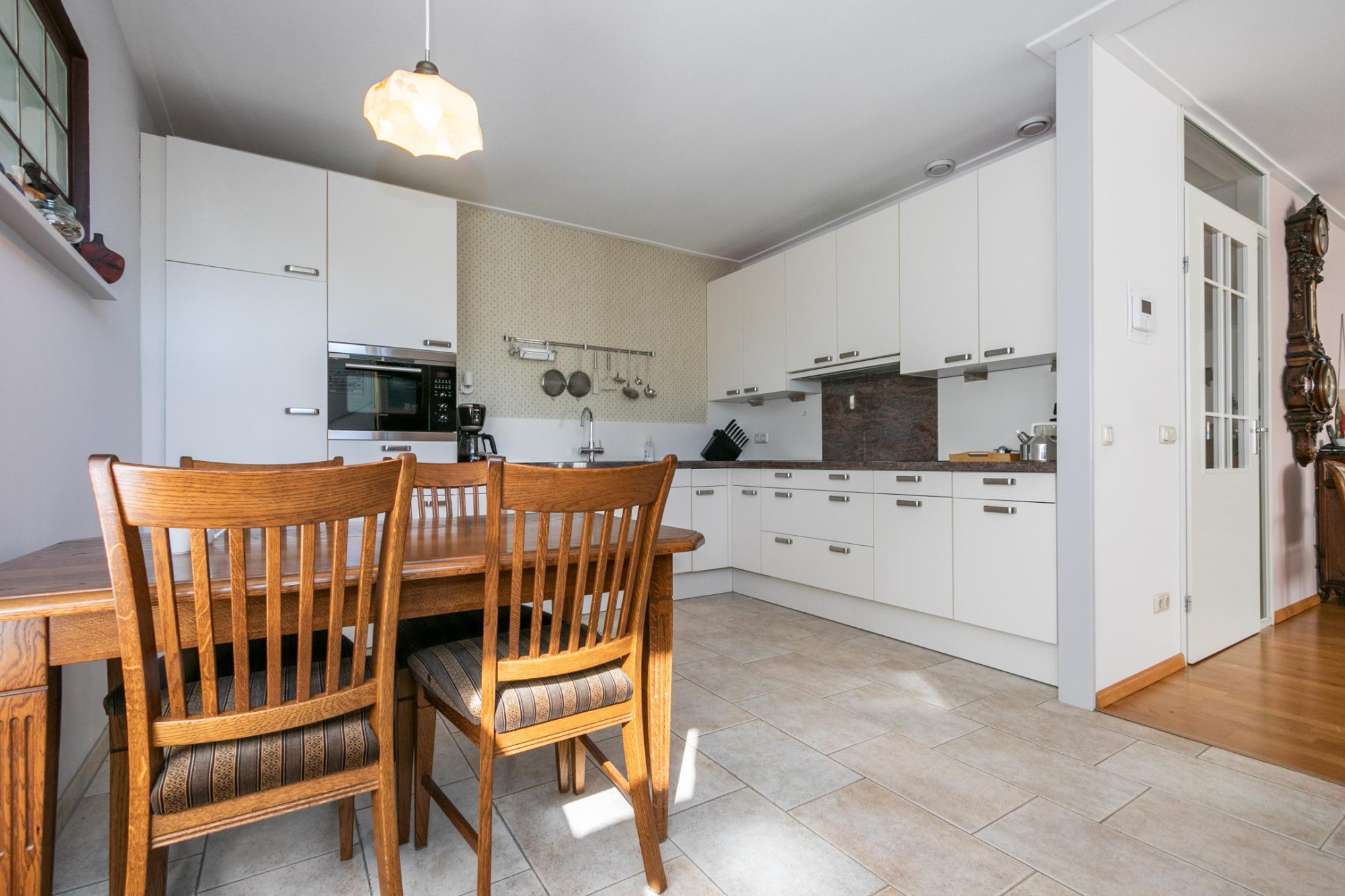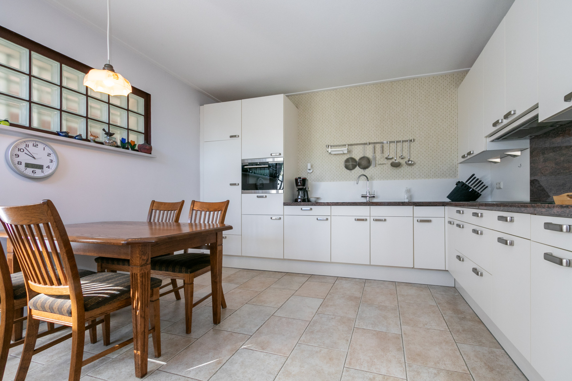 De keuken heeft een complete L-vormige opstand met een inductiekookplaat, afzuigkap en combi-oven.