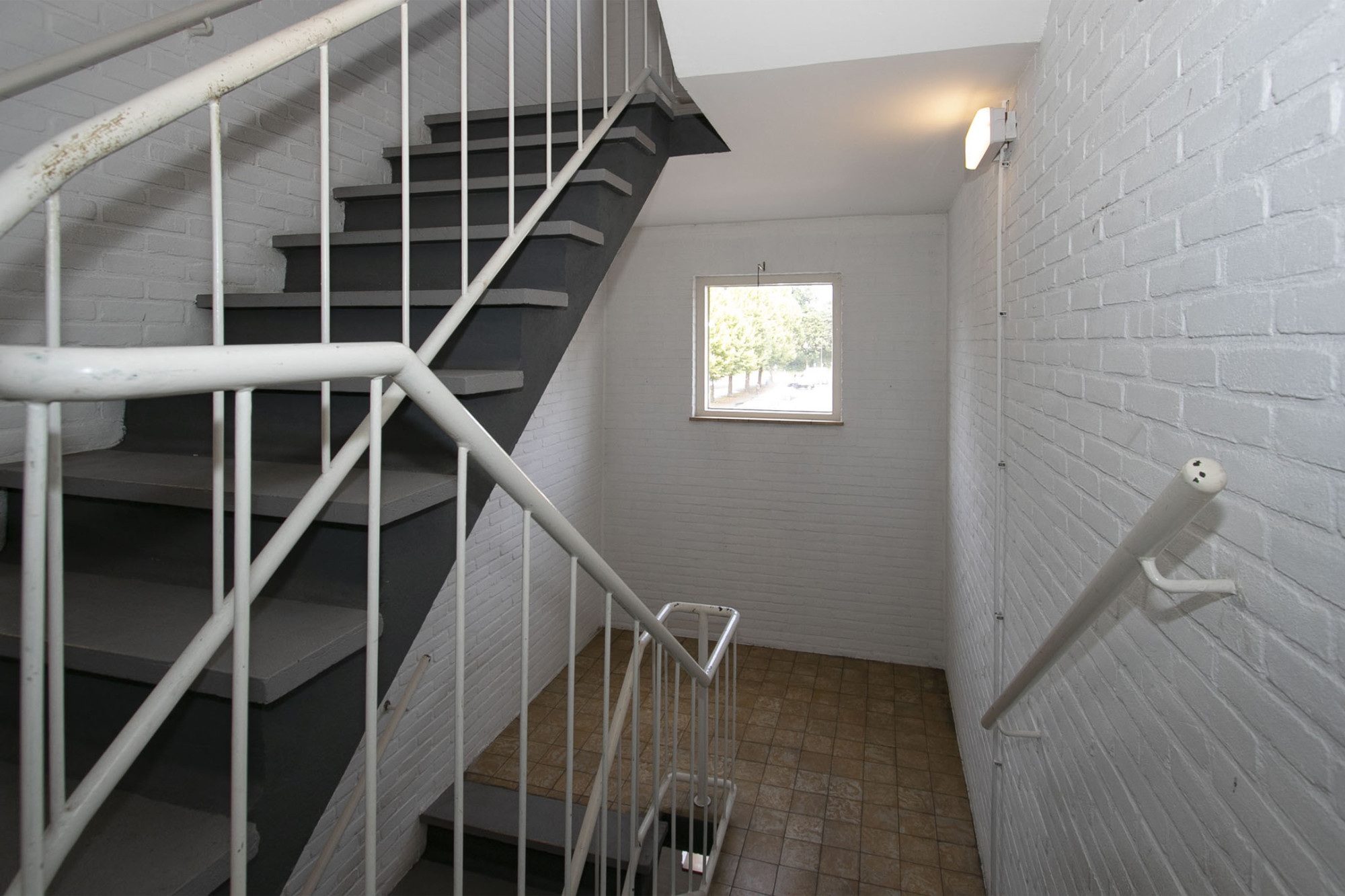Centrale entree met brievenbussen, trappenhuis en deurbellentableau.