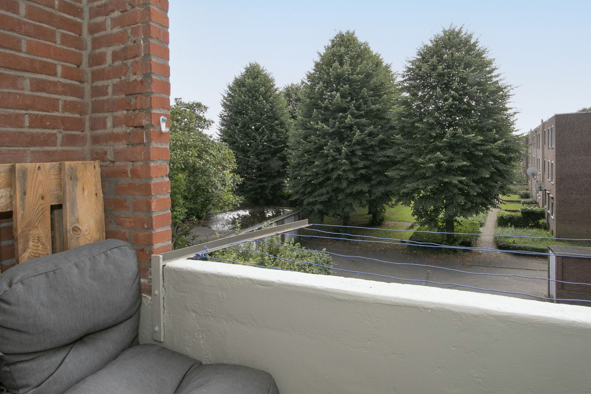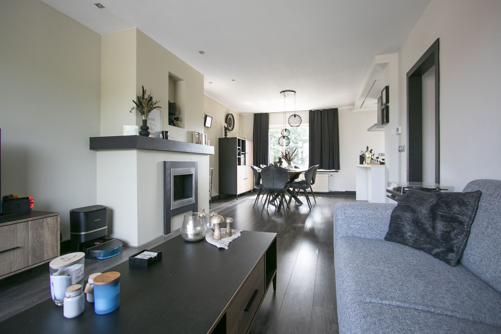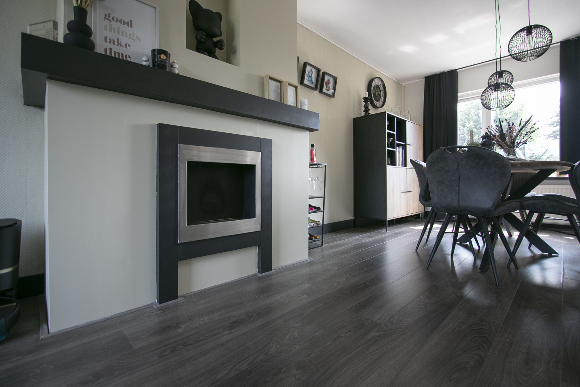 De woonkamer is afgewerkt met een grijze laminaat vloer en geeft toegang tot het balkon aan de achterzijde van het complex. Het balkon biedt uitzicht over een groenvoorziening en het parkeerterrein. De woonkamer heeft een mooie schouw met bio ethanol haard.