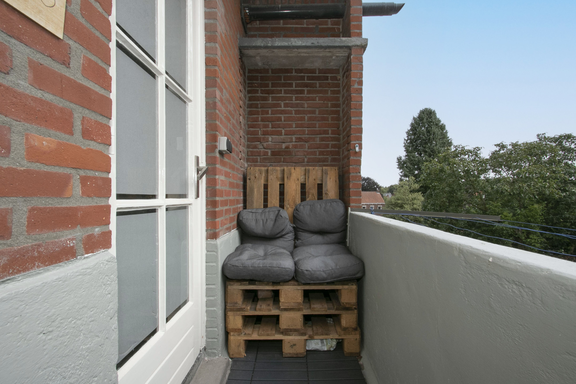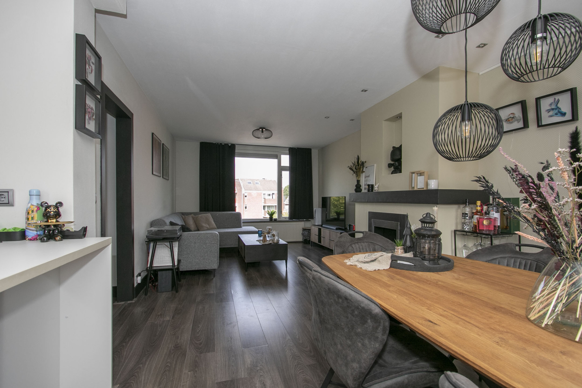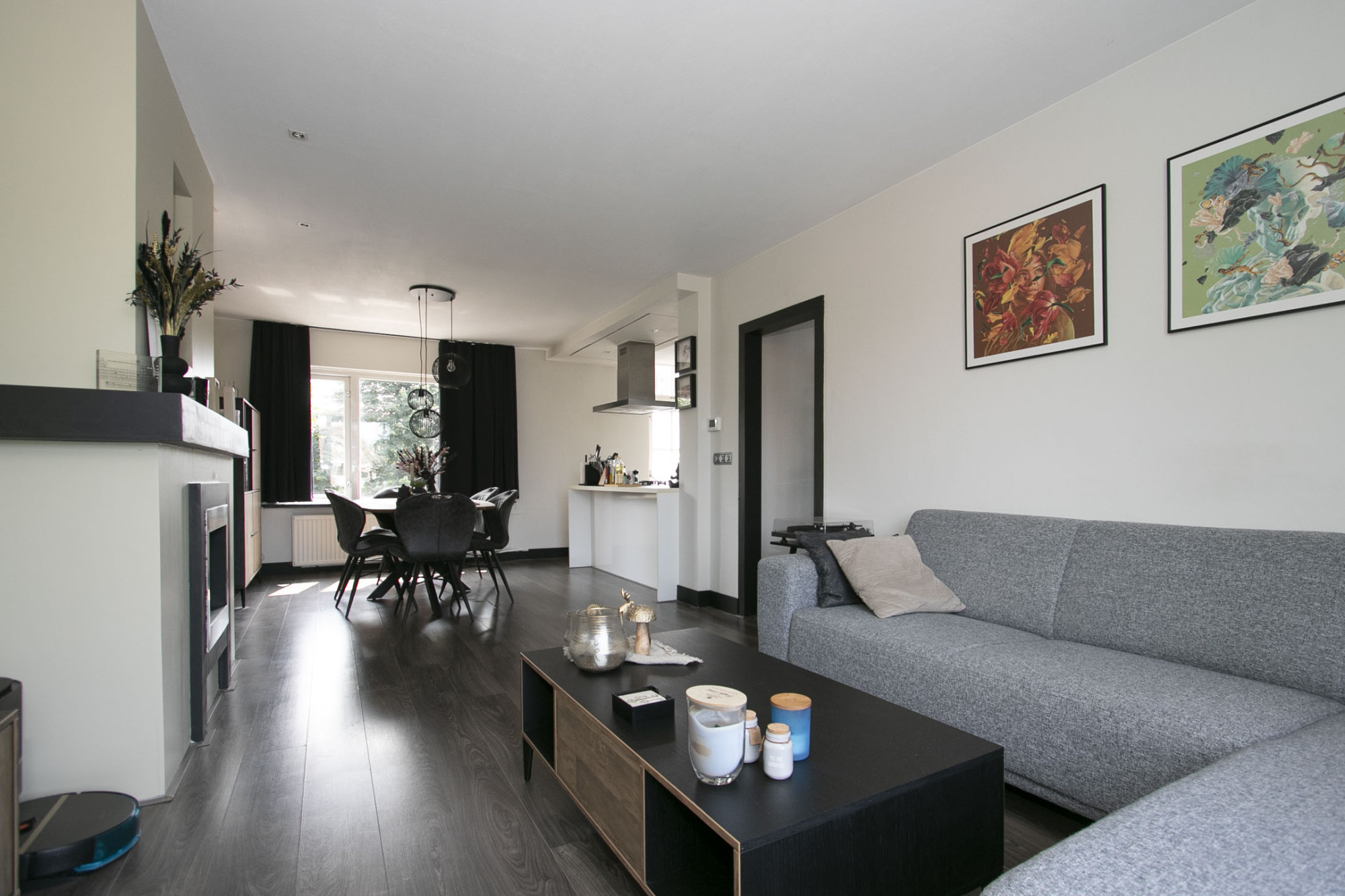 De woonkamer is afgewerkt met een grijze laminaat vloer en geeft toegang tot het balkon aan de achterzijde van het complex. Het balkon biedt uitzicht over een groenvoorziening en het parkeerterrein. De woonkamer heeft een mooie schouw met bio ethanol haard.