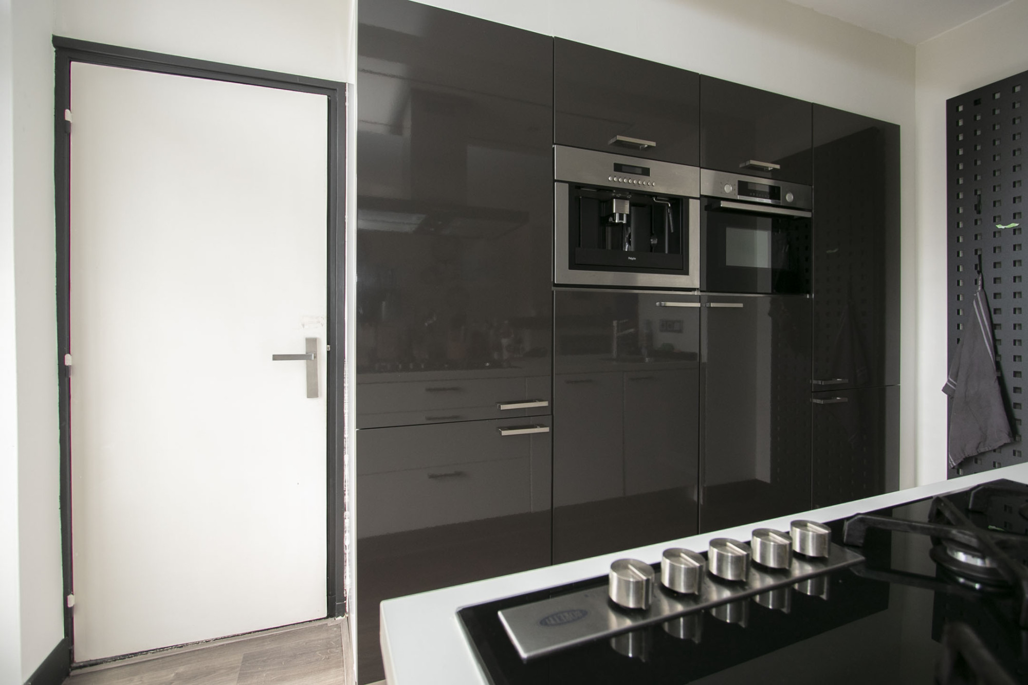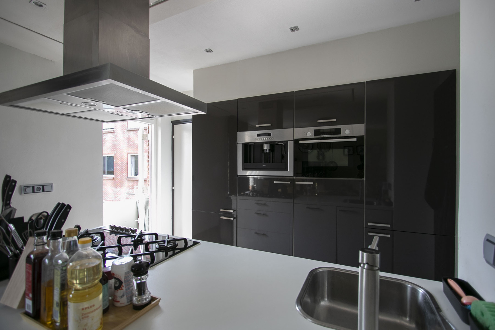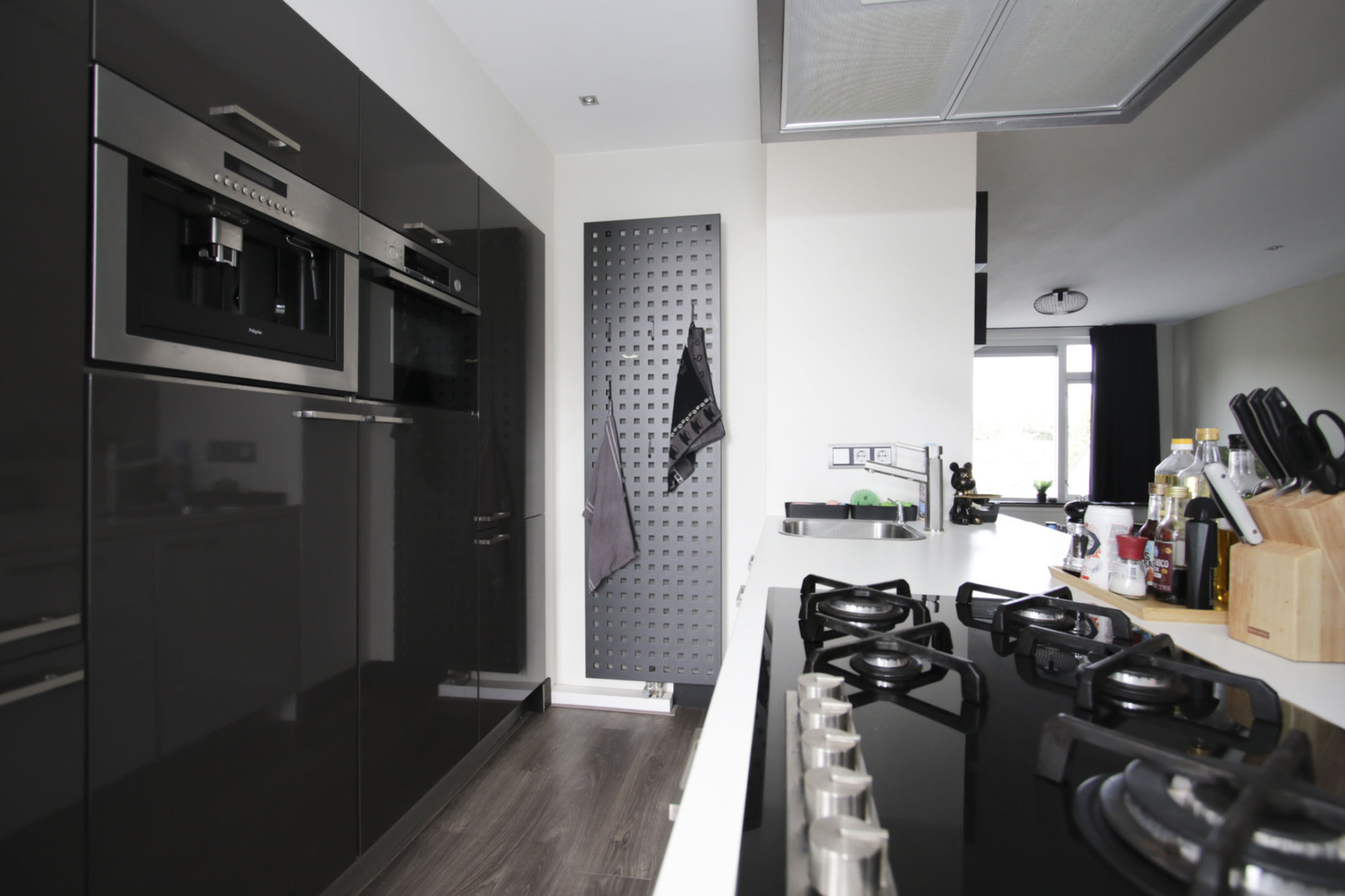 De moderne open keuken is een echte eyecatcher in het appartement. Het eiland is in wit uitgevoerd en de grote wandkast in grijs. Compleet voorzien van alle gemak met een 5 pits gaskookplaat, afzuigkap, combi-oven, koelkast (met vriesvak), koffiemachine en vaatwasser. Aan de muur hangt een design radiator in een mooie grijstint.