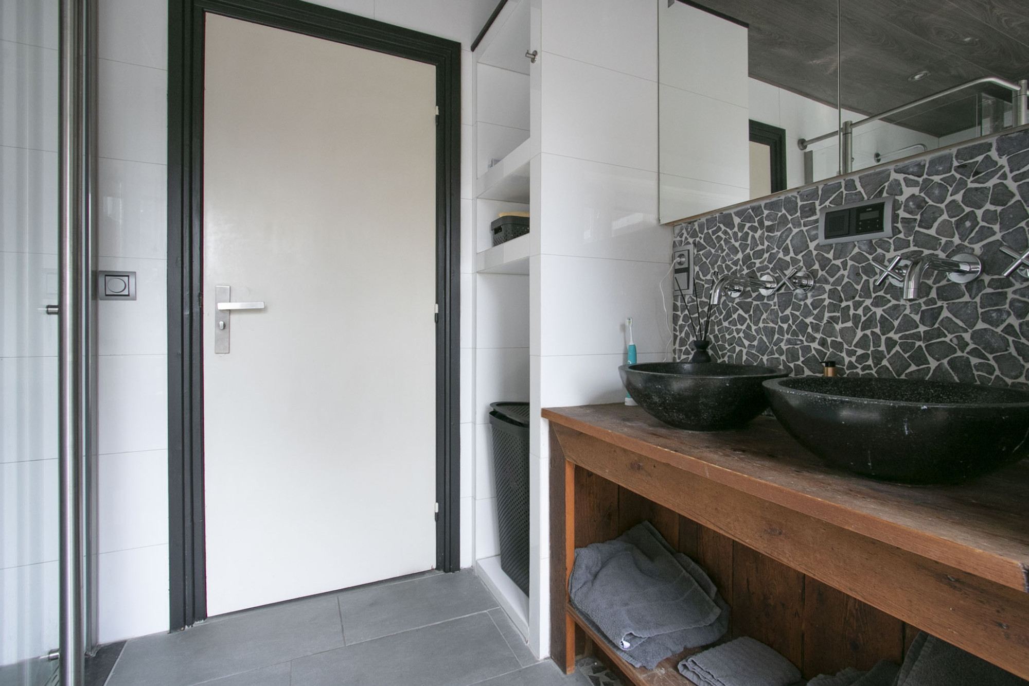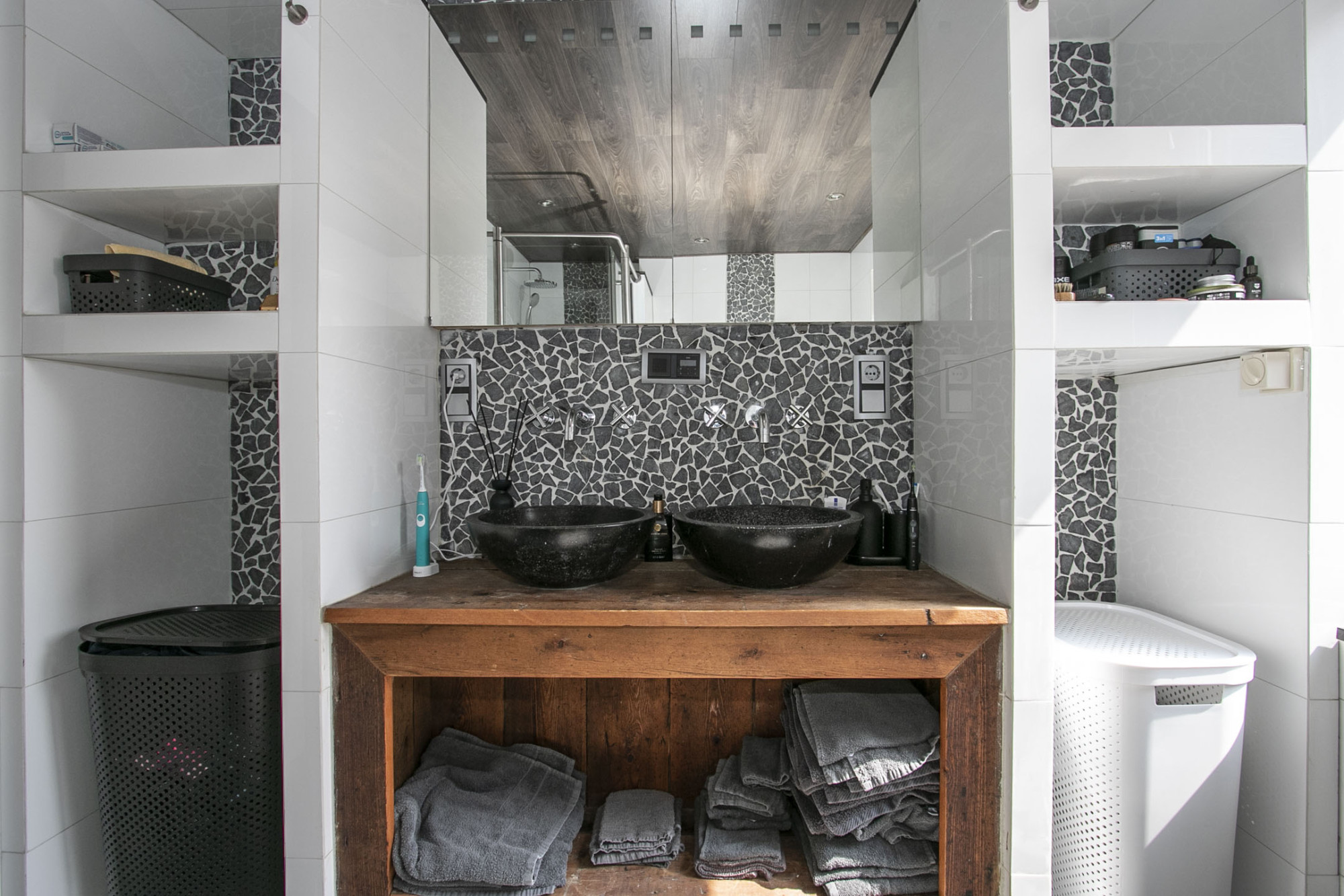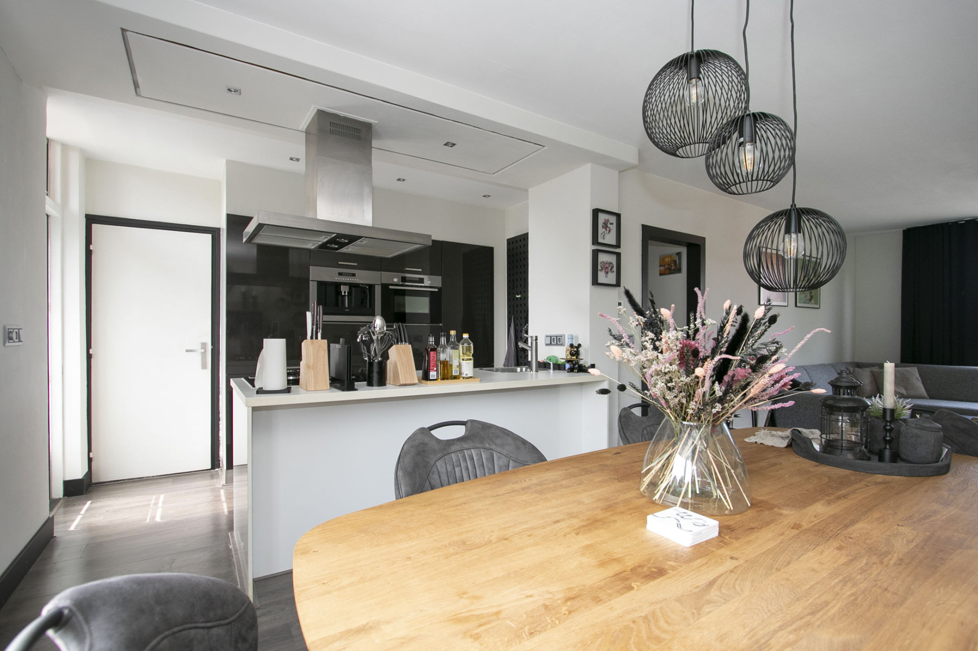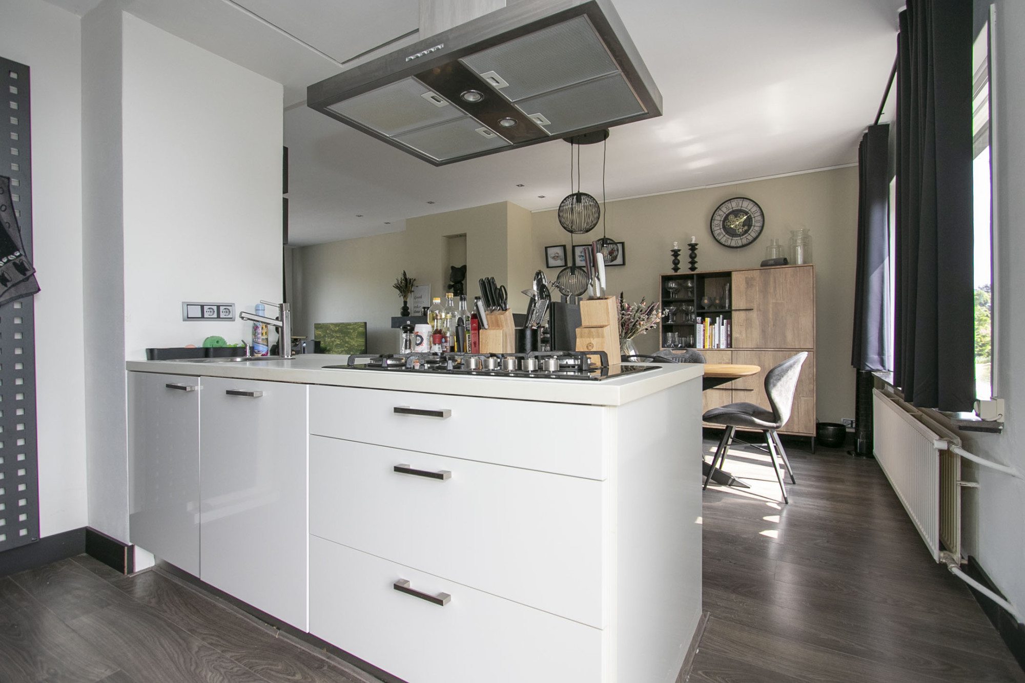 De moderne open keuken is een echte eyecatcher in het appartement. Het eiland is in wit uitgevoerd en de grote wandkast in grijs. Compleet voorzien van alle gemak met een 5 pits gaskookplaat, afzuigkap, combi-oven, koelkast (met vriesvak), koffiemachine en vaatwasser. Aan de muur hangt een design radiator in een mooie grijstint.