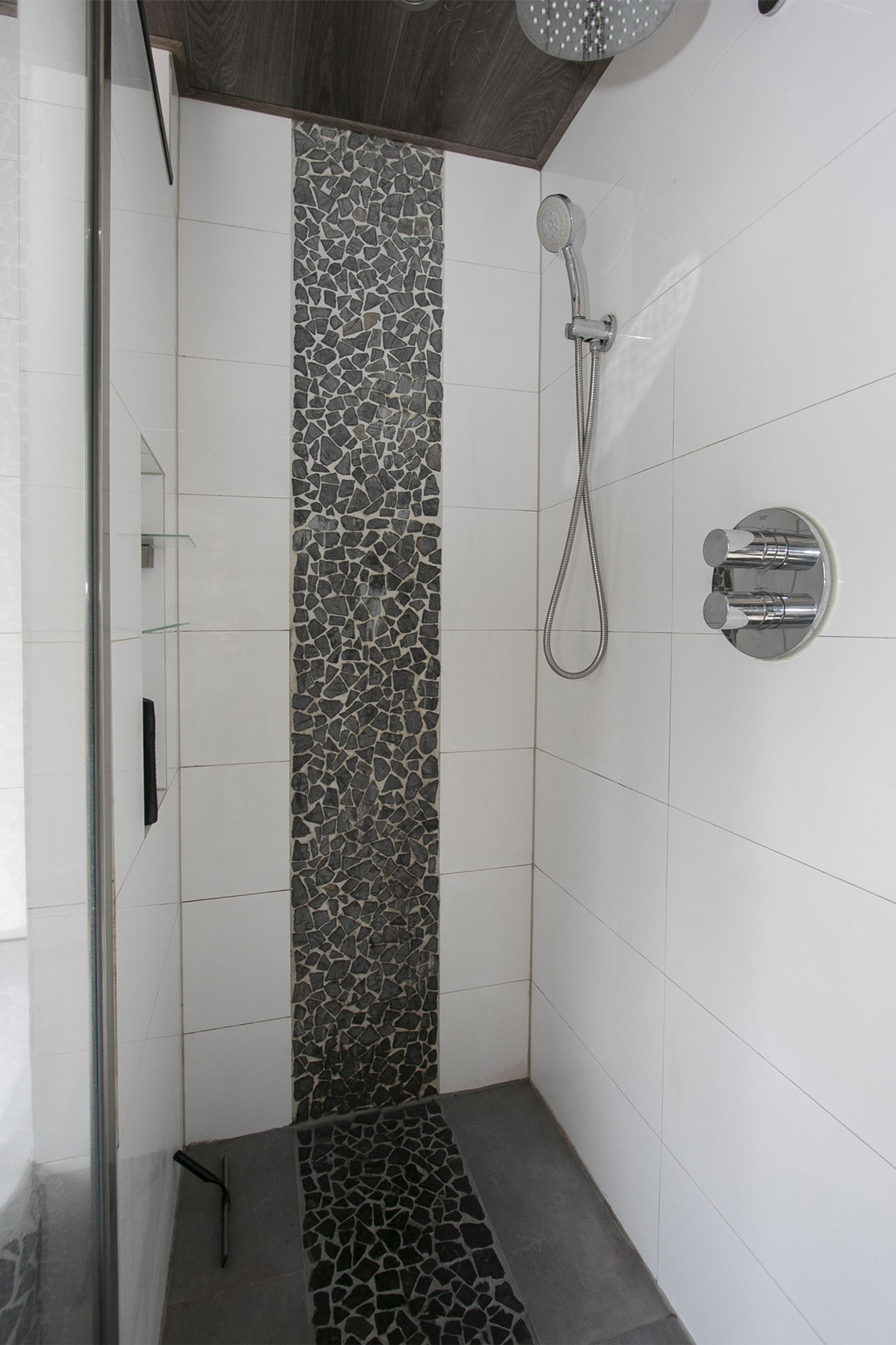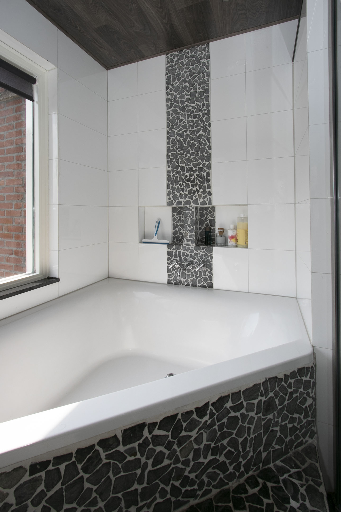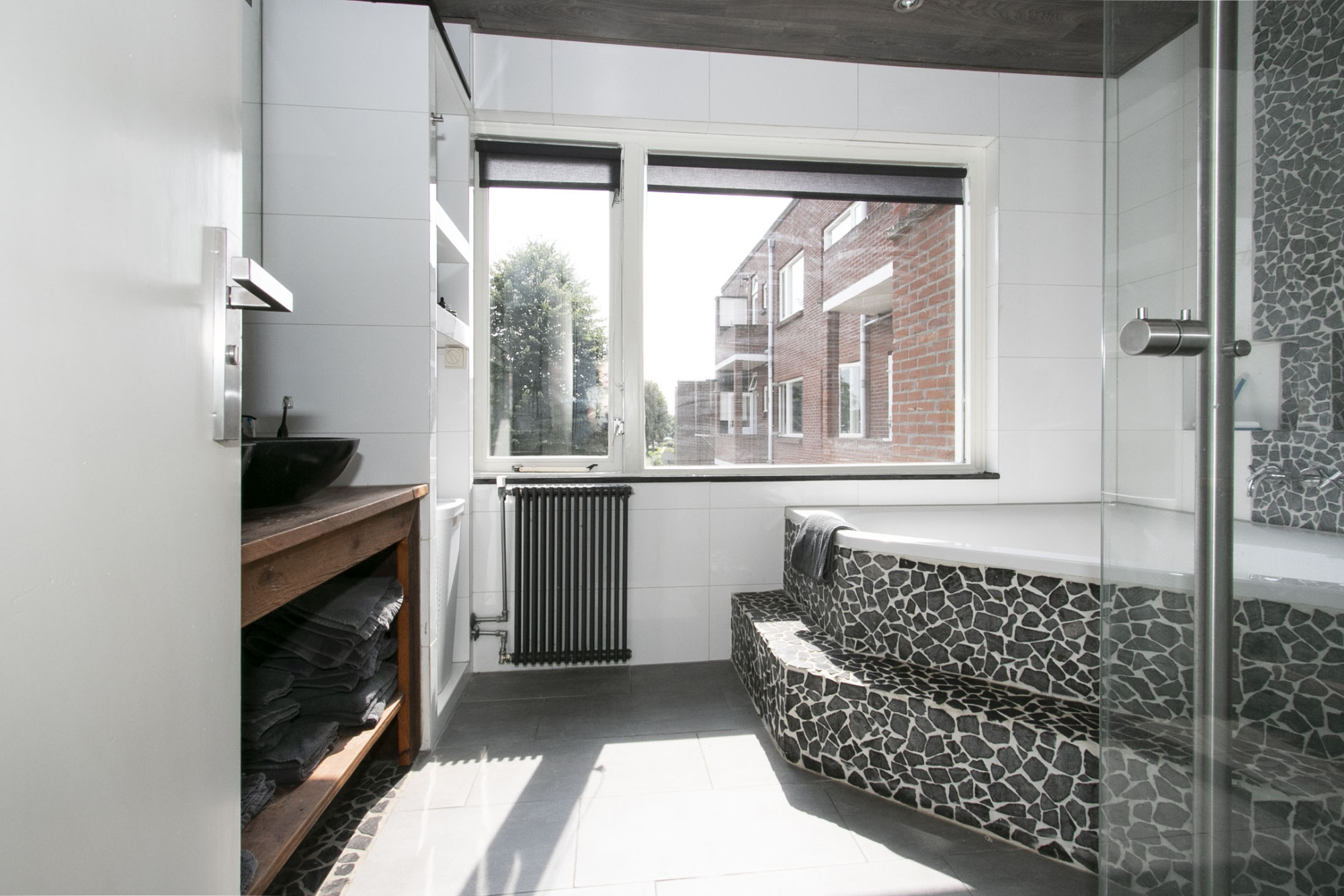 Via het trappenhuis bereik je de entree van het appartement. De entree geeft toegang tot de hal. De hal is centraal gelegen in het appartement en geeft toegang tot vrijwel alle vertrekken van het appartement. Het appartement heeft de beschikking over een slaapkamer aan de voorzijde van het appartement. Aan de overzijde van de slaapkamer bevindt zich de ruime en complete badkamer. Deze is uitgevoerd met een douchecabine, groot hoekbad, en dubbele wastafel met gemetselde ombouw. Het tegelwerk is speels uitgevoerd in wit en grijstinten.