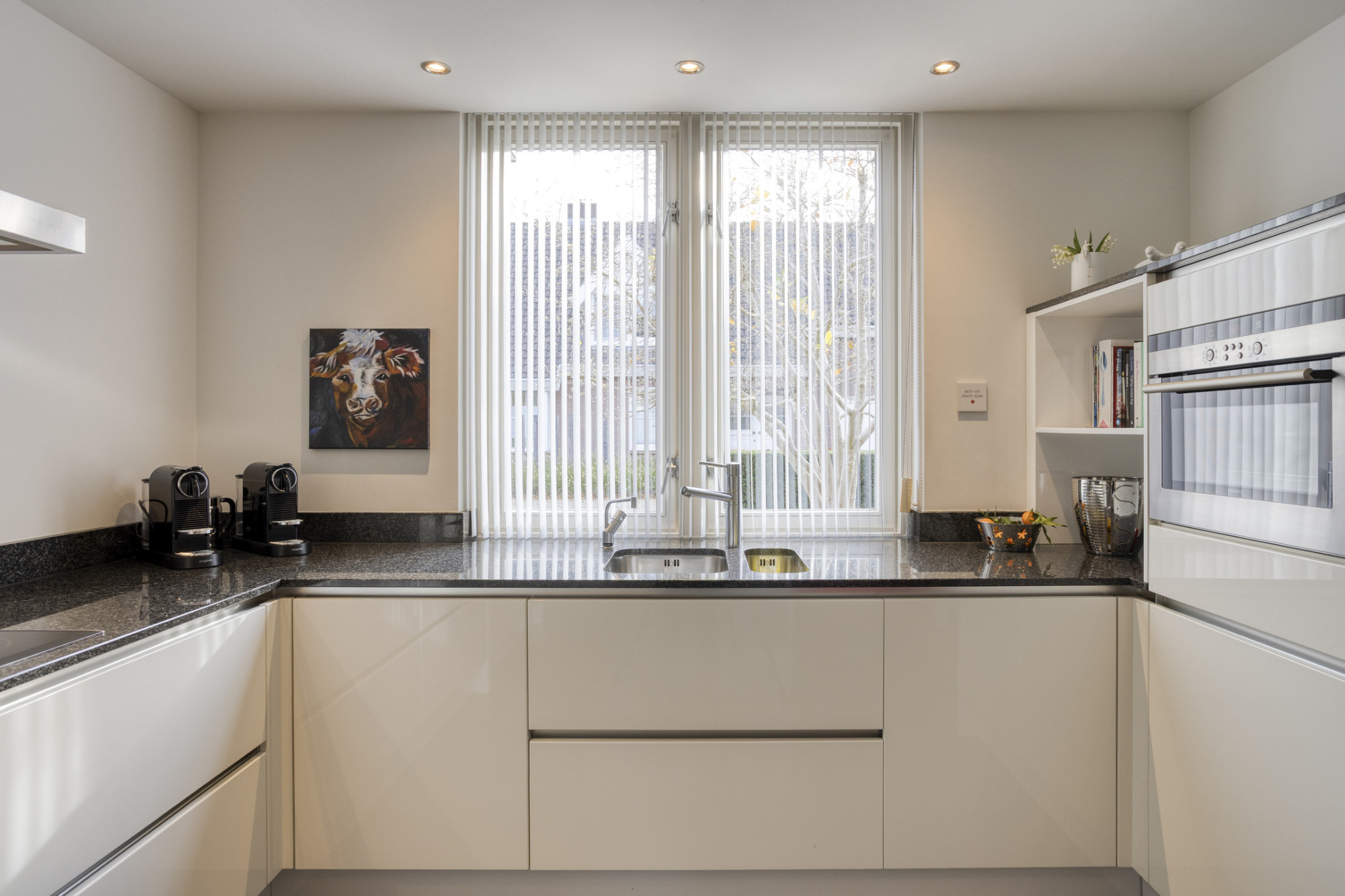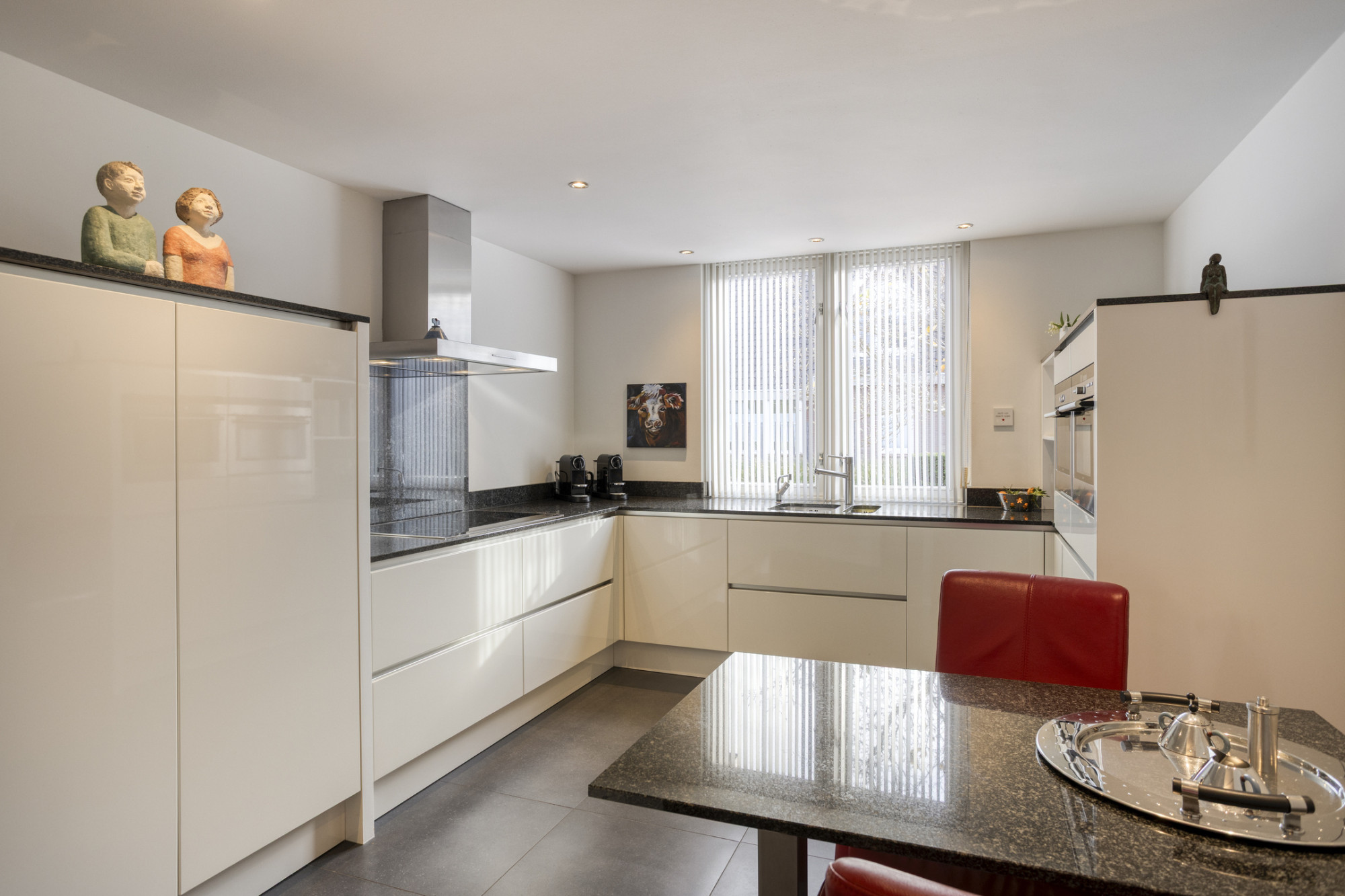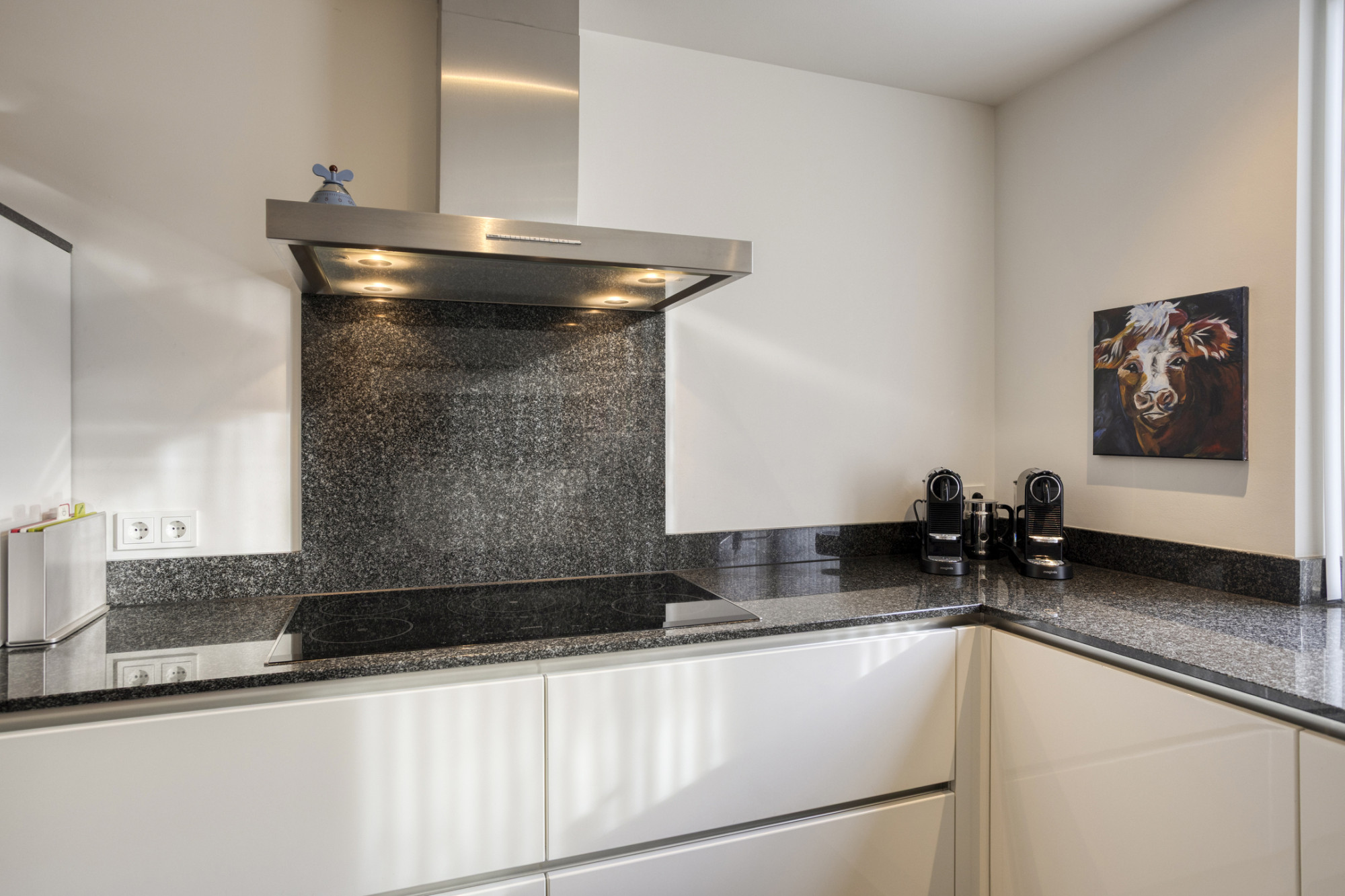 De halfopen keuken (4.35 x 3.35 m), bereikbaar via een schuifwand, is uitgevoerd in een moderne witte U-opstelling en voorzien van hoogwaardige inbouwapparatuur: 5-pits inductiekookplaat, afzuigkap, oven, combimagnetron, vaatwasser, Quooker en koelkast.