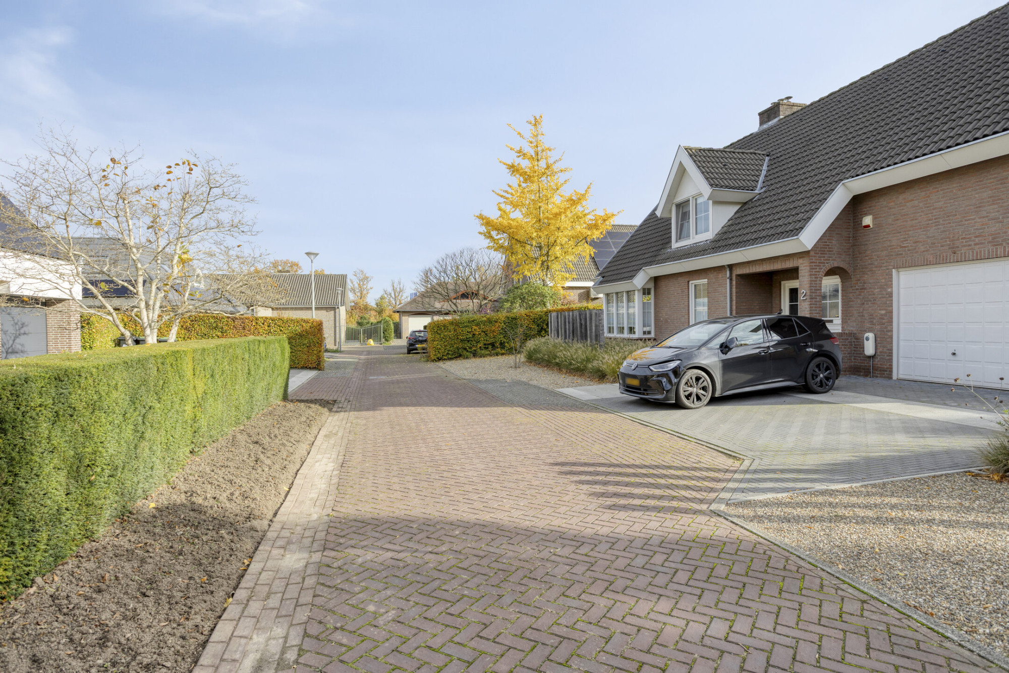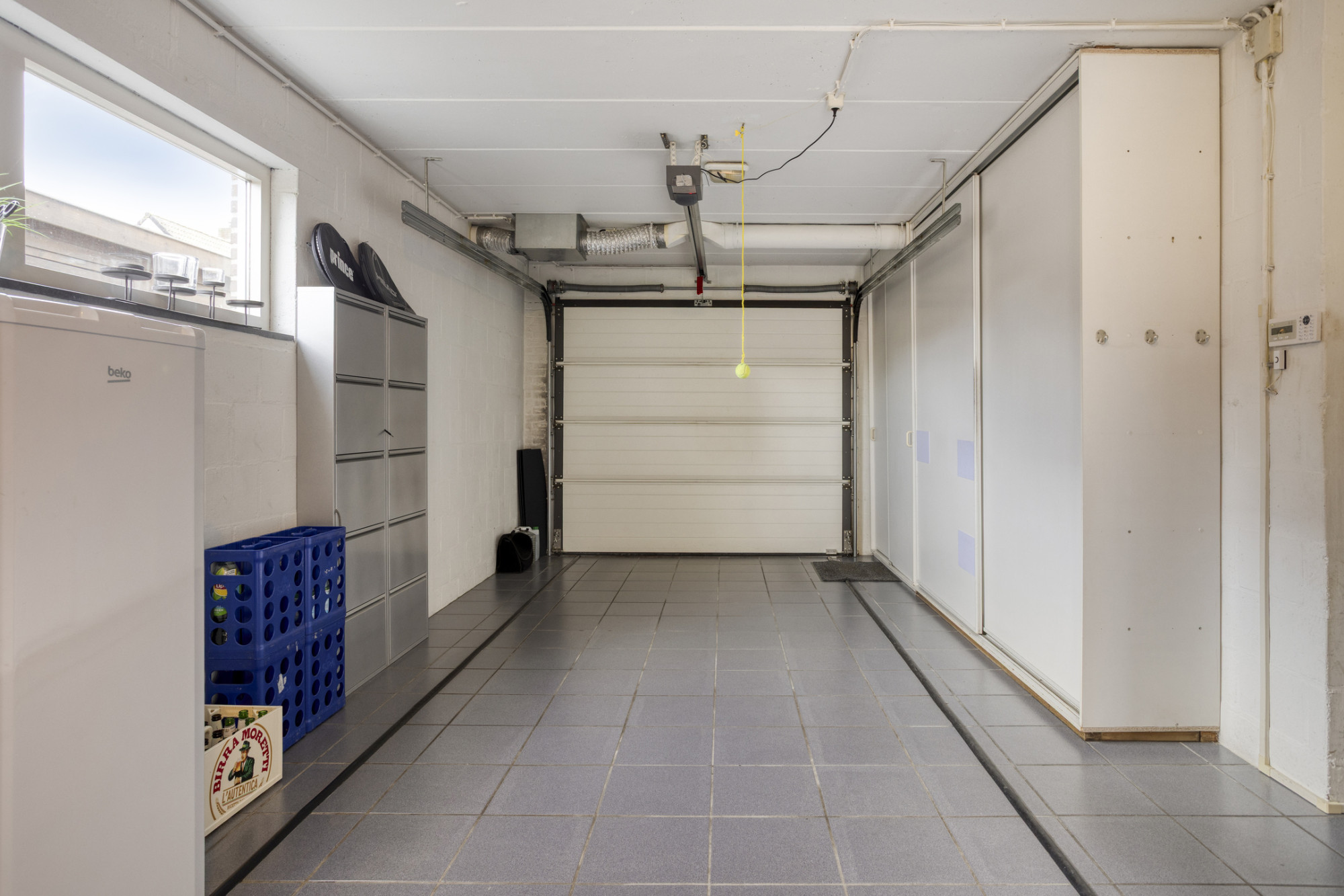 Vanuit de keuken is er toegang tot de ruime inpandige garage (7.89 x 3.55 m) met elektrische sectionaalpoort, vaste kastenwand, stortbak en douchecabine. Op eigen terrein is parkeergelegenheid voor twee auto’s.
