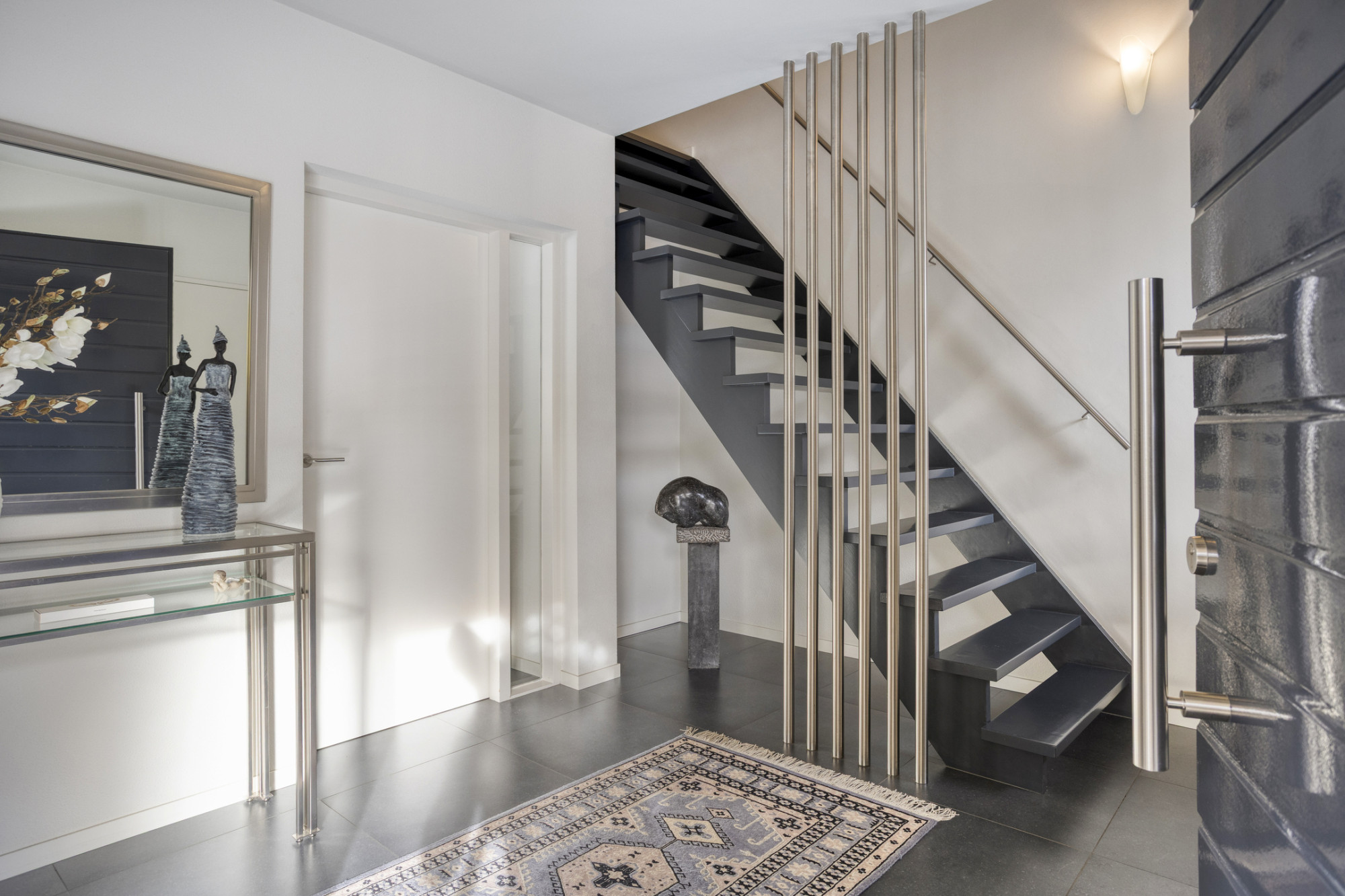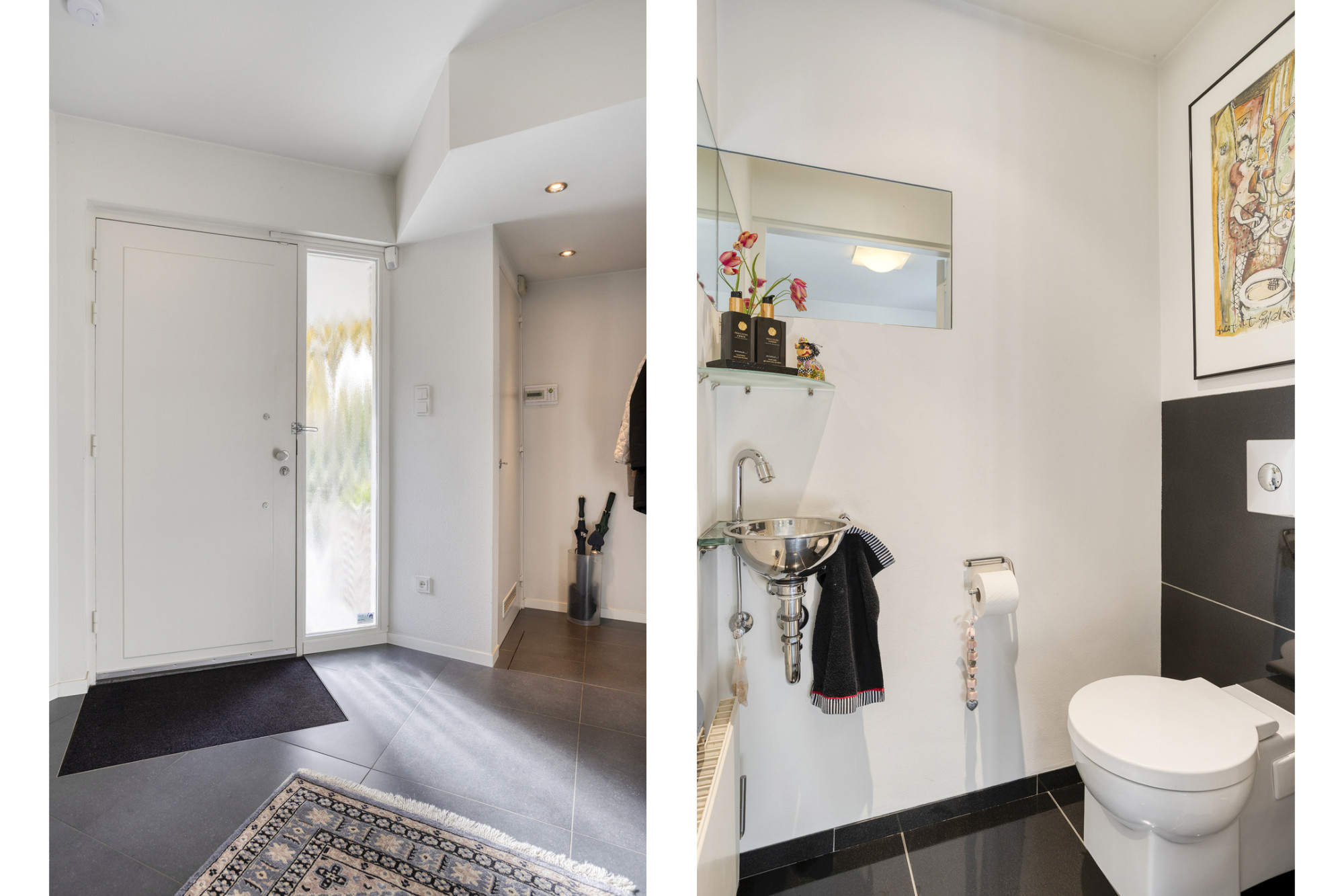 Via de fraai aangelegde voortuin bereikt men de overdekte entree. De hal, voorzien van een doorlopende plavuizenvloer, beschikt over een garderobenis en een modern gastentoilet met wandcloset en stijlvol RVS-hoekfonteintje.