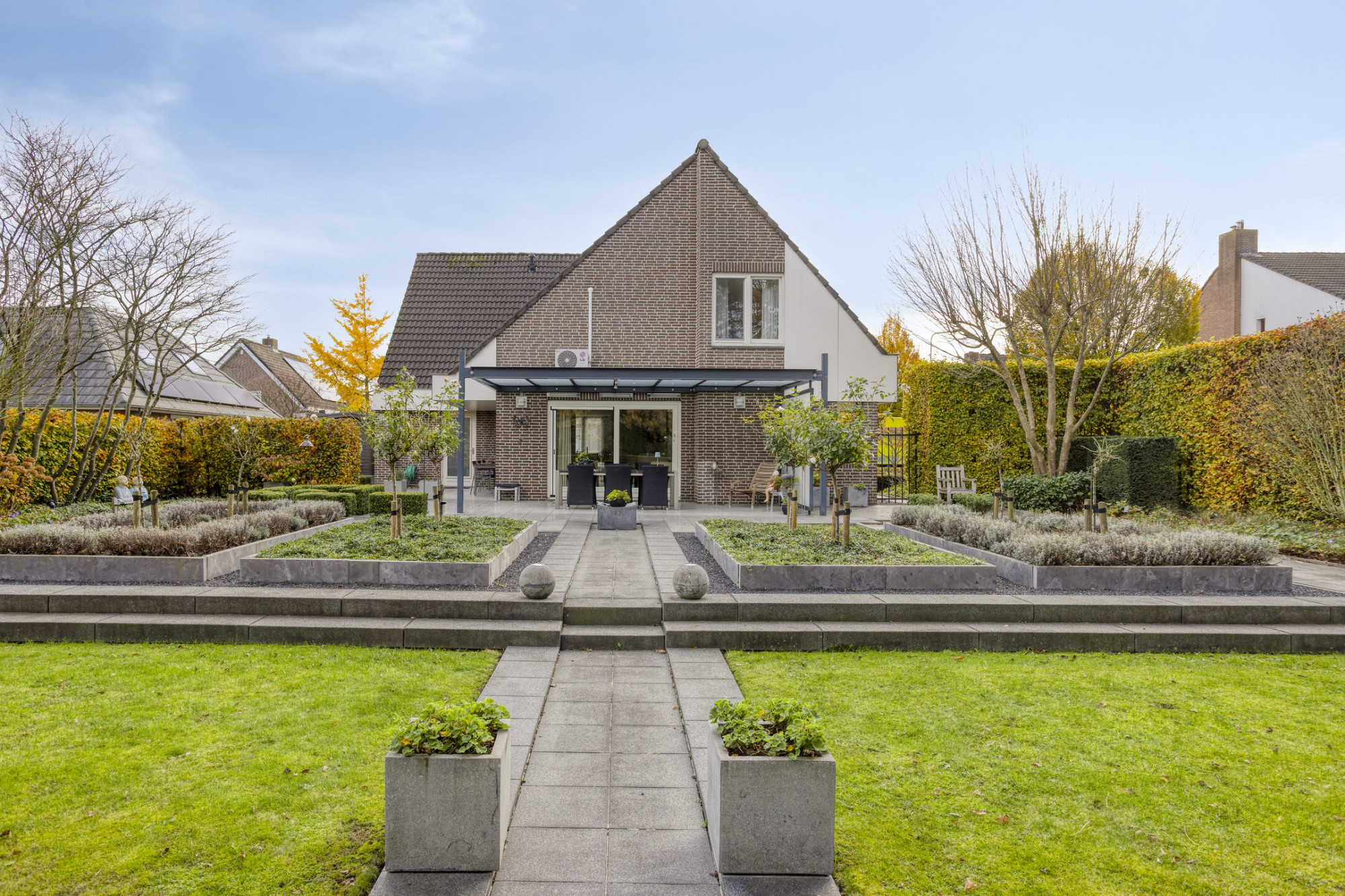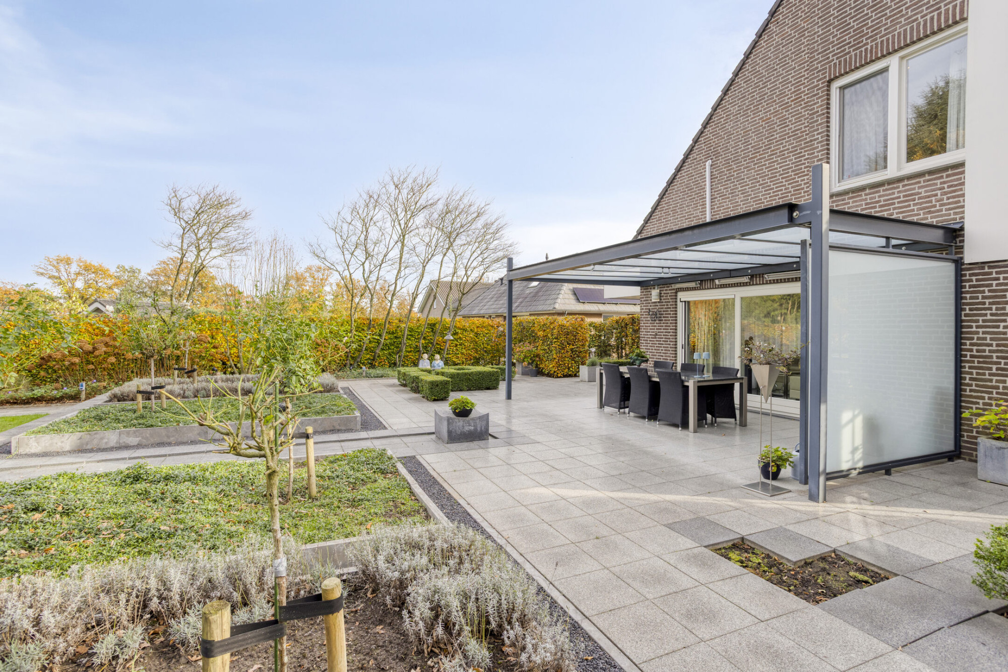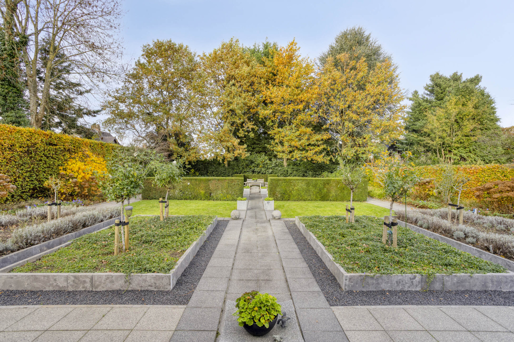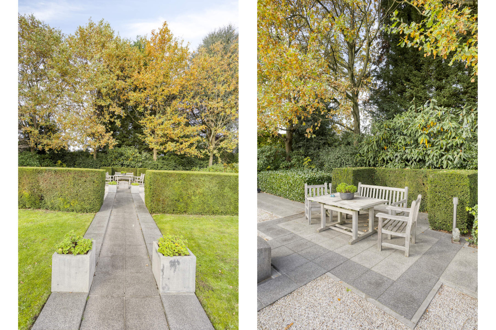 De fraai aangelegde, parkachtige tuin biedt een oase van rust met volwassen beplanting, diverse terrassen, strak onderhouden gazonpartijen en beukenhagen. De dubbele zijtoegang aan weerszijden van de woning biedt extra gemak; aan de rechterzijde bevinden zich twee houten tuinbergingen (2.96 x 1.94 m).