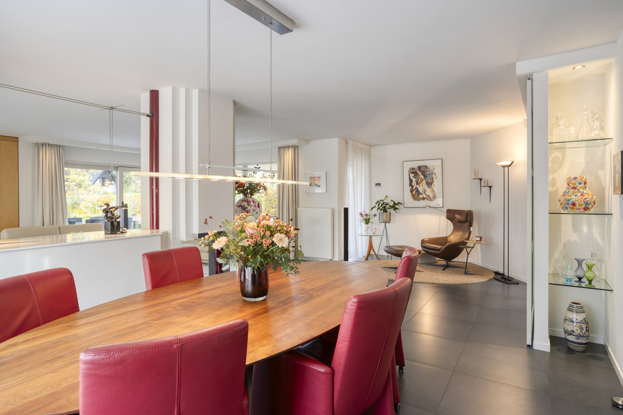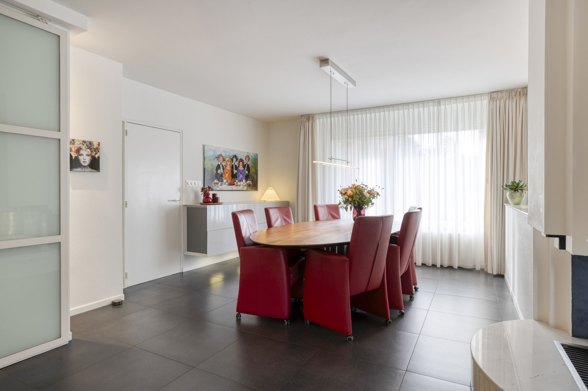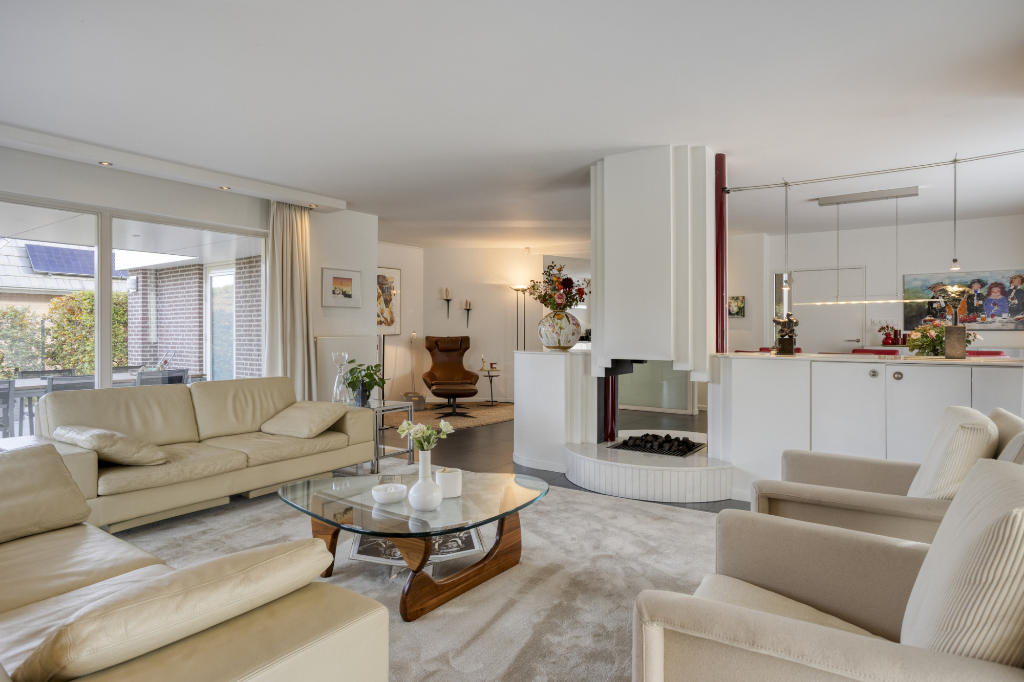 De speels ingedeelde leefruimte is afgewerkt met een plavuizenvloer voorzien van vloerverwarming en bestaat uit een royale eethoek (8.19 x 4.10 m) met sfeervolle schouwpartij/roomdivider met gashaard, en een uitnodigende woonkamer (5.97 x 5.07 m) met maatwerk kastenwand. Via de schuifpui is er directe toegang tot het verwarmde, overdekte terras ( 6.34 x 2.93 m) aan de achterzijde, evenals een tweede overdekt terras (5.07 x 2.27 m) aan de rechterzijde.