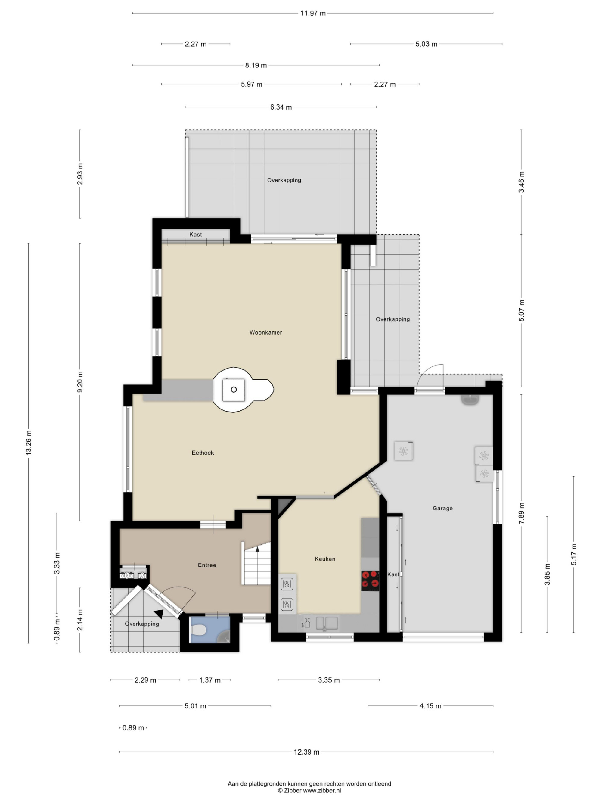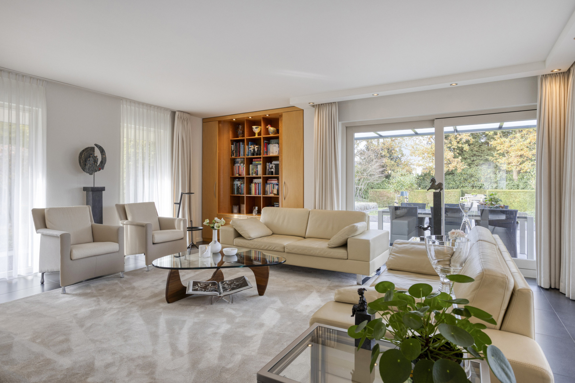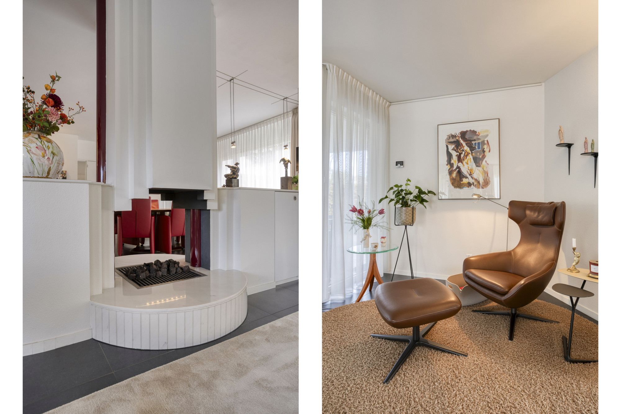 De speels ingedeelde leefruimte is afgewerkt met een plavuizenvloer voorzien van vloerverwarming en bestaat uit een royale eethoek (8.19 x 4.10 m) met sfeervolle schouwpartij/roomdivider met gashaard, en een uitnodigende woonkamer (5.97 x 5.07 m) met maatwerk kastenwand. Via de schuifpui is er directe toegang tot het verwarmde, overdekte terras ( 6.34 x 2.93 m) aan de achterzijde, evenals een tweede overdekt terras (5.07 x 2.27 m) aan de rechterzijde.