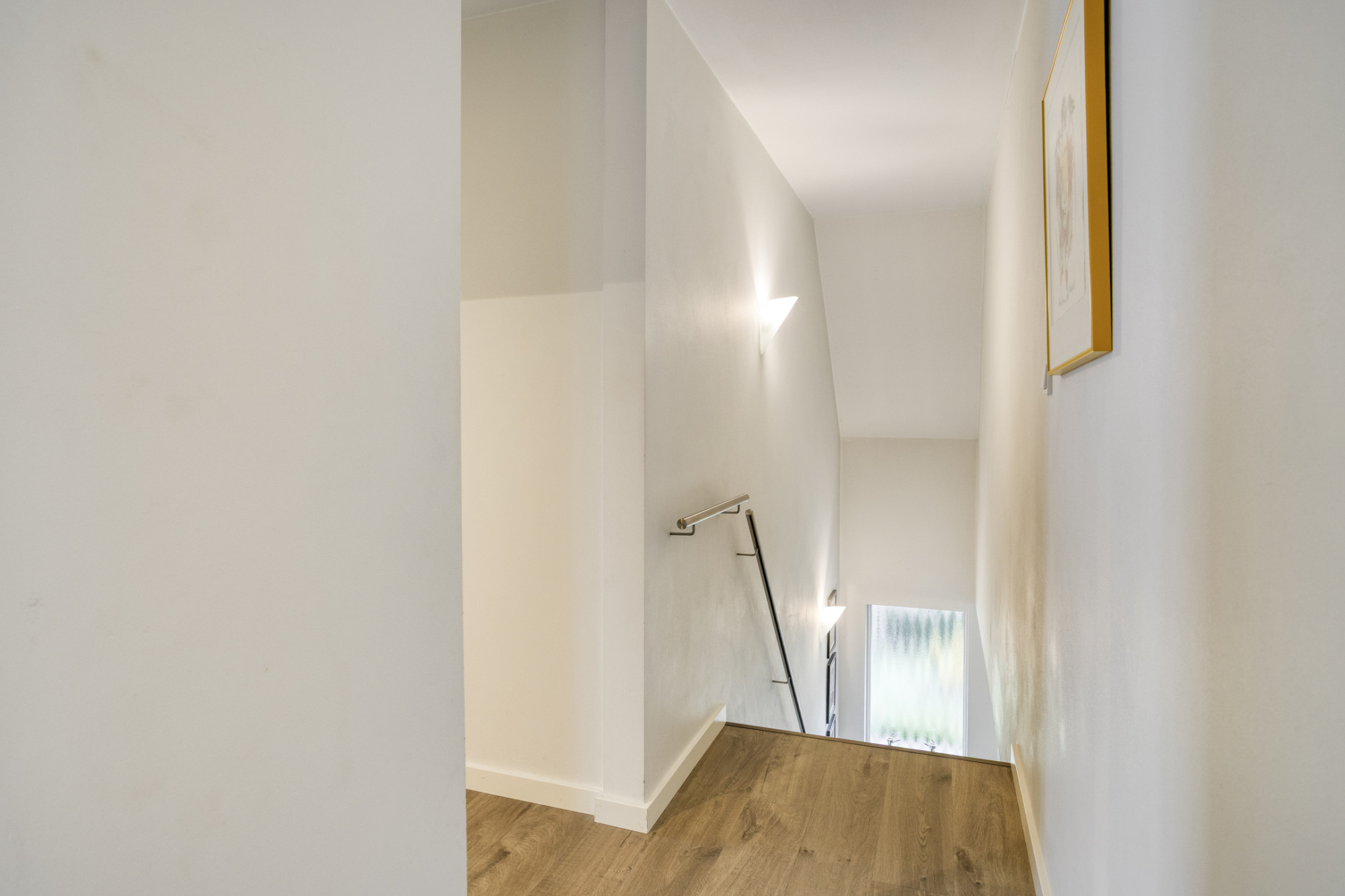 De open trap leidt naar een royale overloop met doorlopende laminaatvloer.