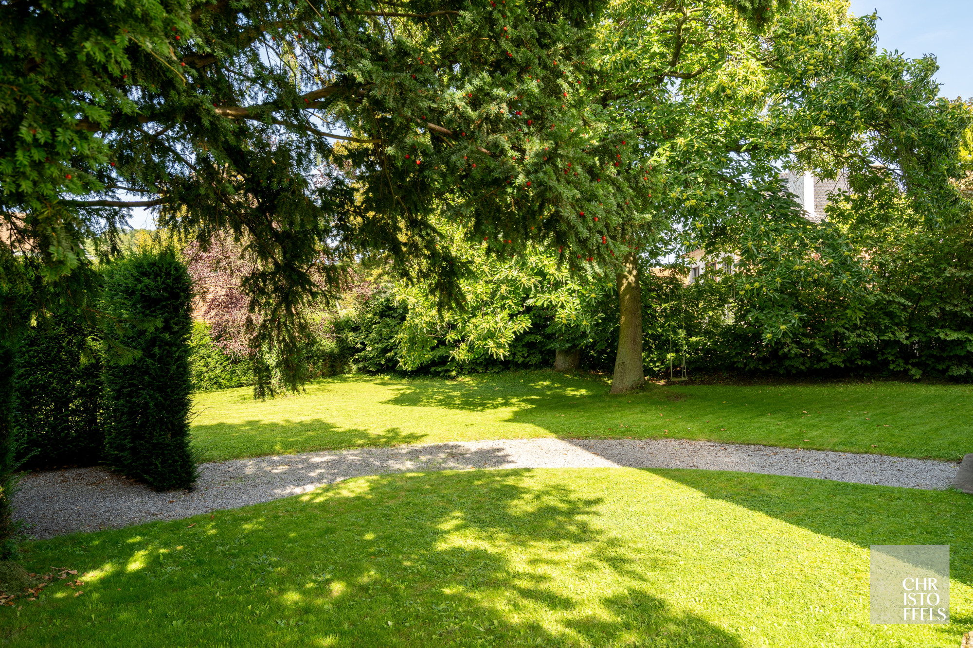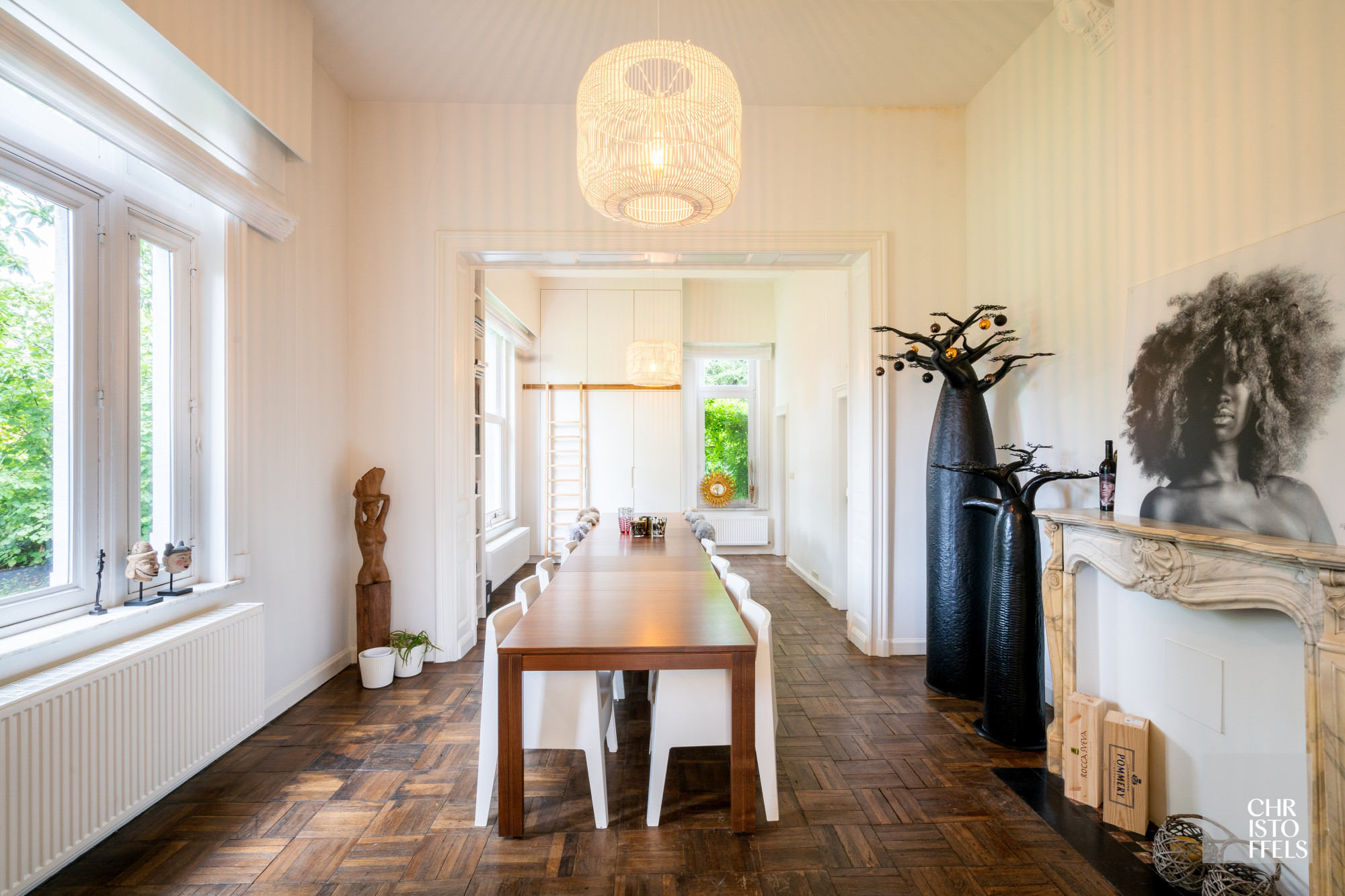 Op het gelijkvloers is er de inkomhal met gastentoilet en vestiaire. Aansluitend bevindt zich het bureel, de leefruimte met een karaktervolle parketvloer, de ruime eetkamer, wasplaats en 2 keukens waarvan nog 1 keuken te installeren. Verder is er toegang tot een nog aan te leggen terras met zicht op de tuin.