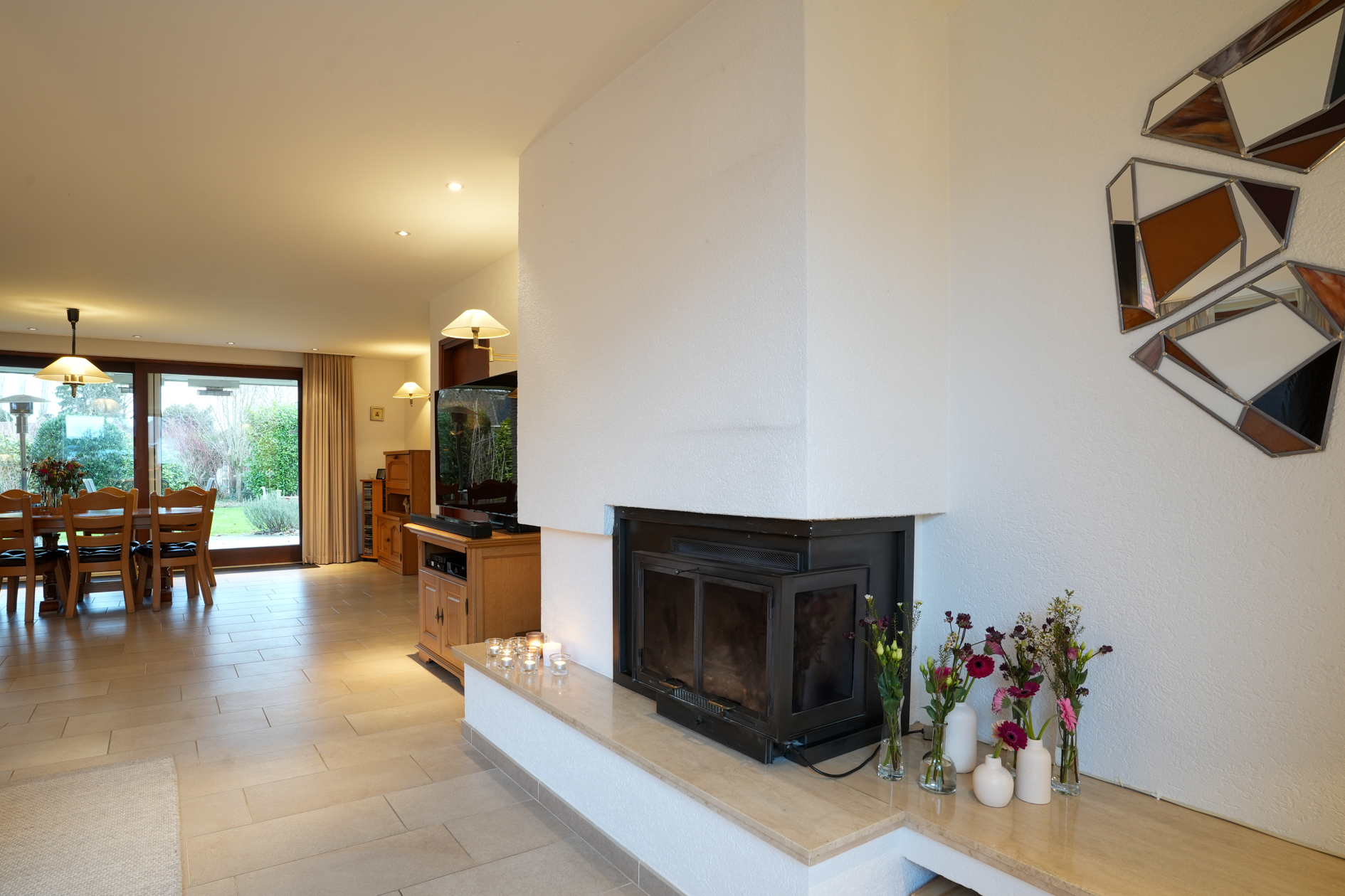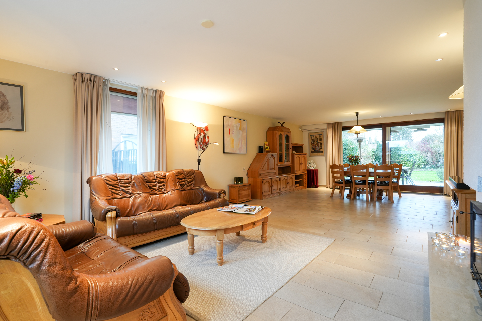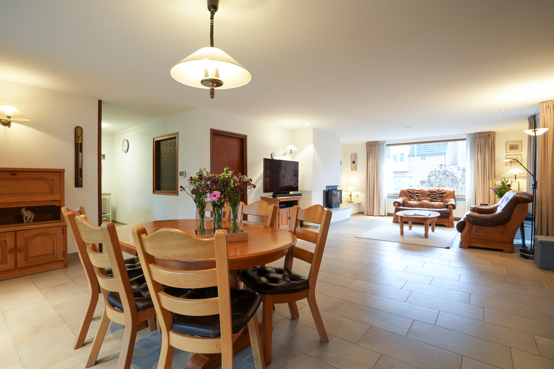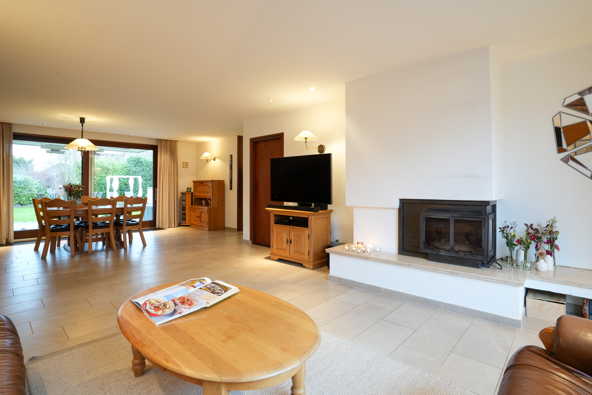 De woonkamer is voorzien van grote ramen, een open haard en tegelvloer op betonvloer. Middels een schuifpui is er toegang naar het overdekte terras (met verwarming) en tuin. De doorloop in de woonkamer verschaft toegang tot de halfopen woonkeuken welke is voorzien van inbouwapparatuur.