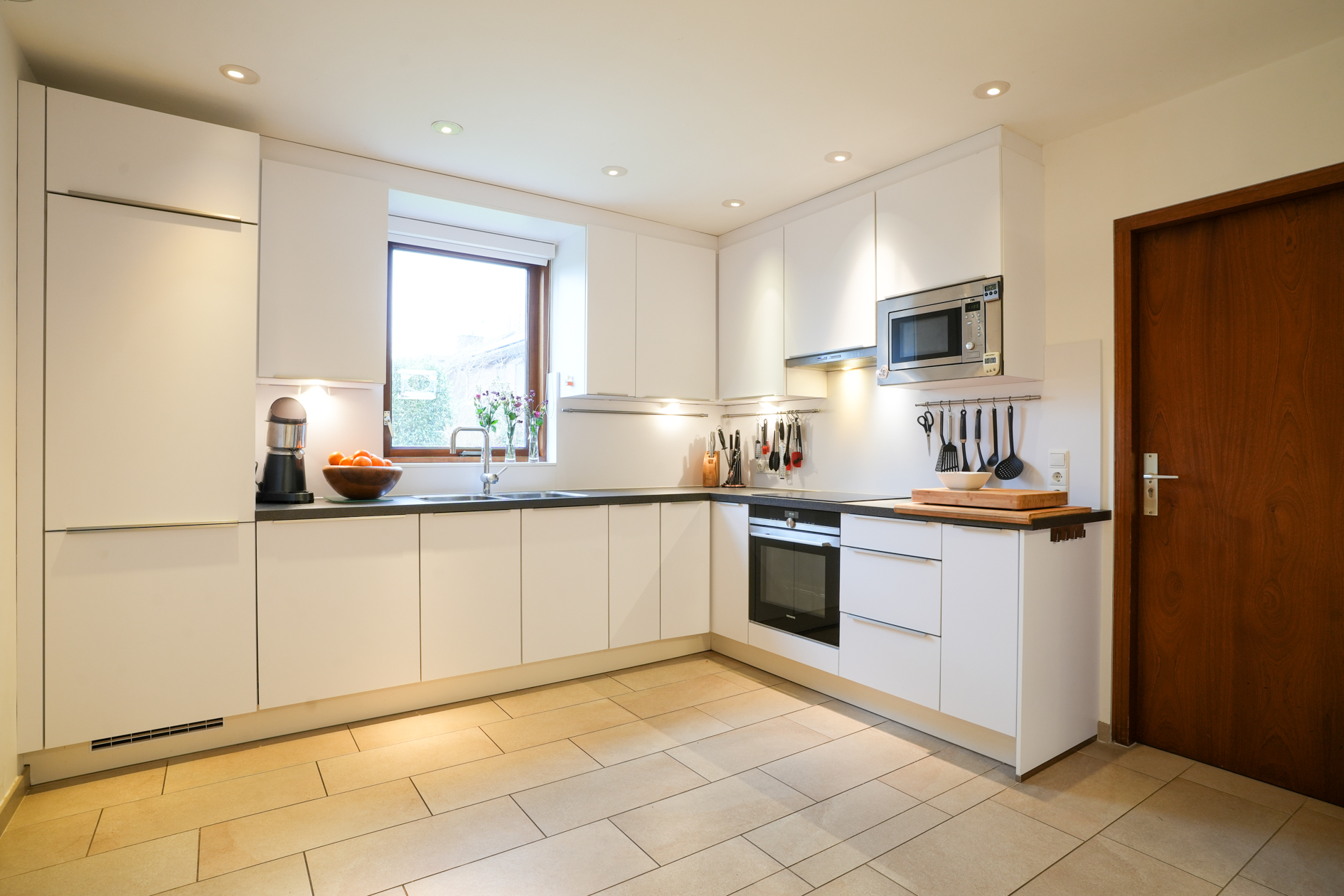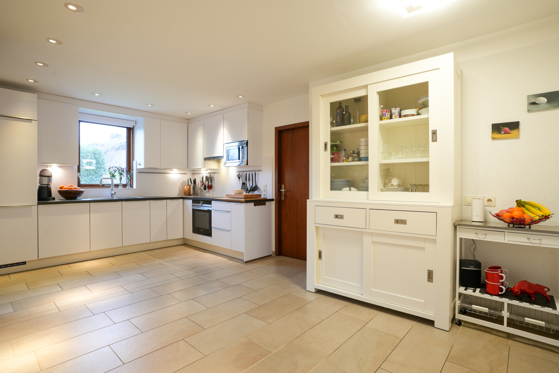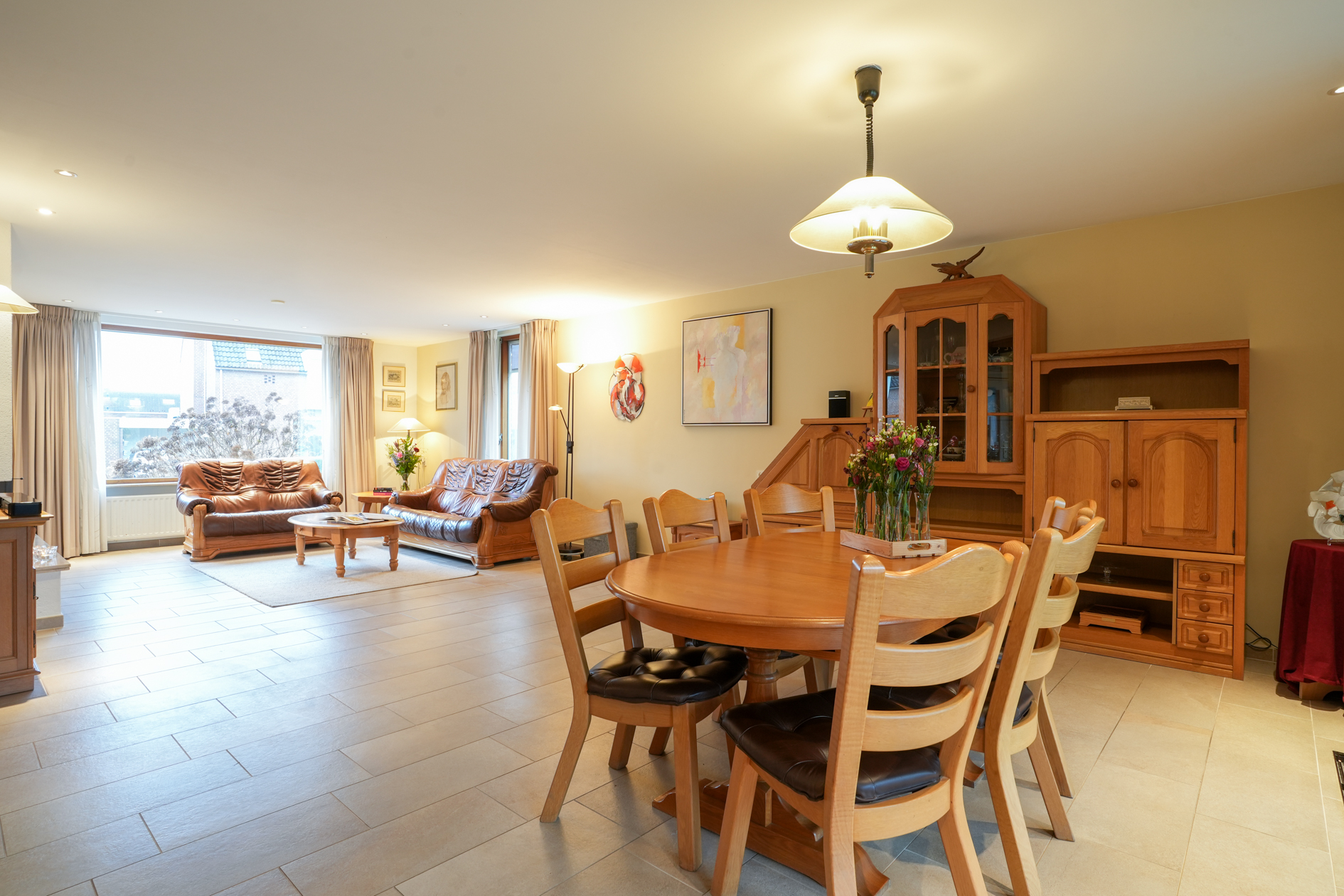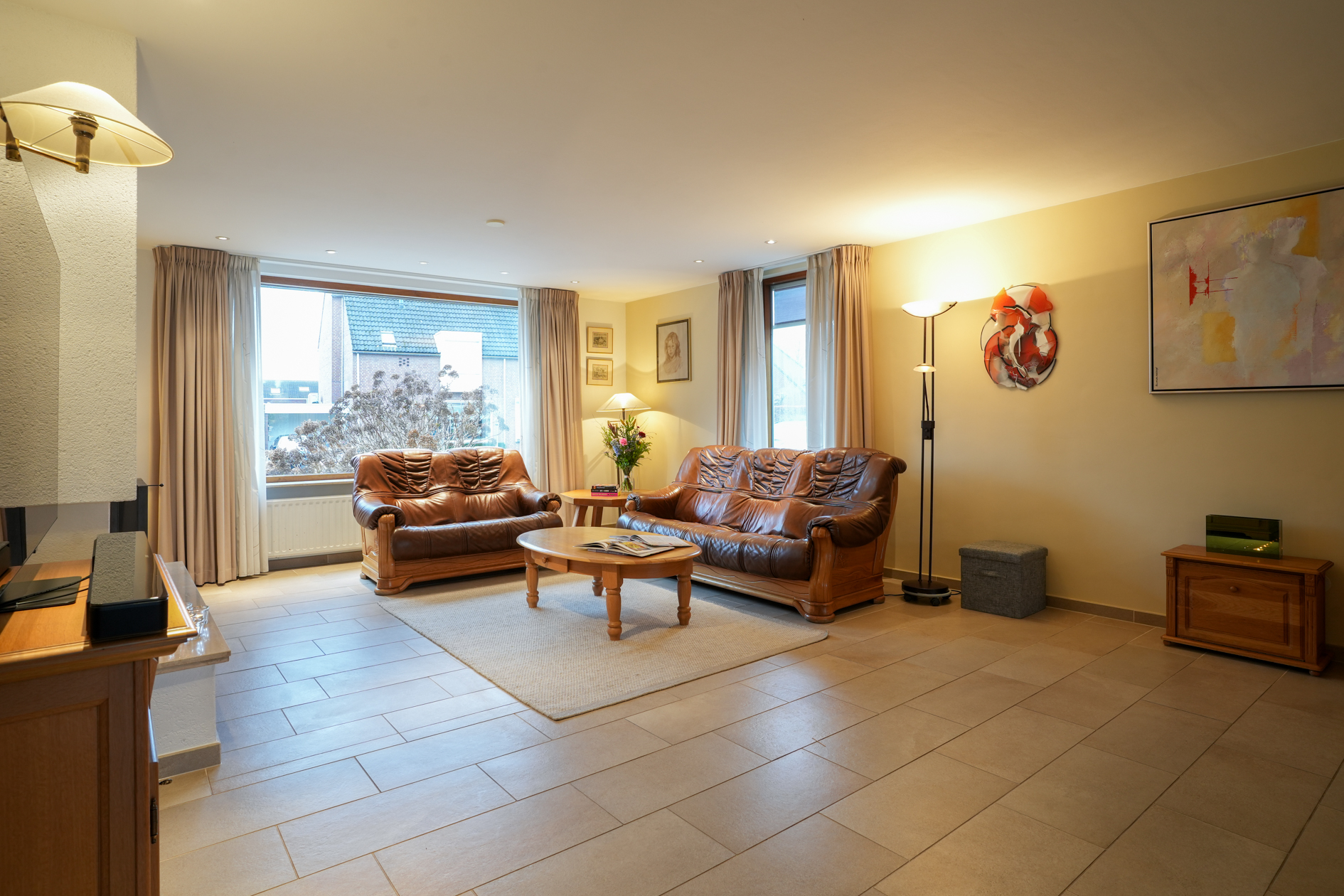 De woonkamer is voorzien van grote ramen, een open haard en tegelvloer op betonvloer. Middels een schuifpui is er toegang naar het overdekte terras (met verwarming) en tuin. De doorloop in de woonkamer verschaft toegang tot de halfopen woonkeuken welke is voorzien van inbouwapparatuur.