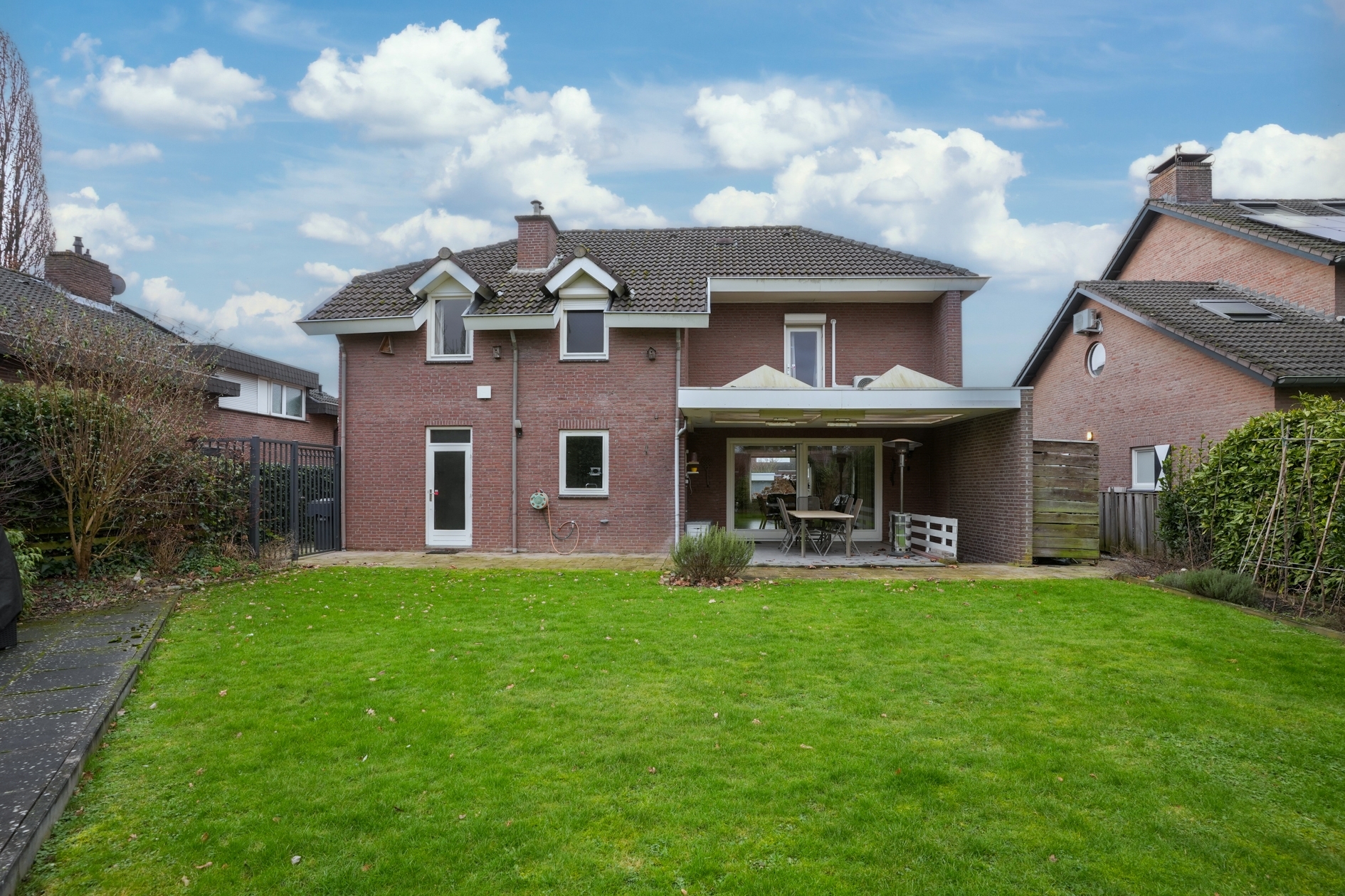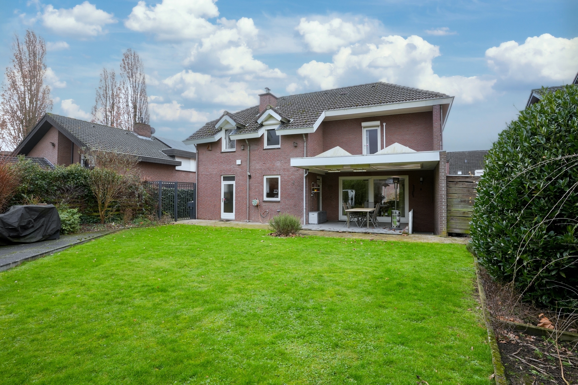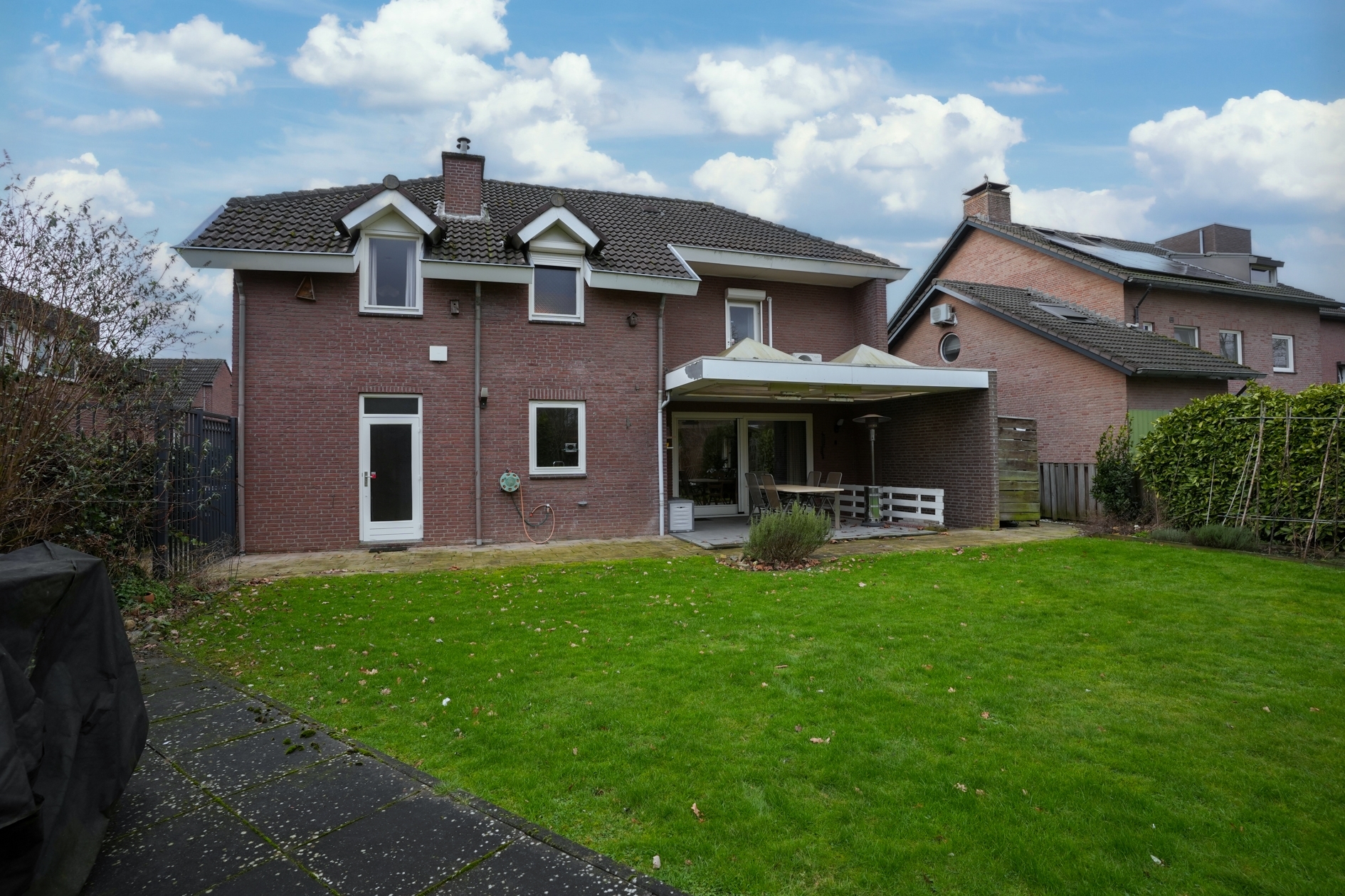 Mooie terrasoverkapping met verwarming, veel privacy.