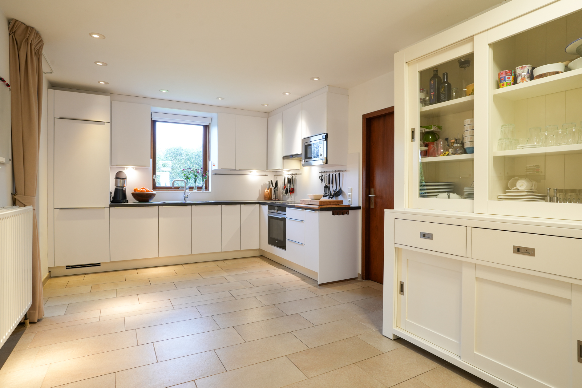 Vanuit de keuken loopt u door naar de bijkeuken en ruime garage (voorzien van elektrische garagepoort met loopdeur).