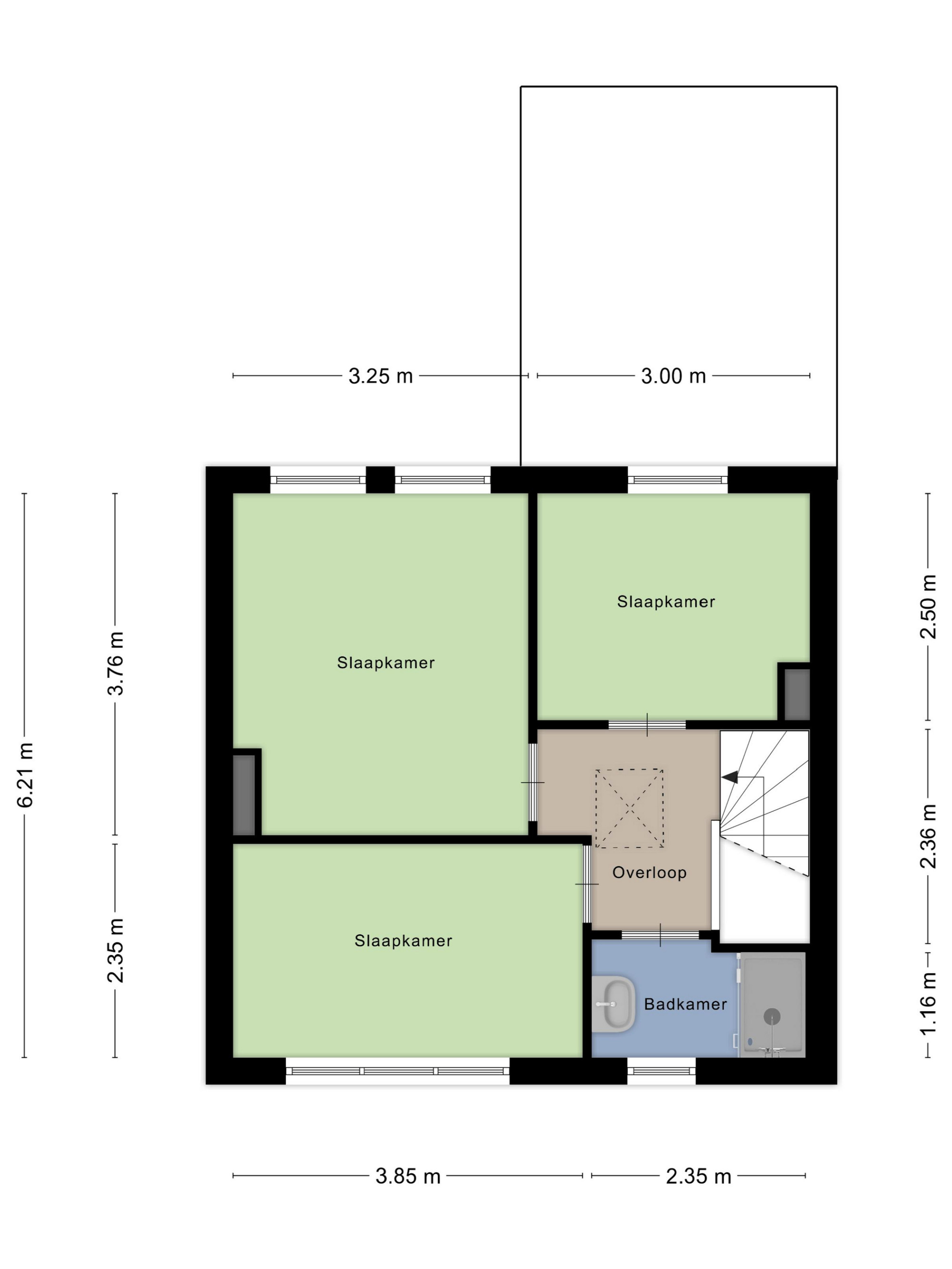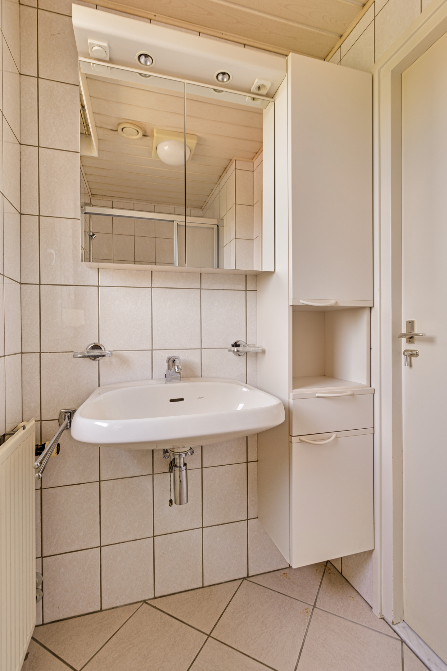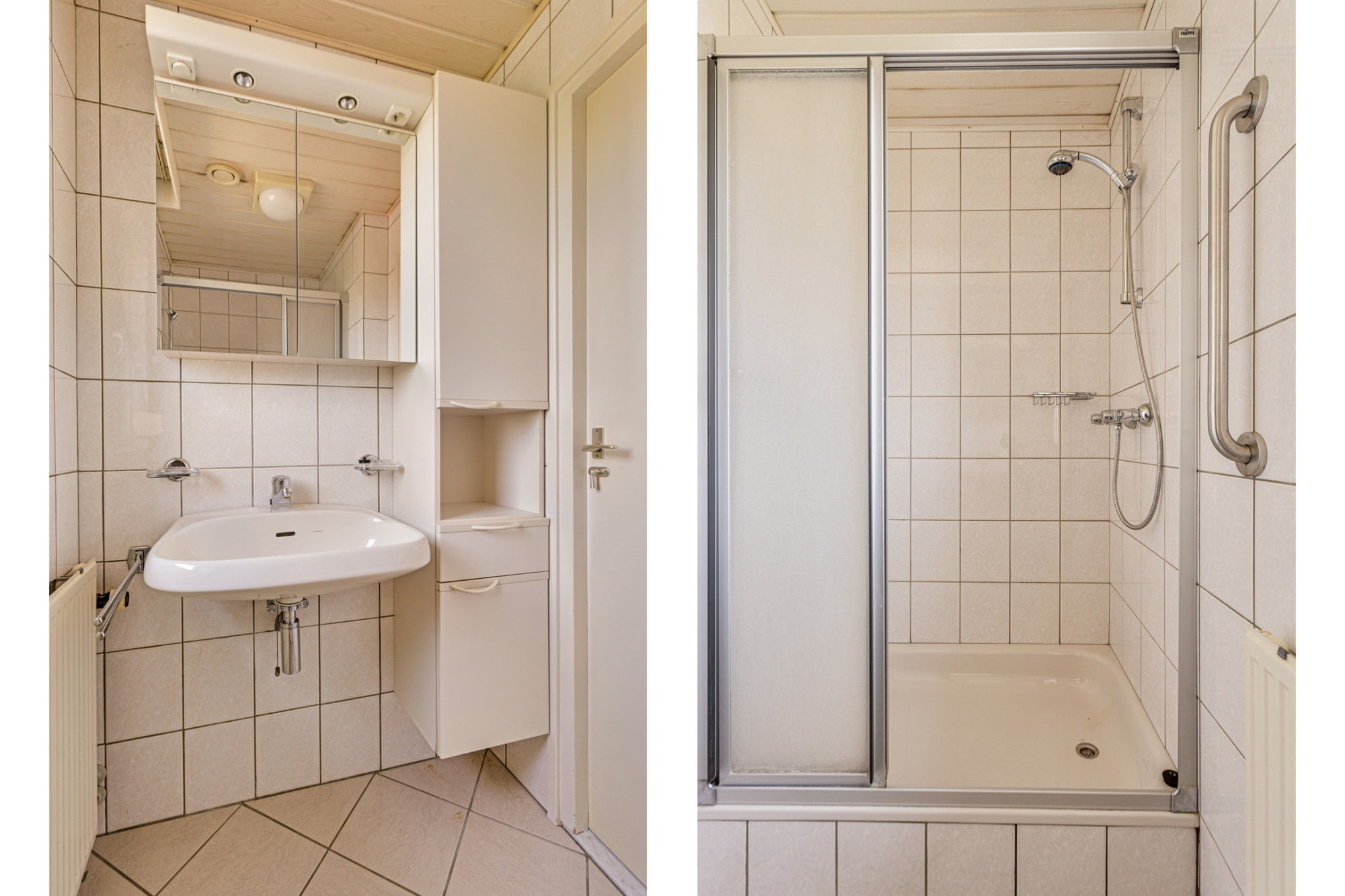 Overloop, drie slaapkamers, badkamer met douche cabine en vaste wastafel.