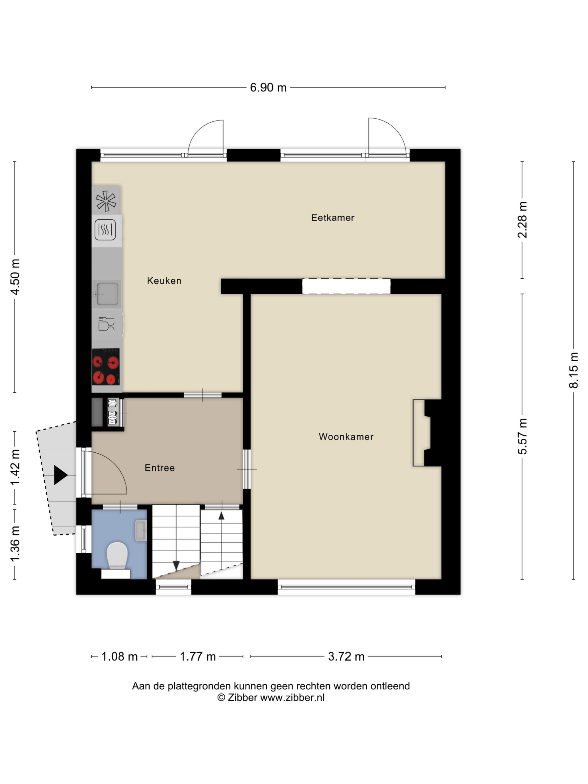 Hal, betegeld toilet met fonteintje, meterkast, woonkamer met open haard, eetkamer en open keuken met functionele keukeninstallatie inclusief apparatuur, garage.