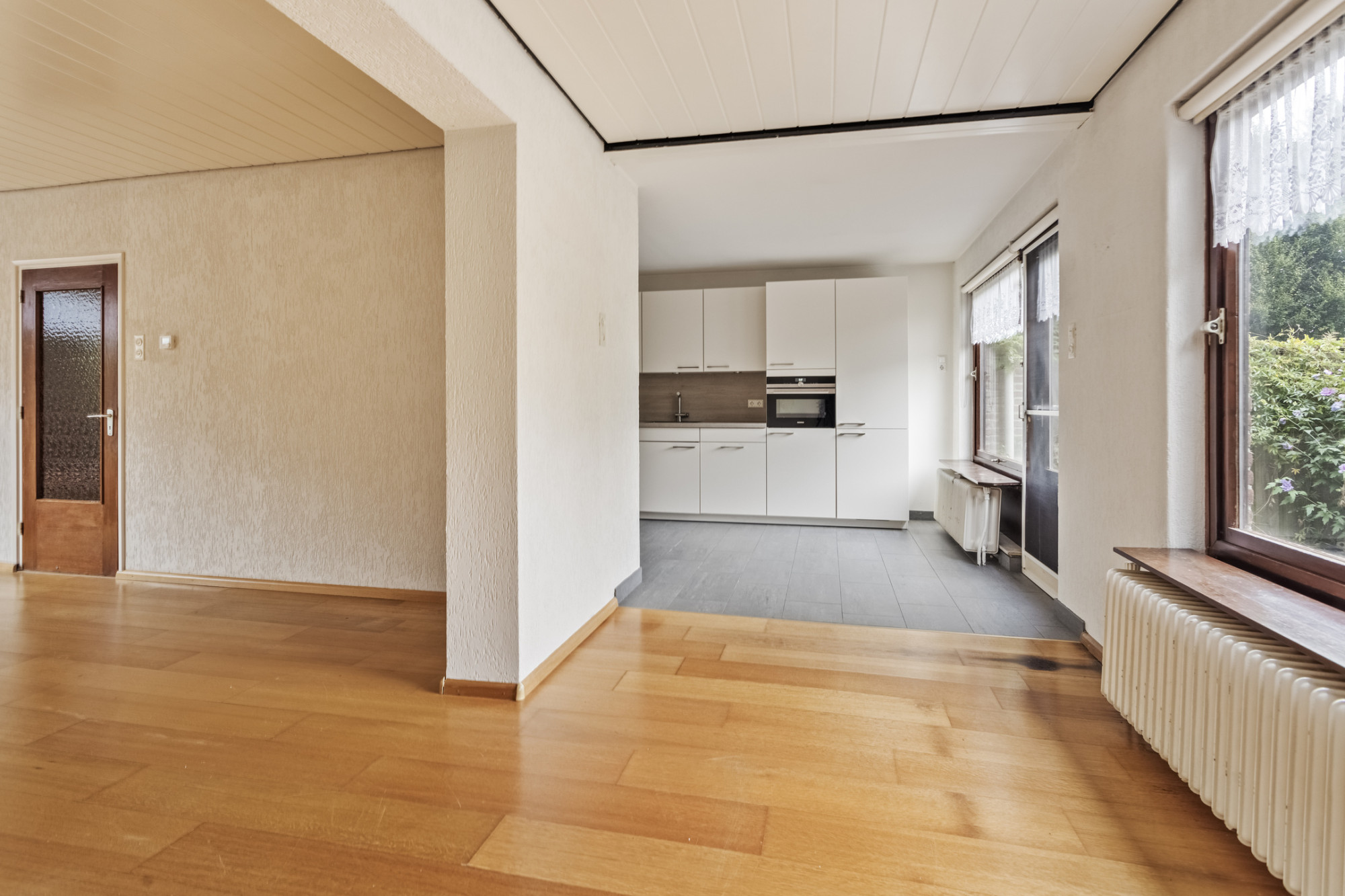 NABIJ CENTRUM VAN BEEK UITSTEKEND GELEGEN TE MODERNISEREN TWEE ONDER EEN KAP WONING MET AANBOUW, GARAGE EN TUIN.