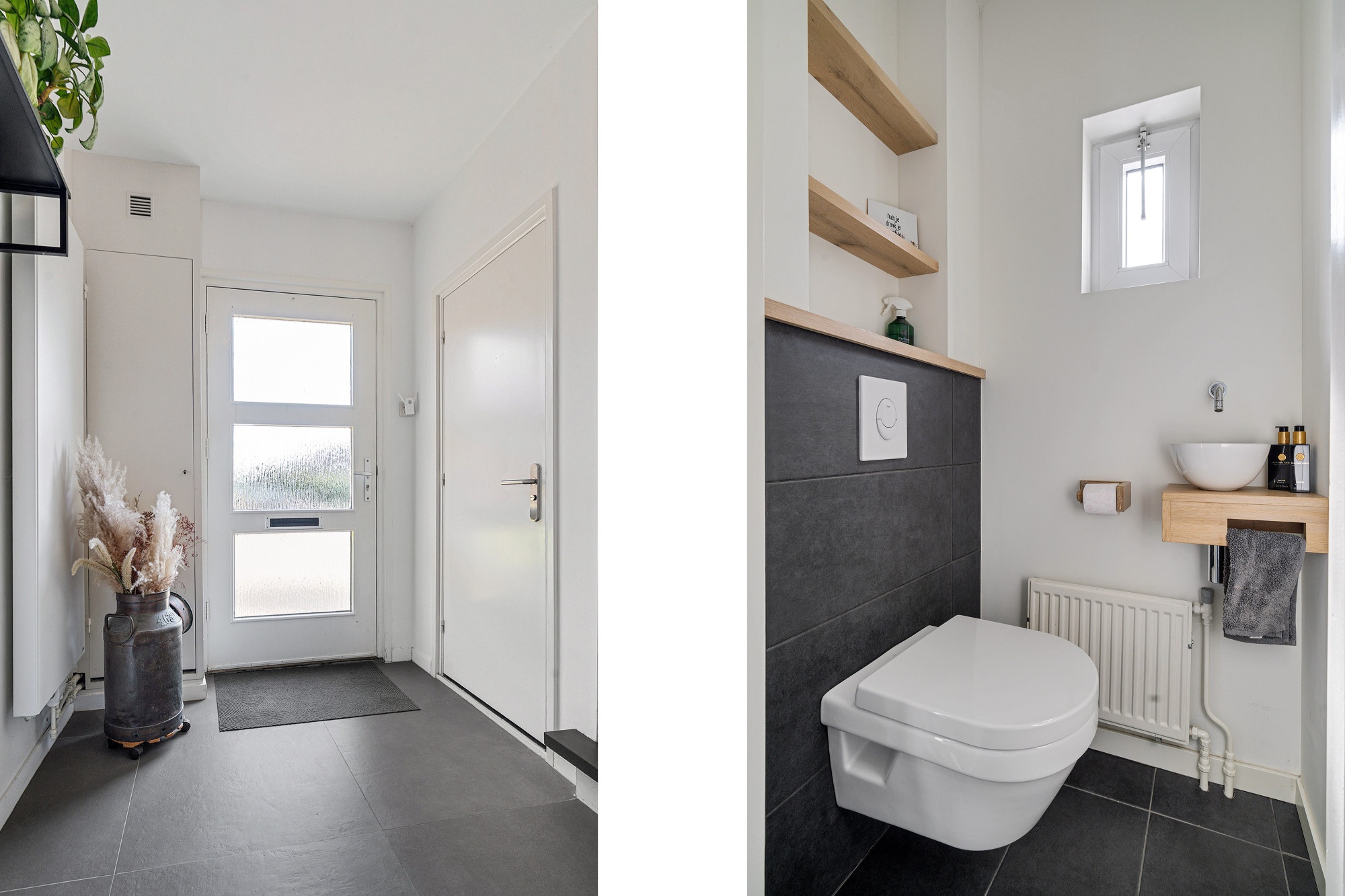 Via de nette entree komt u in de hal met garderobe, meterkast, trap naar de kelder en eerste verdieping, en een modern toilet met fontein. Vanuit de hal bereikt u de ruime en lichte living van circa 33 m² en de eetkamer.