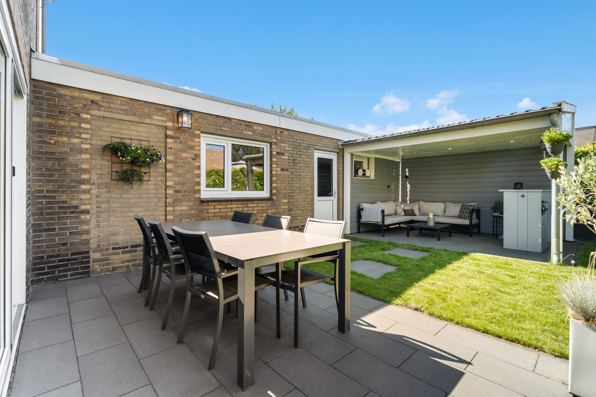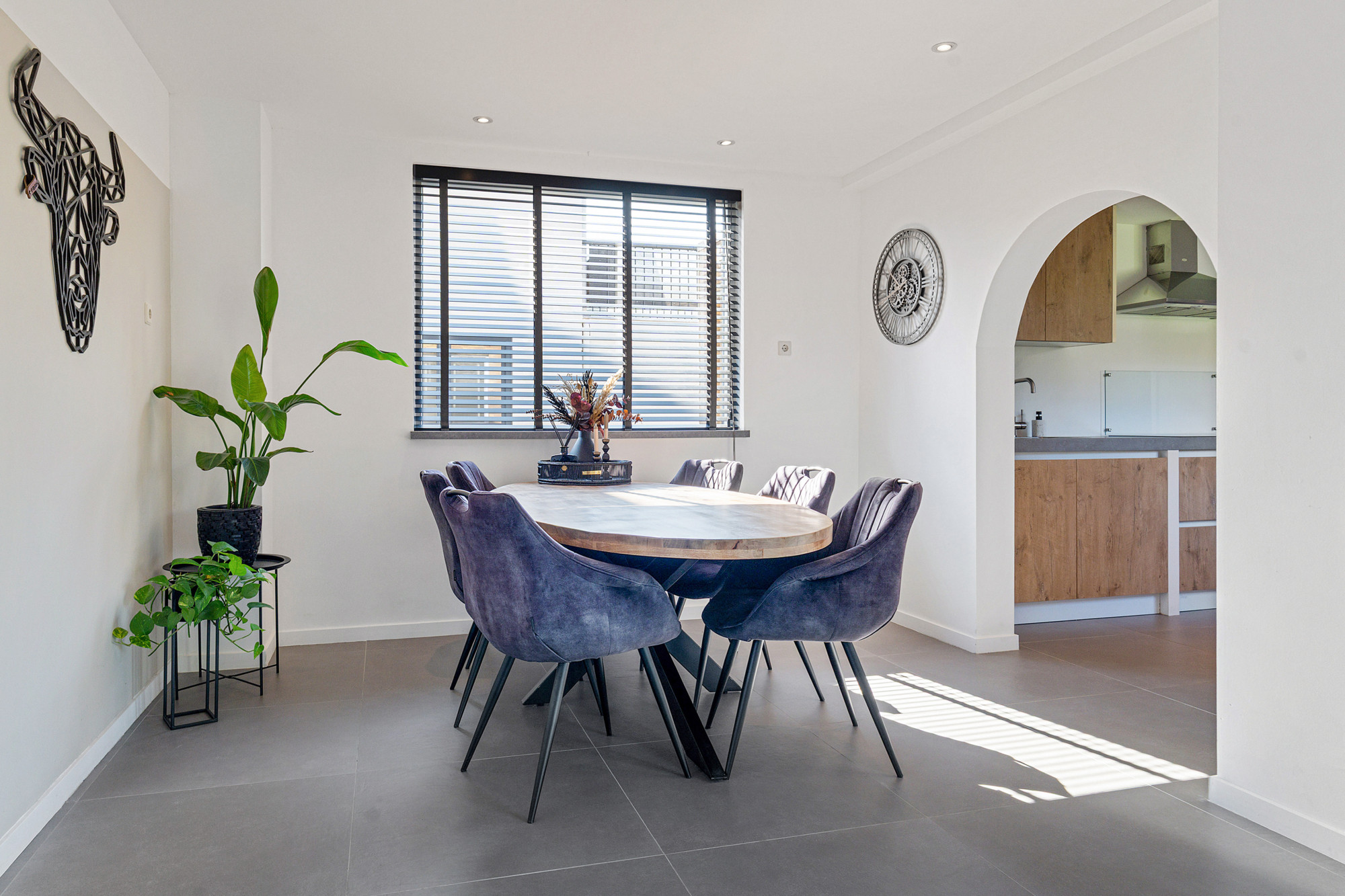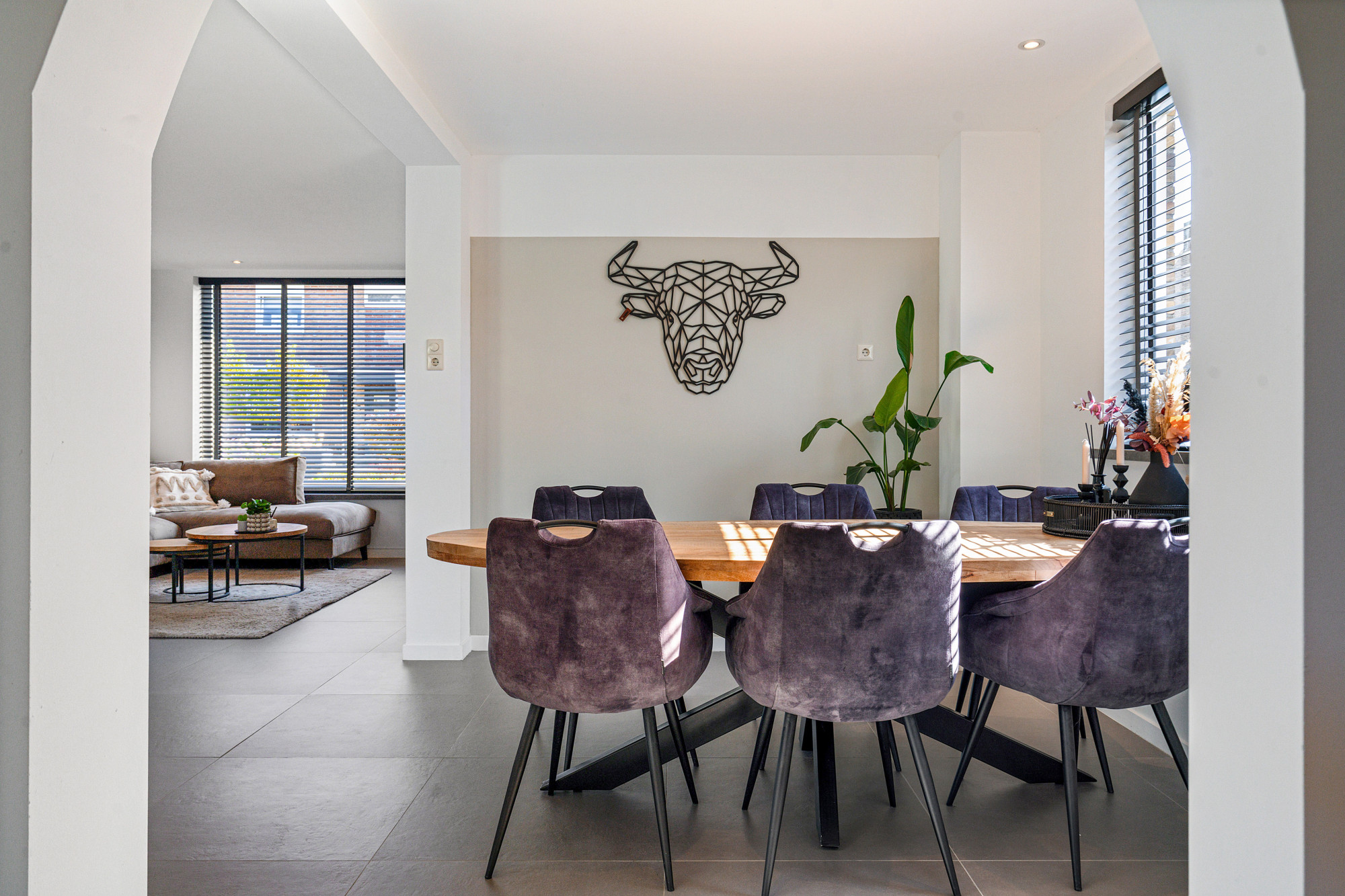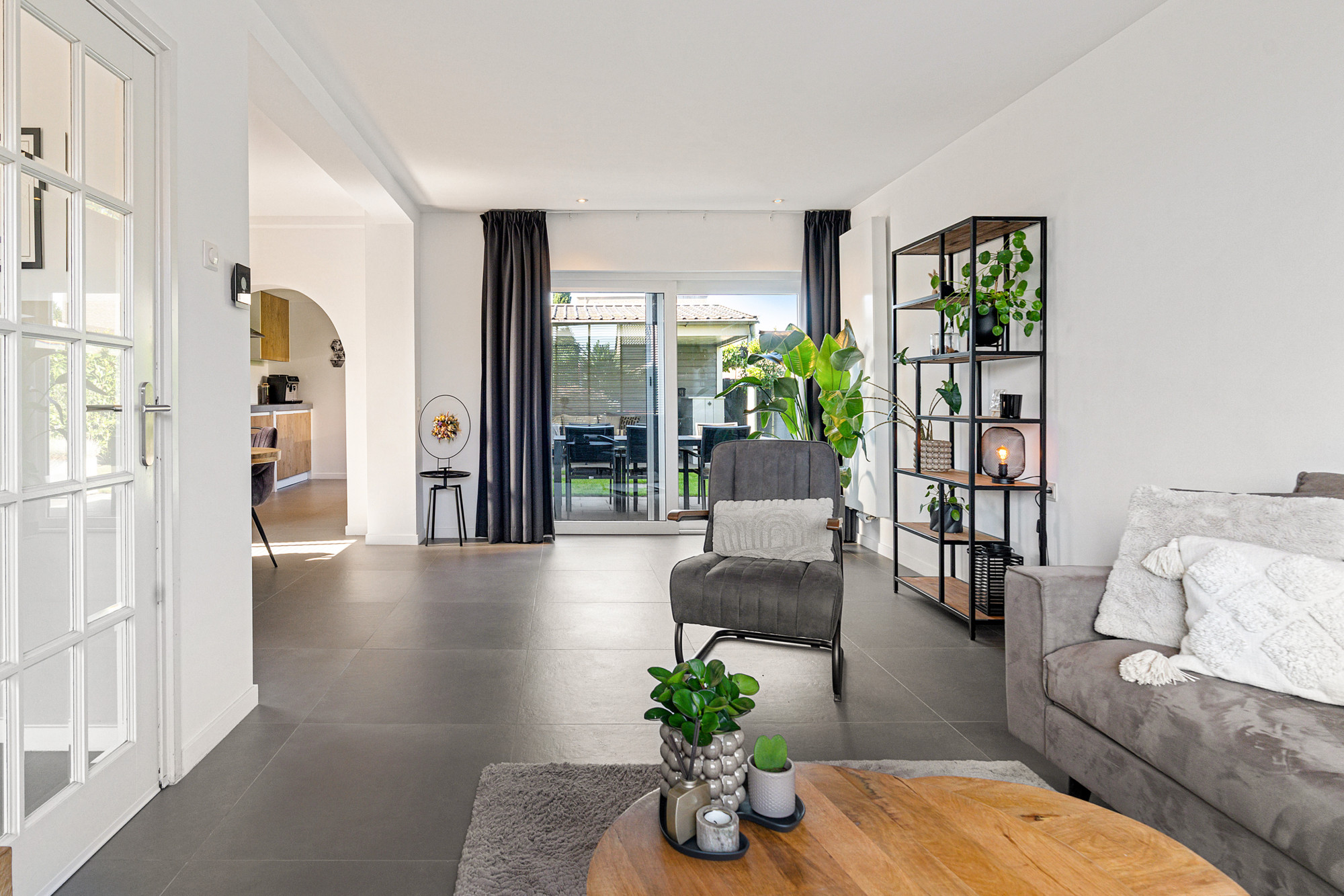 Dankzij de schuifpui naar de tuin en de doorloop naar de keuken voelt deze ruimte heerlijk open.