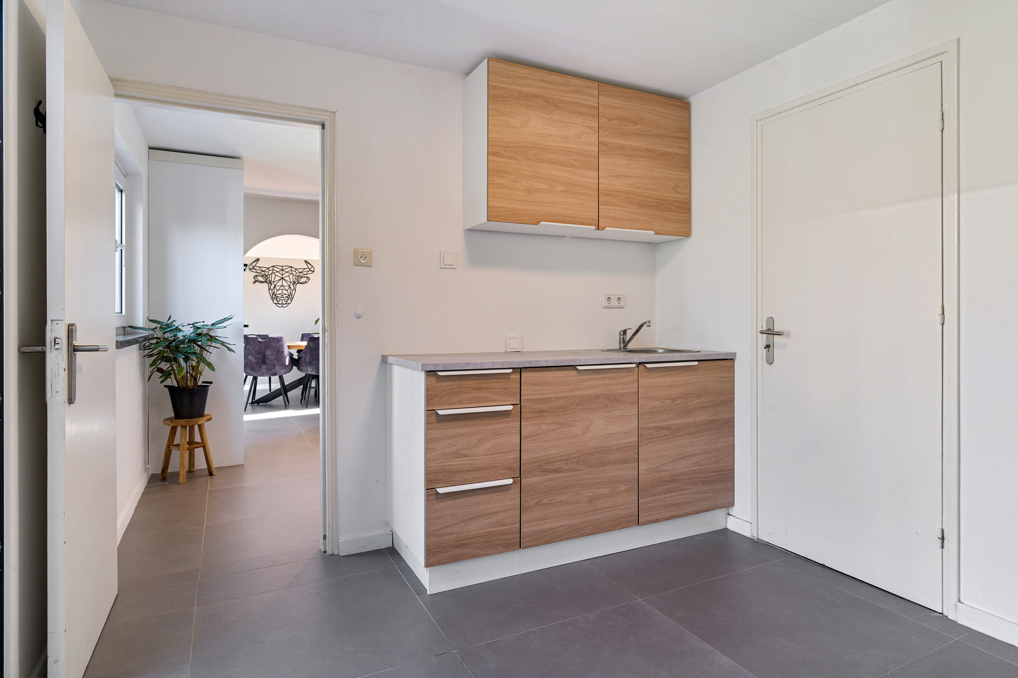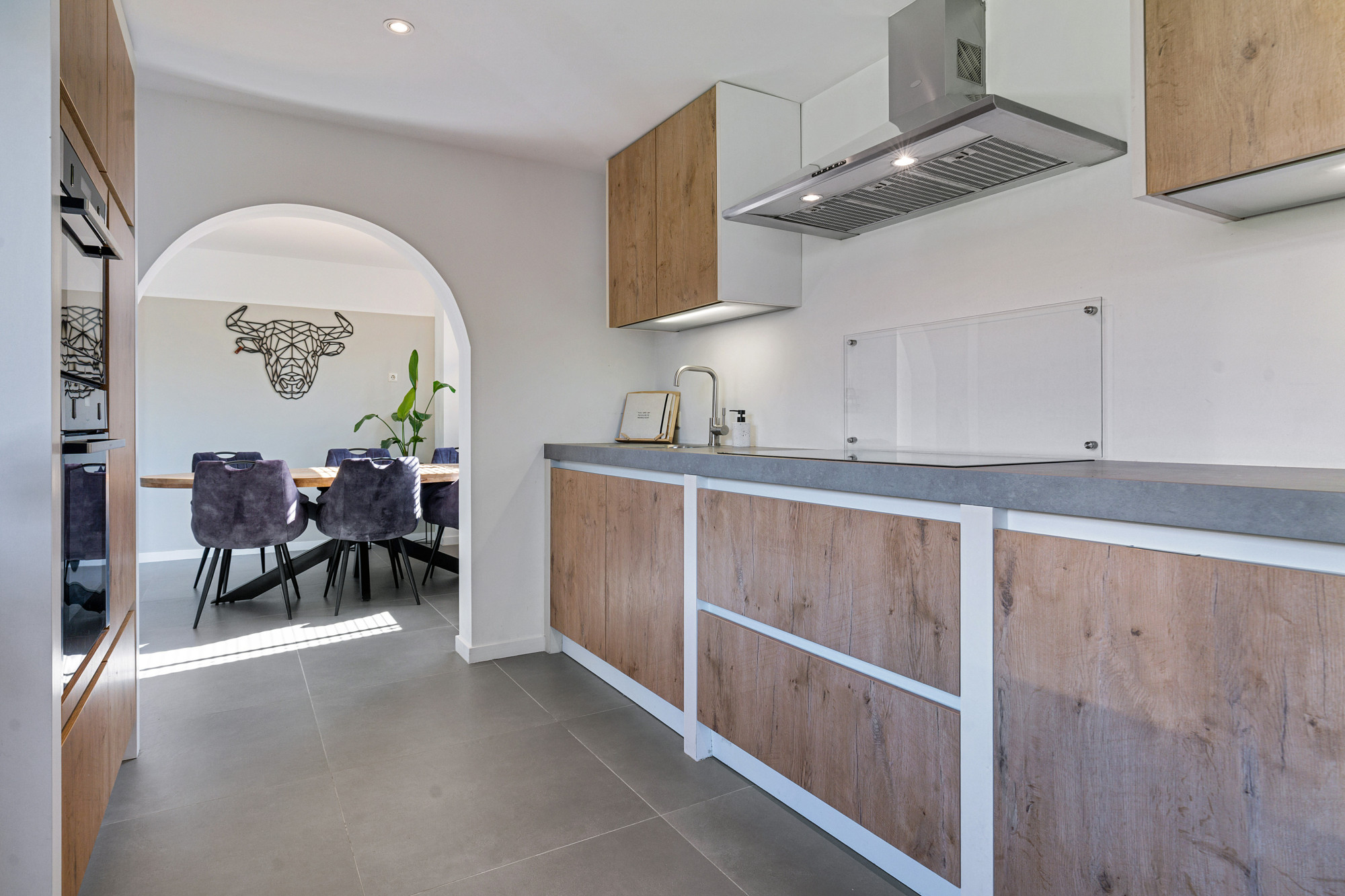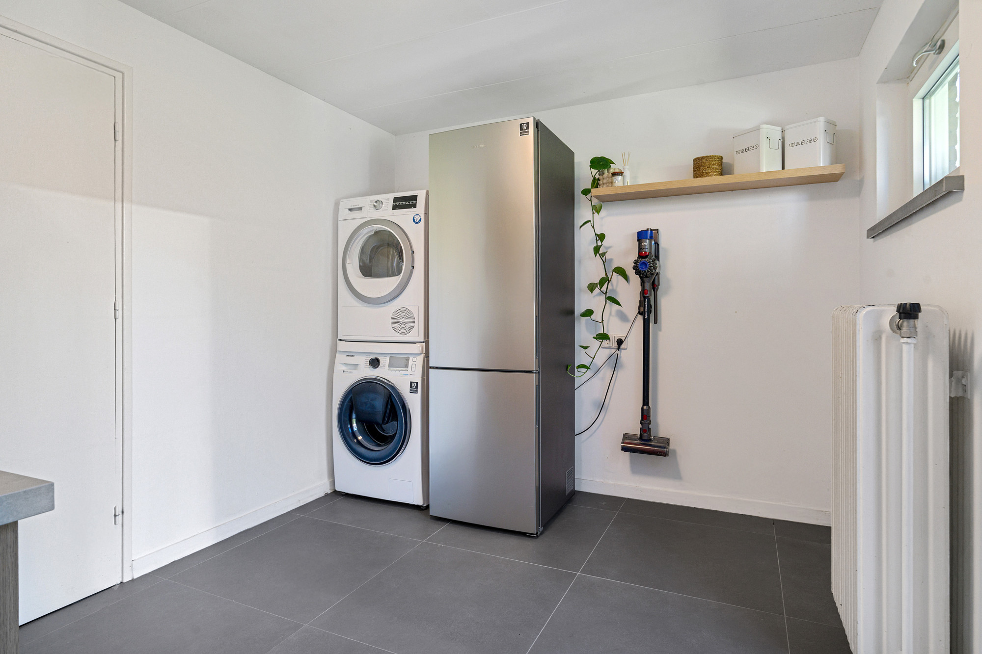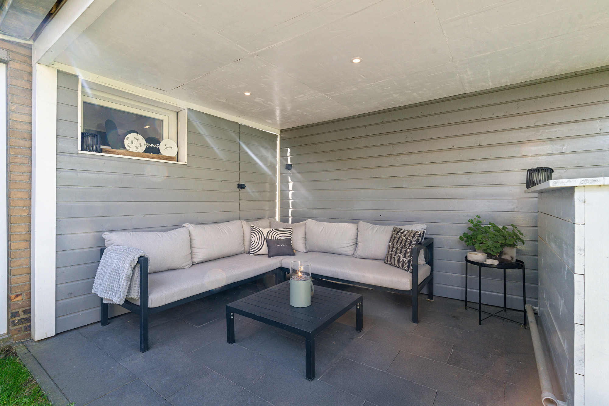 Dankzij de schuifpui naar de tuin en de doorloop naar de keuken voelt deze ruimte heerlijk open.