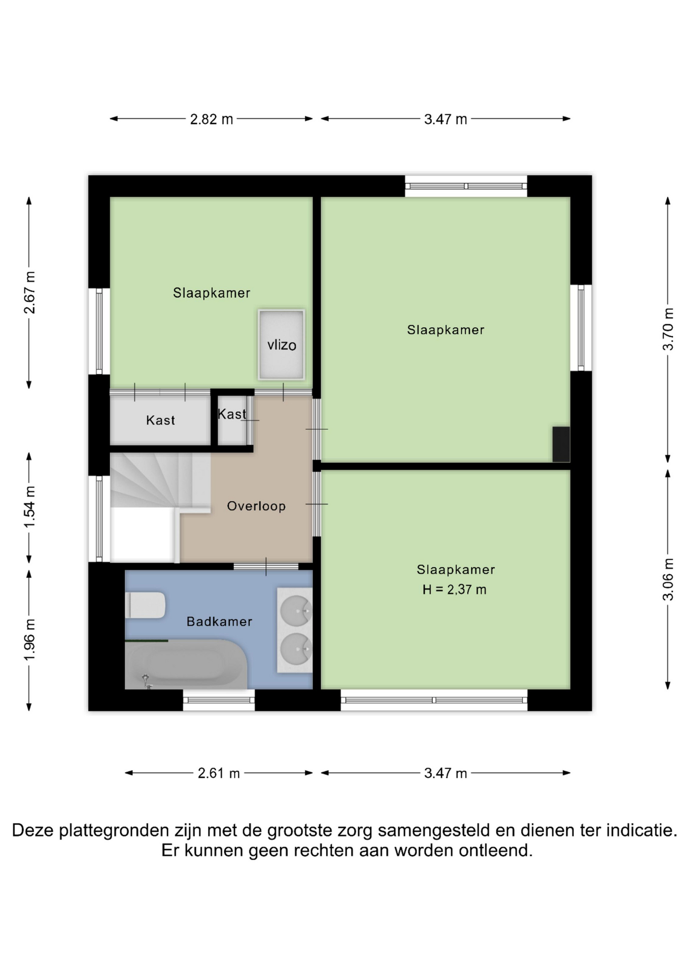 Alle door ons kantoor verstrekte informatie omtrent onroerende zaken, moet beschouwd worden als een uitnodiging om in onderhandeling te treden, en is geheel vrijblijvend! Alle vermelde maten en afmetingen zijn slechts bij benadering. Aan deze beperkte informatie kunnen geen rechten worden ontleend. Indien in enige documentatie of op enige website informatie staat die niet overeen komt met de werkelijkheid, dan geldt de feitelijke situatie waarin de woning zich bevindt, zoals koper deze tijdens de bezichtiging heeft kunnen waarnemen, en wordt de woning in deze feitelijke situatie/staat verkocht. Een (eventueel) bijgevoegde plattegrond dient uitsluitend als globale indicatie/visualisatie. Hieraan kunnen uitdrukkelijk geen rechten worden ontleend.