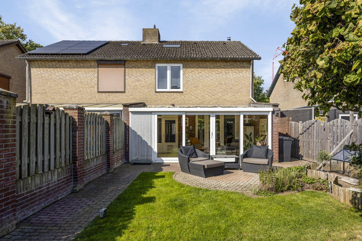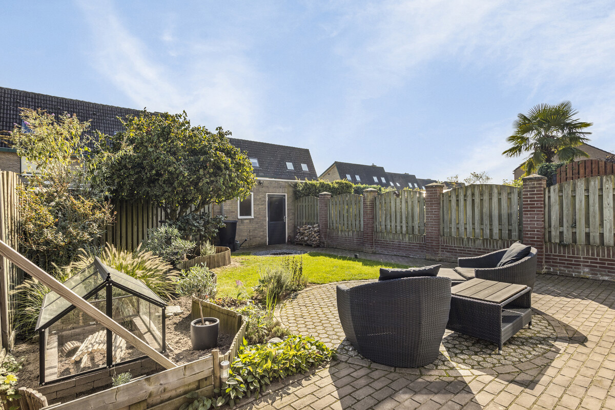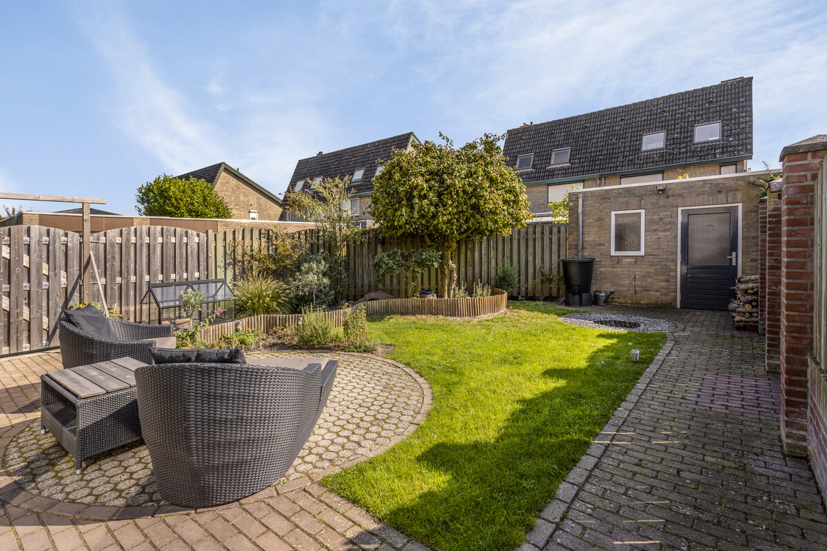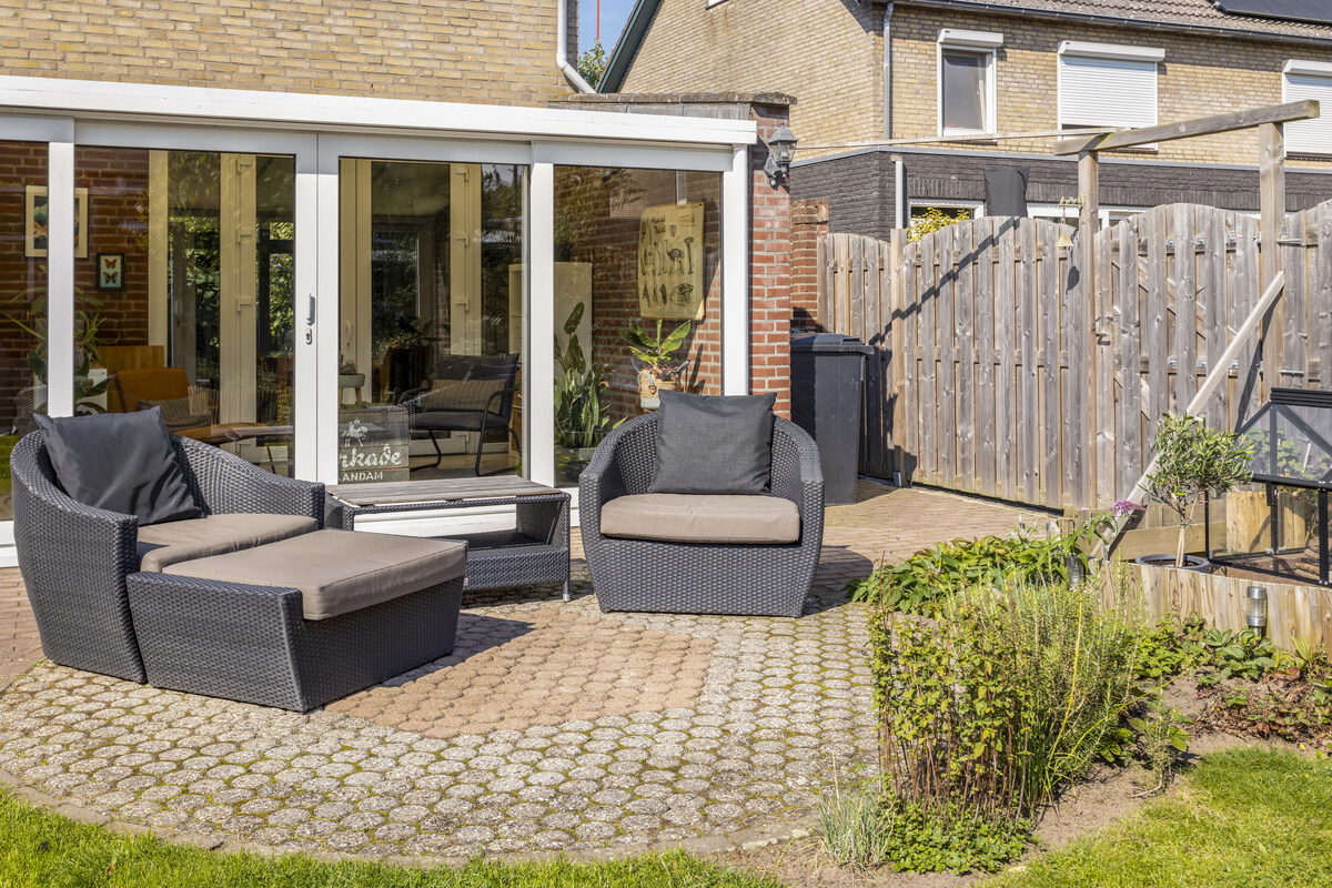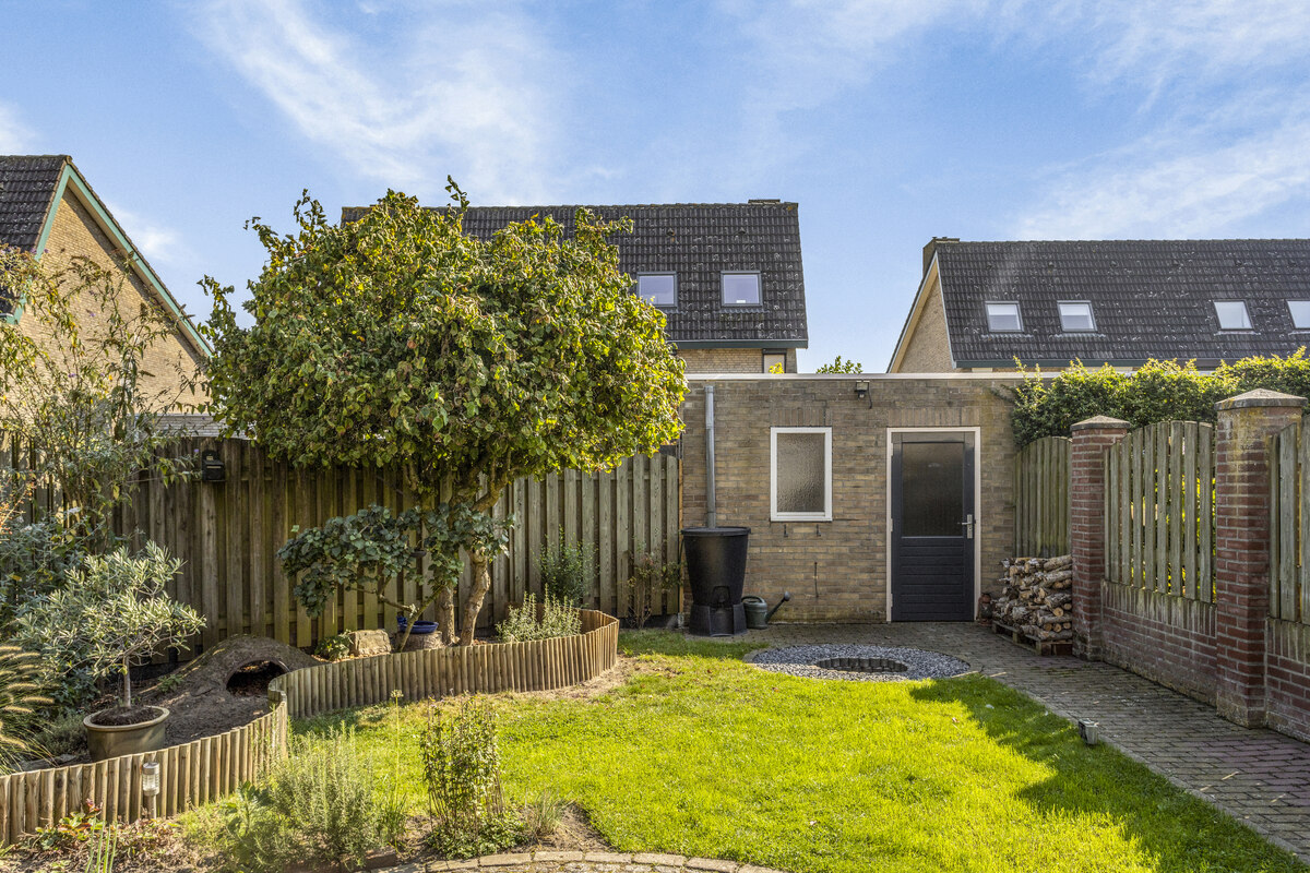 De tuin is netjes aangelegd en voorzien van een vrije achterom in de vorm van een brede poort.