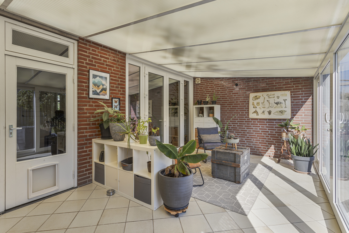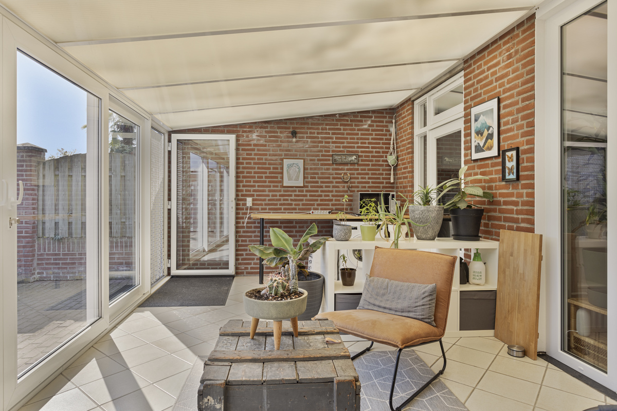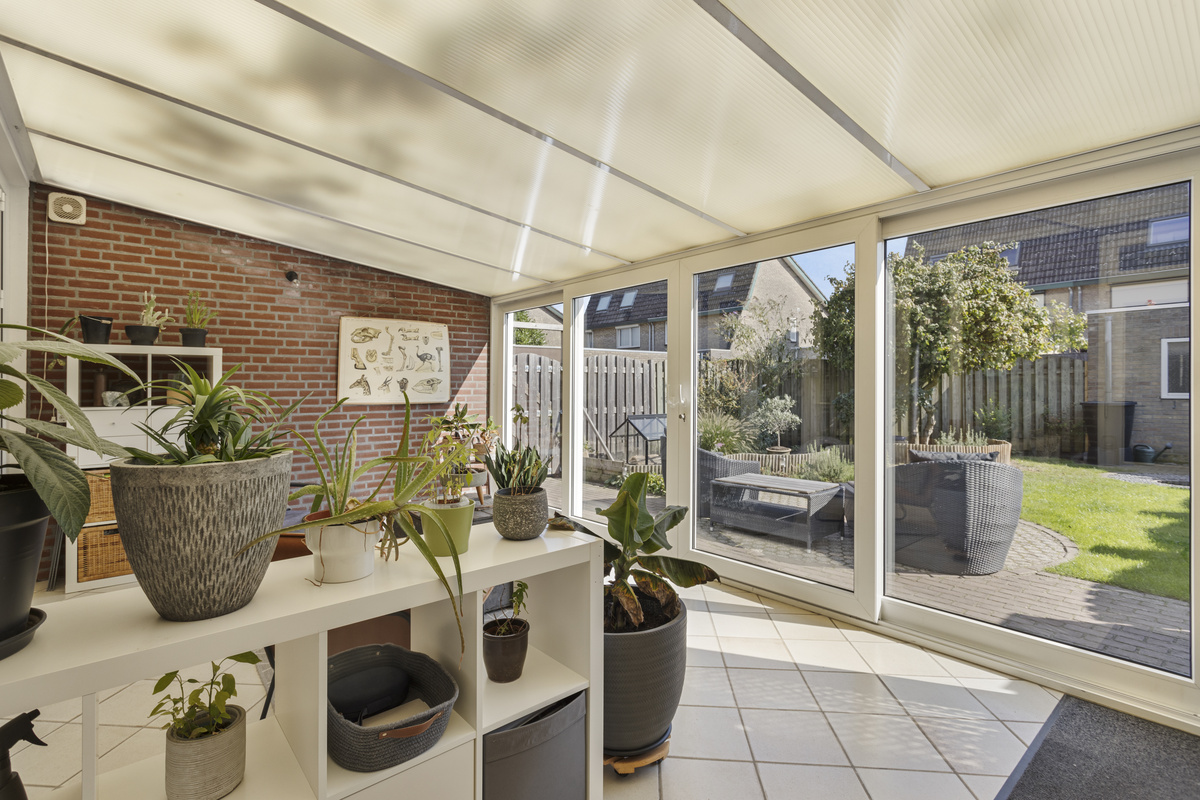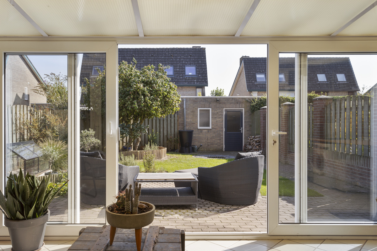 De openslaande terrasdeuren bieden toegang tot de serre. Deze serre heeft een tegelvloer met vloerverwarming en zowel schuifdeuren als een loopdeur naar de tuin.