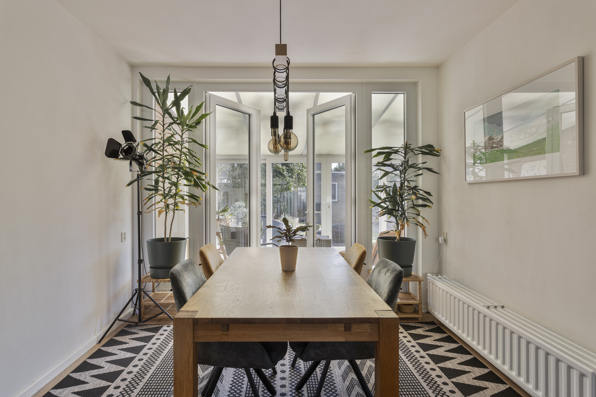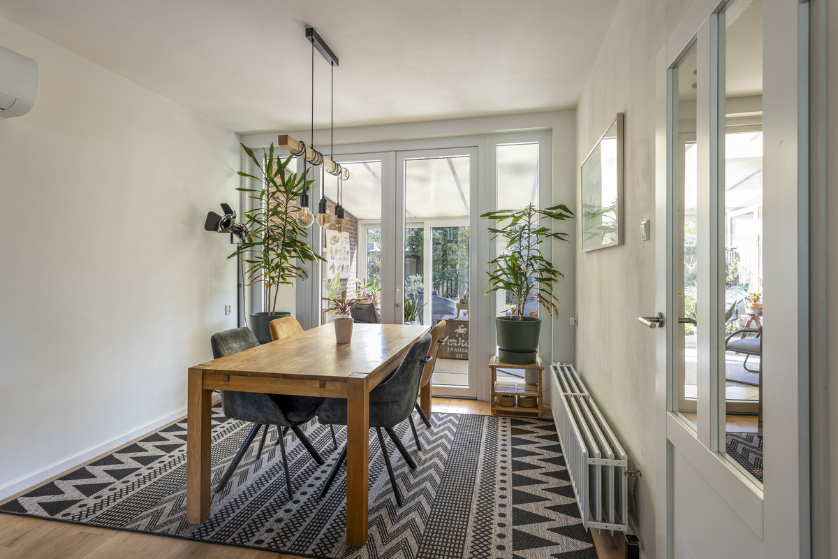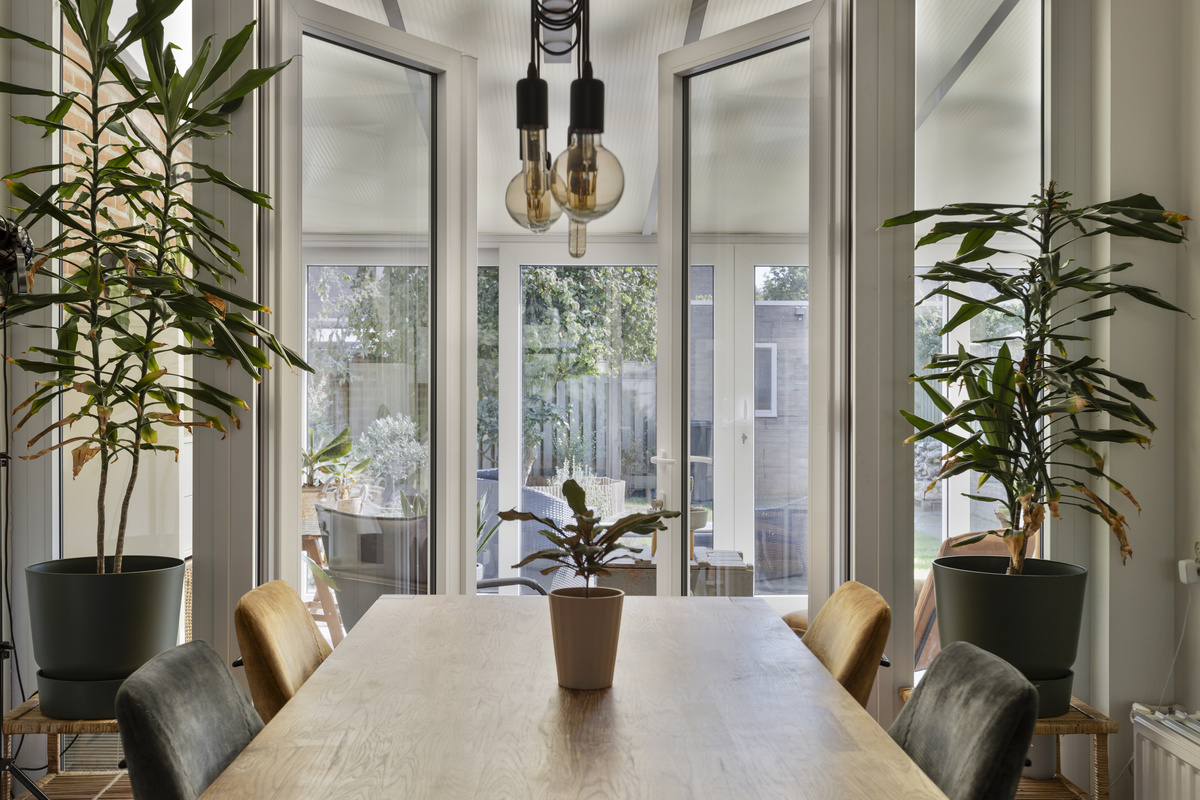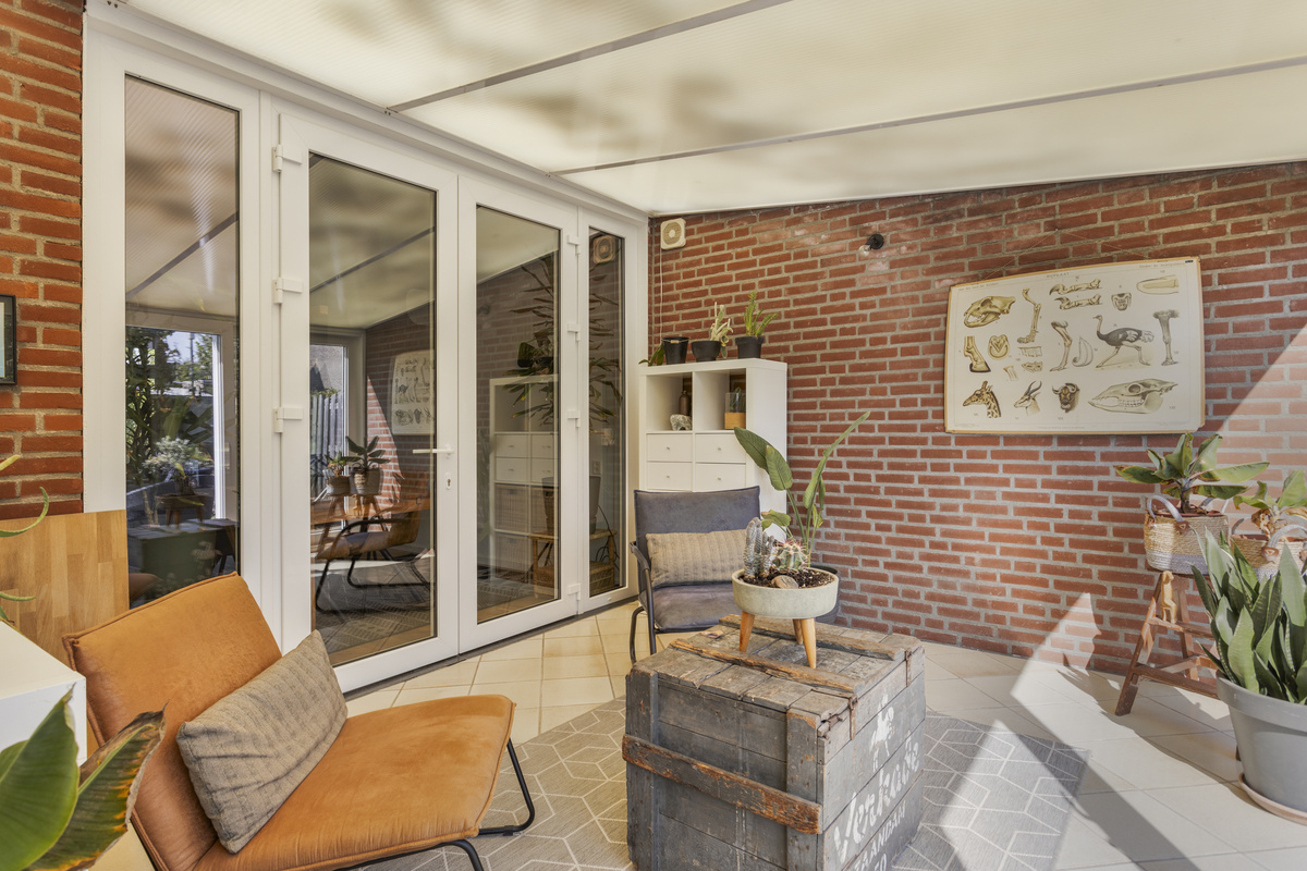 De openslaande terrasdeuren bieden toegang tot de serre. Deze serre heeft een tegelvloer met vloerverwarming en zowel schuifdeuren als een loopdeur naar de tuin.