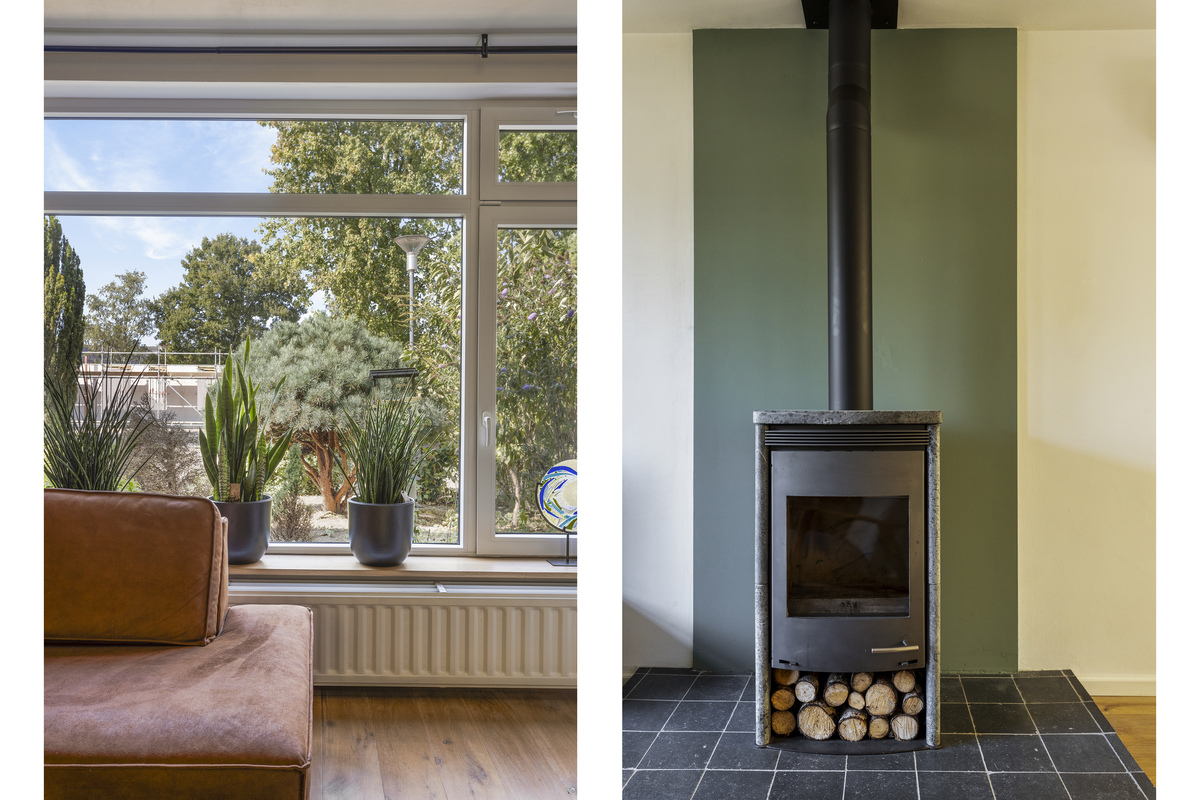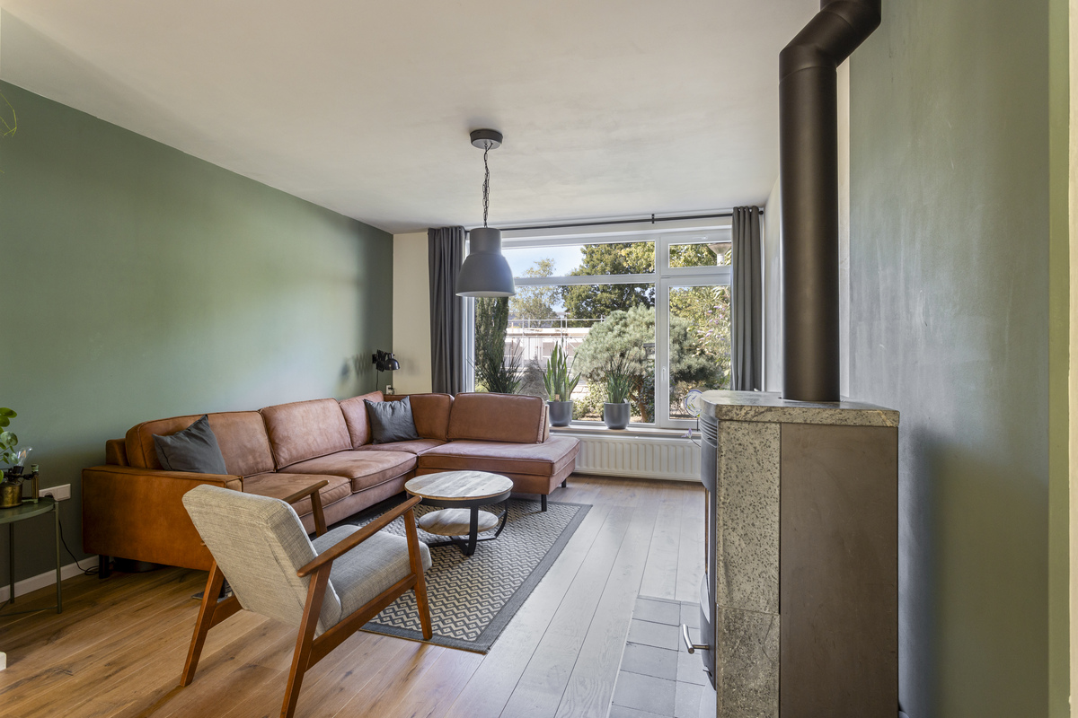 De ruime woonkamer met parketvloer (toplaag van massief eiken) heeft een sfeervolle houtkachel en een airconditioner die ook kan verwarmen.