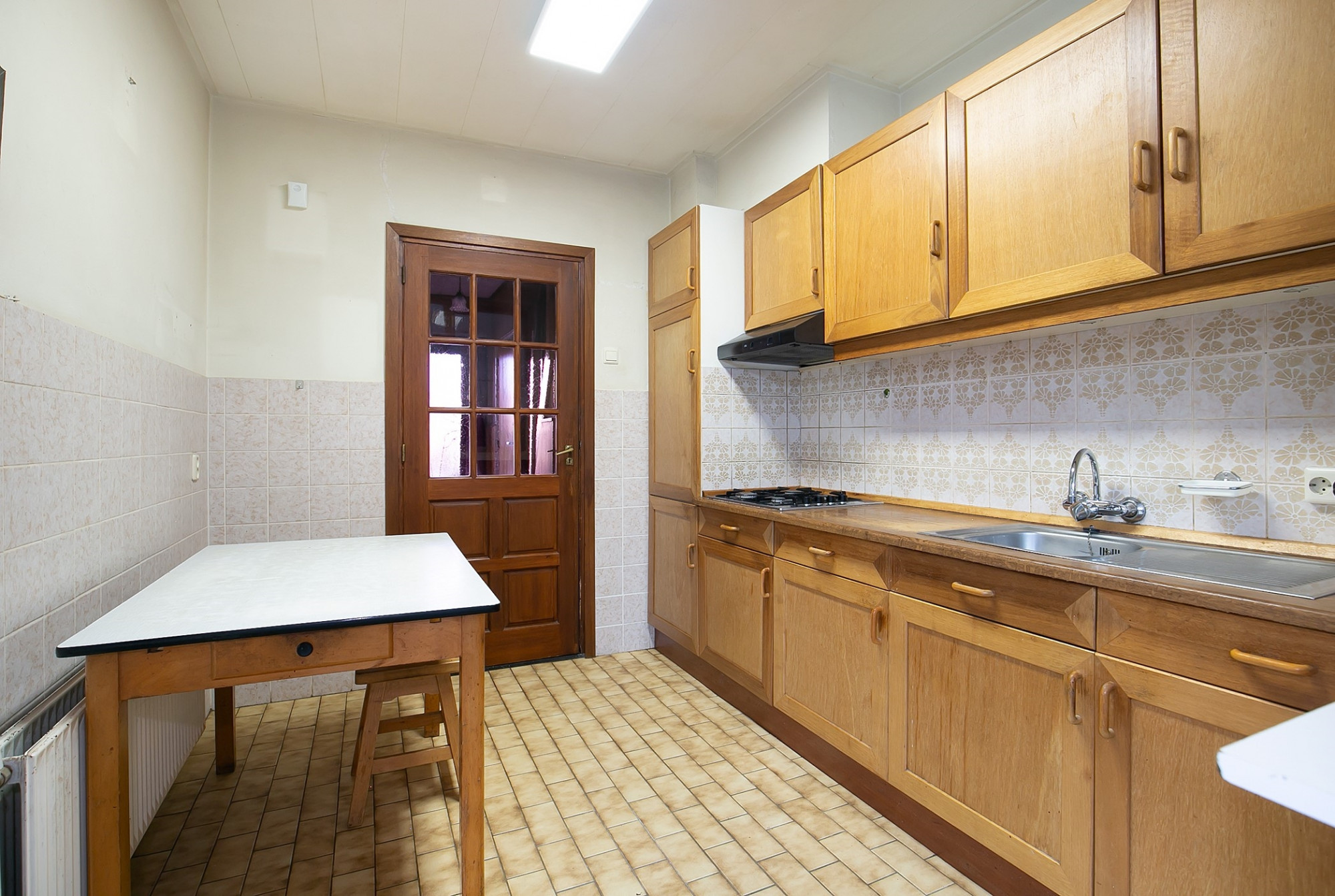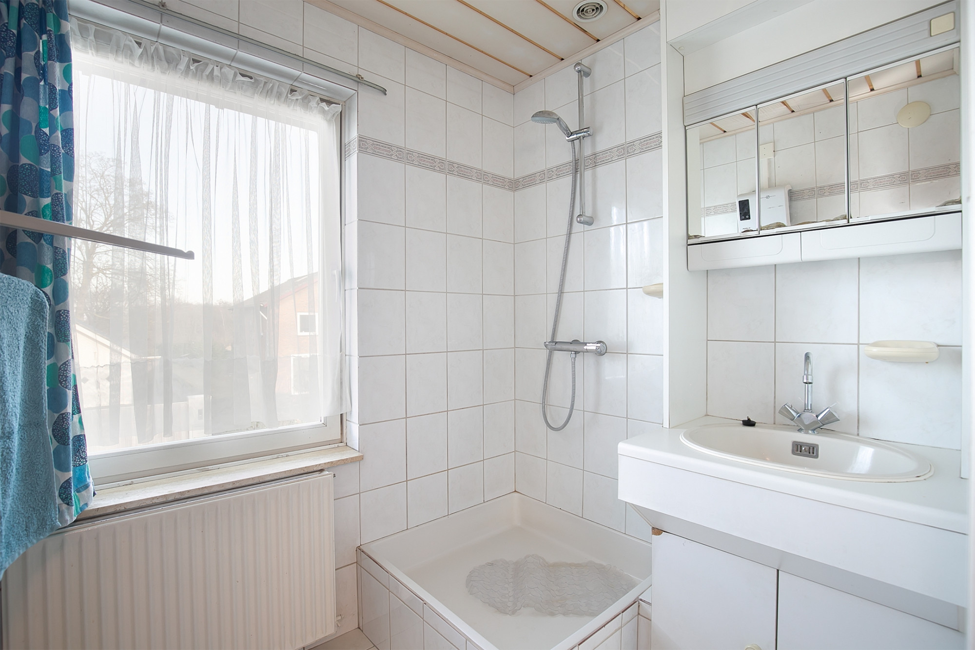 De geheel betegelde badkamer is voorzien van een douche, wastafel met badmeubel en verwarming. Deze ruimte kan vergroot worden door bijvoorbeeld de twee muurkasten van slaapkamer 1 erbij te trekken.