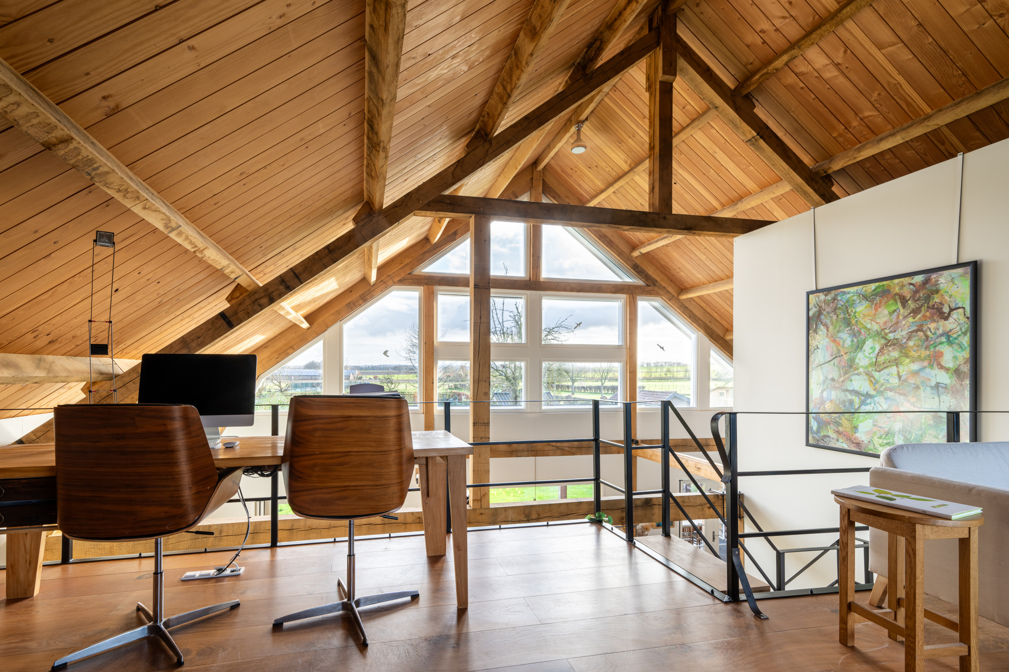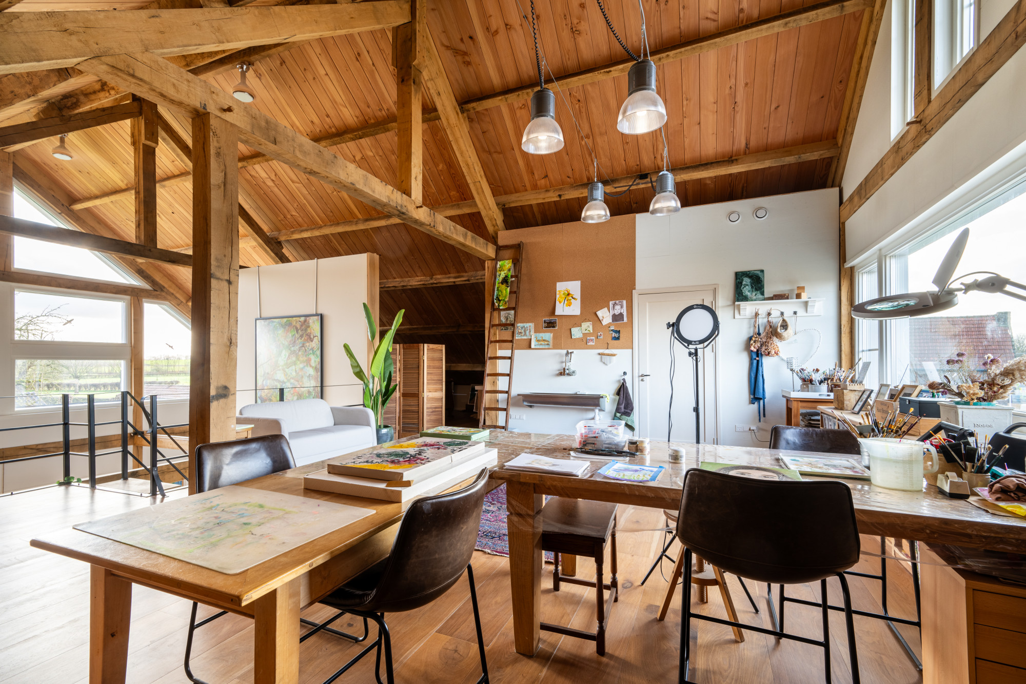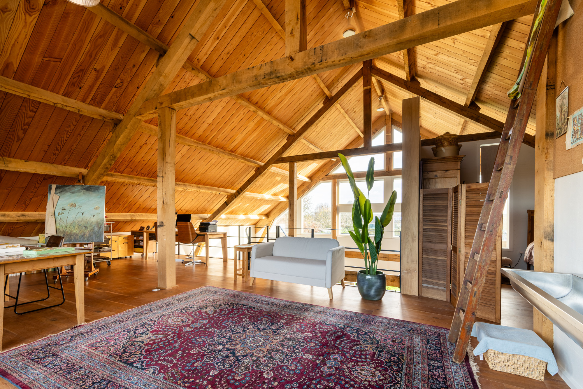 Ruime overloop (8.74 x 7.15 m) voorzien van prachtige massieve eikenvloer en met vide. Deze ruimte wordt nu als atelier gebruikt maar leent zich perfect voor eventuele extra kamers te realiseren indien gewenst.